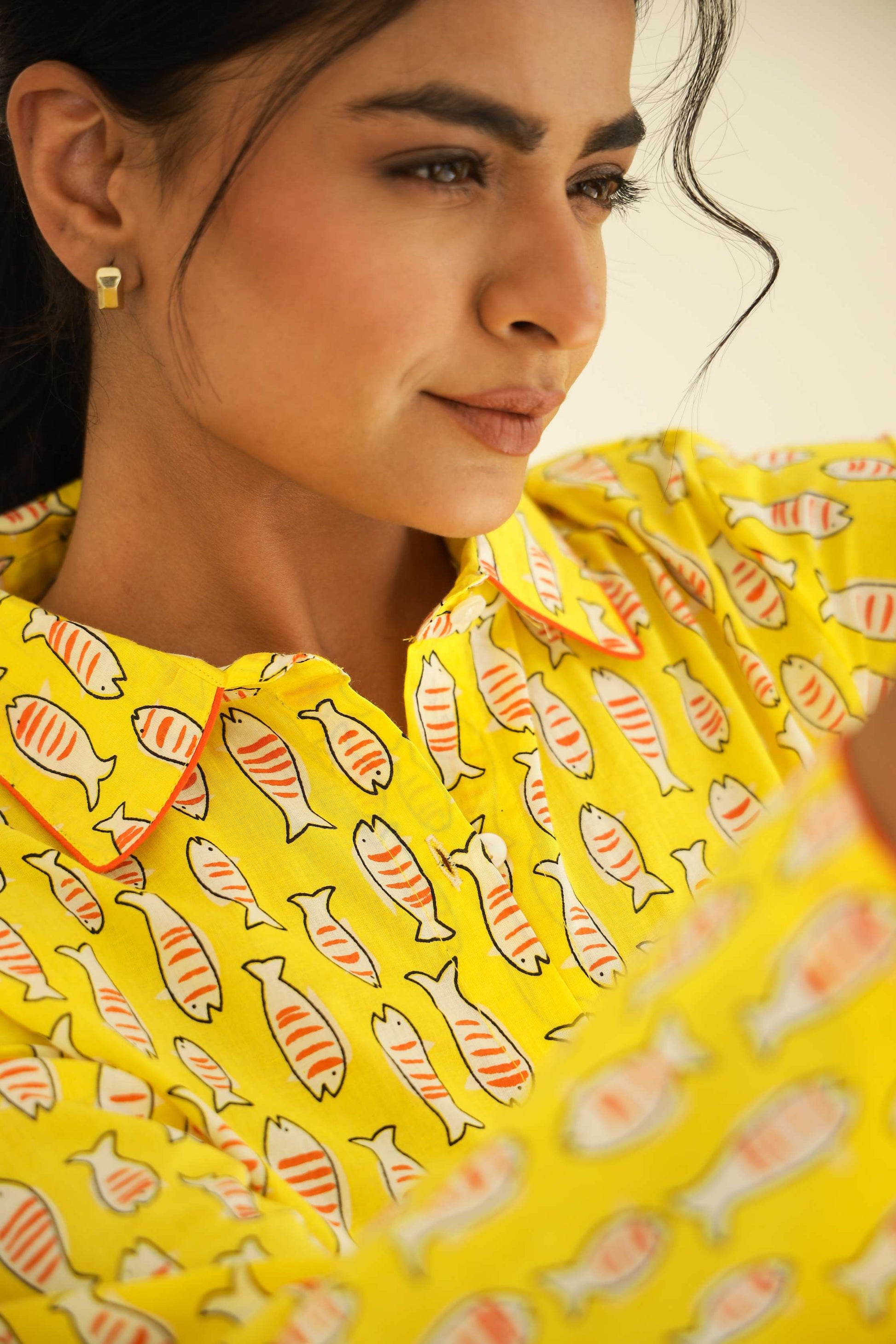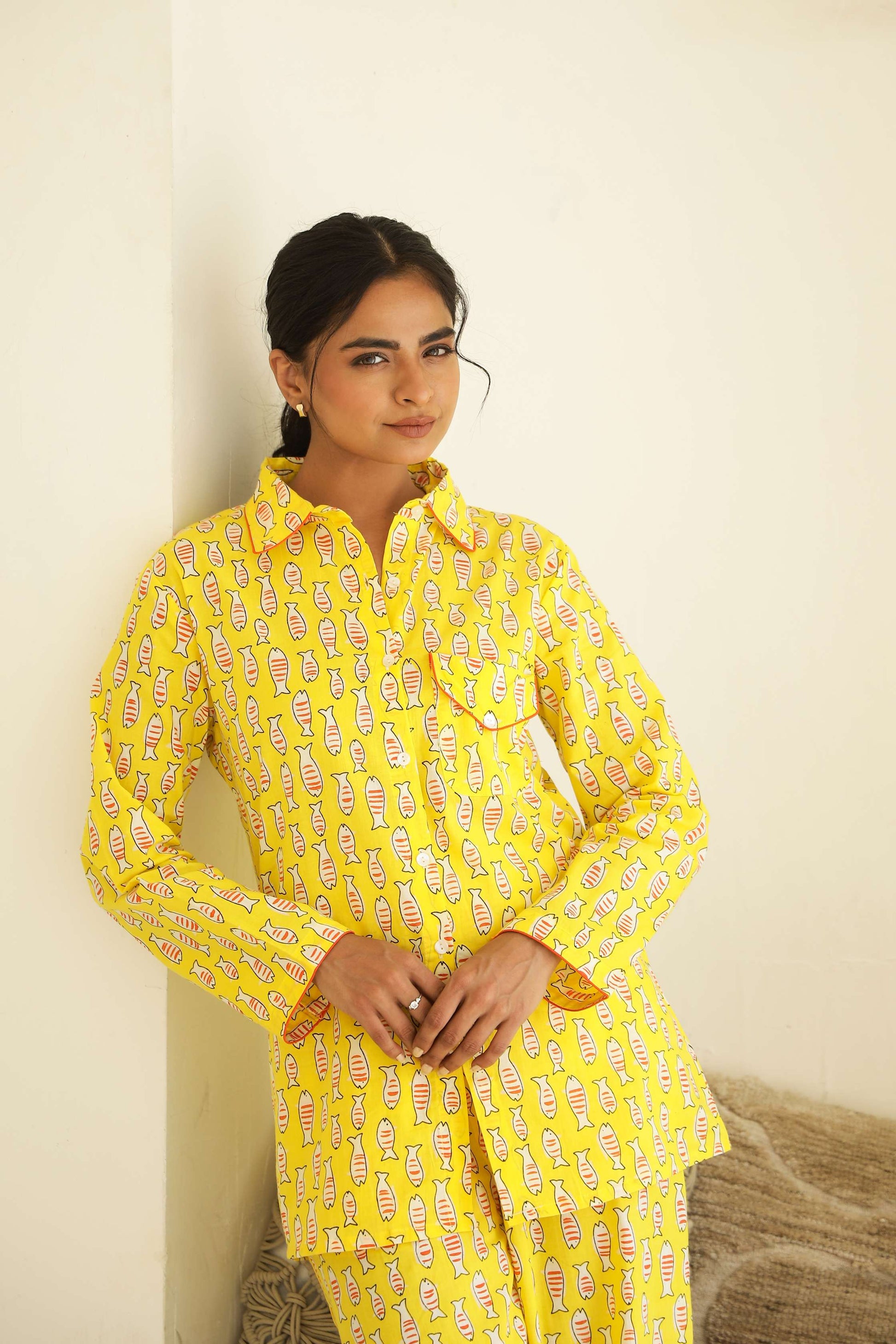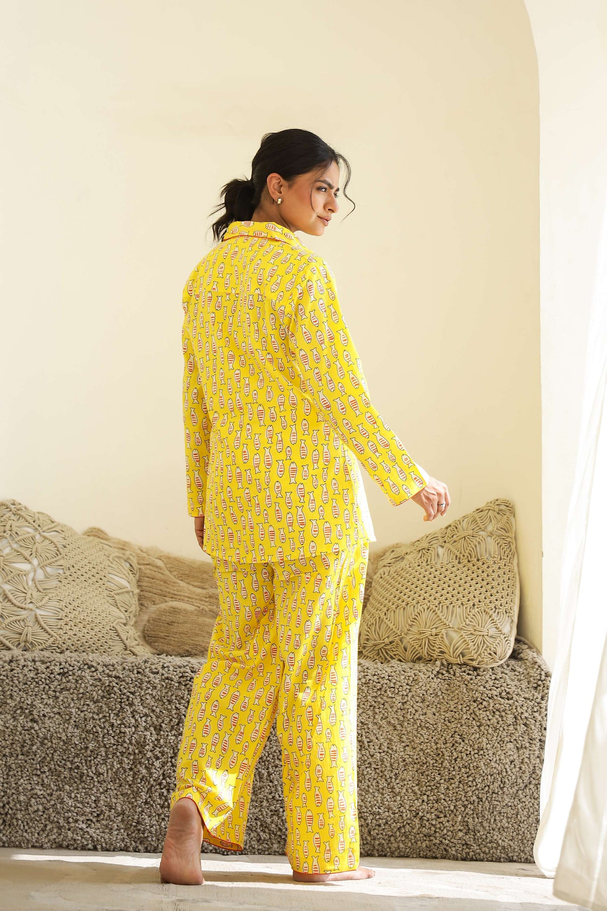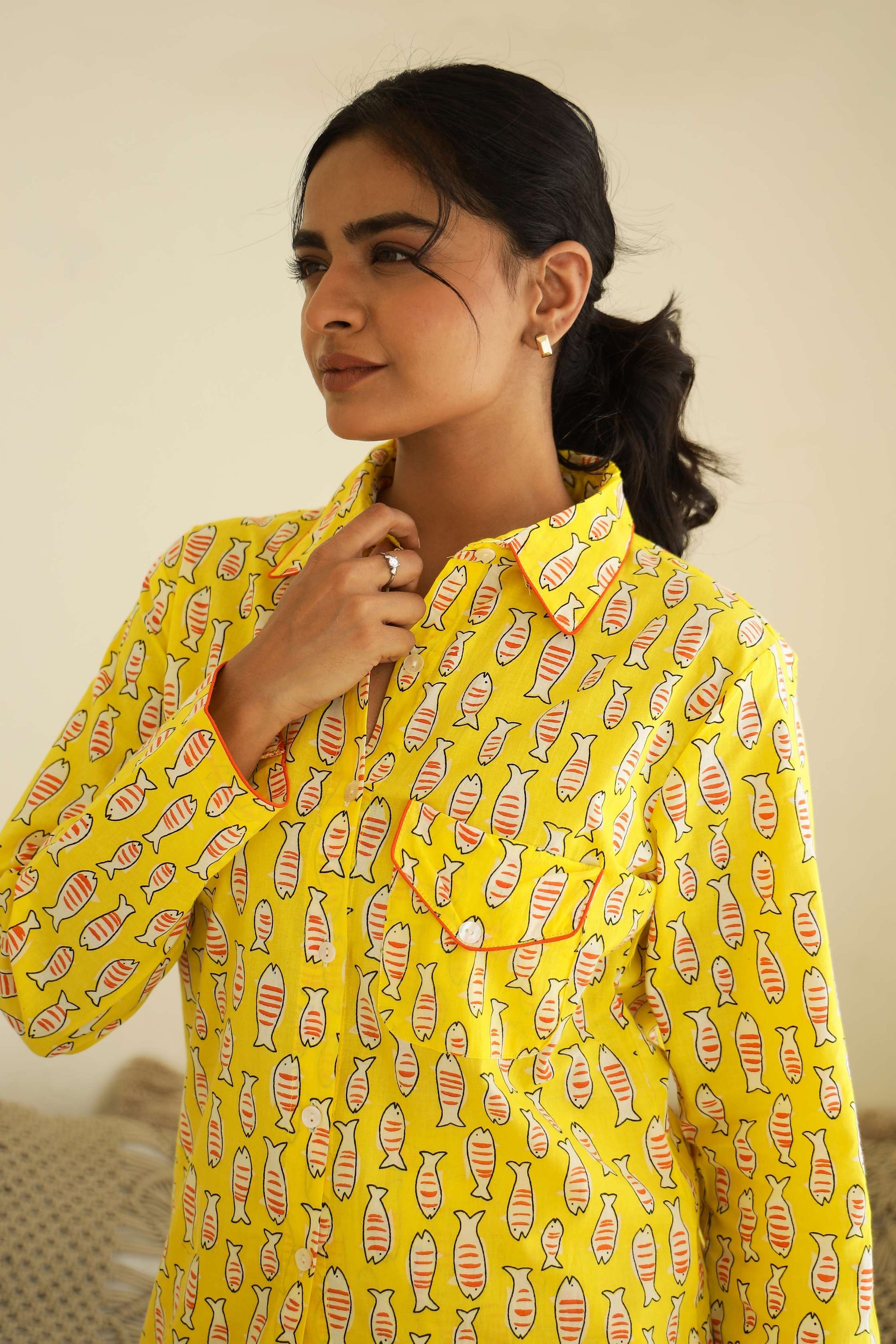 Parrot Green Chirping Birds Collared Cotton Lounge Co-Ord Set with 3 button