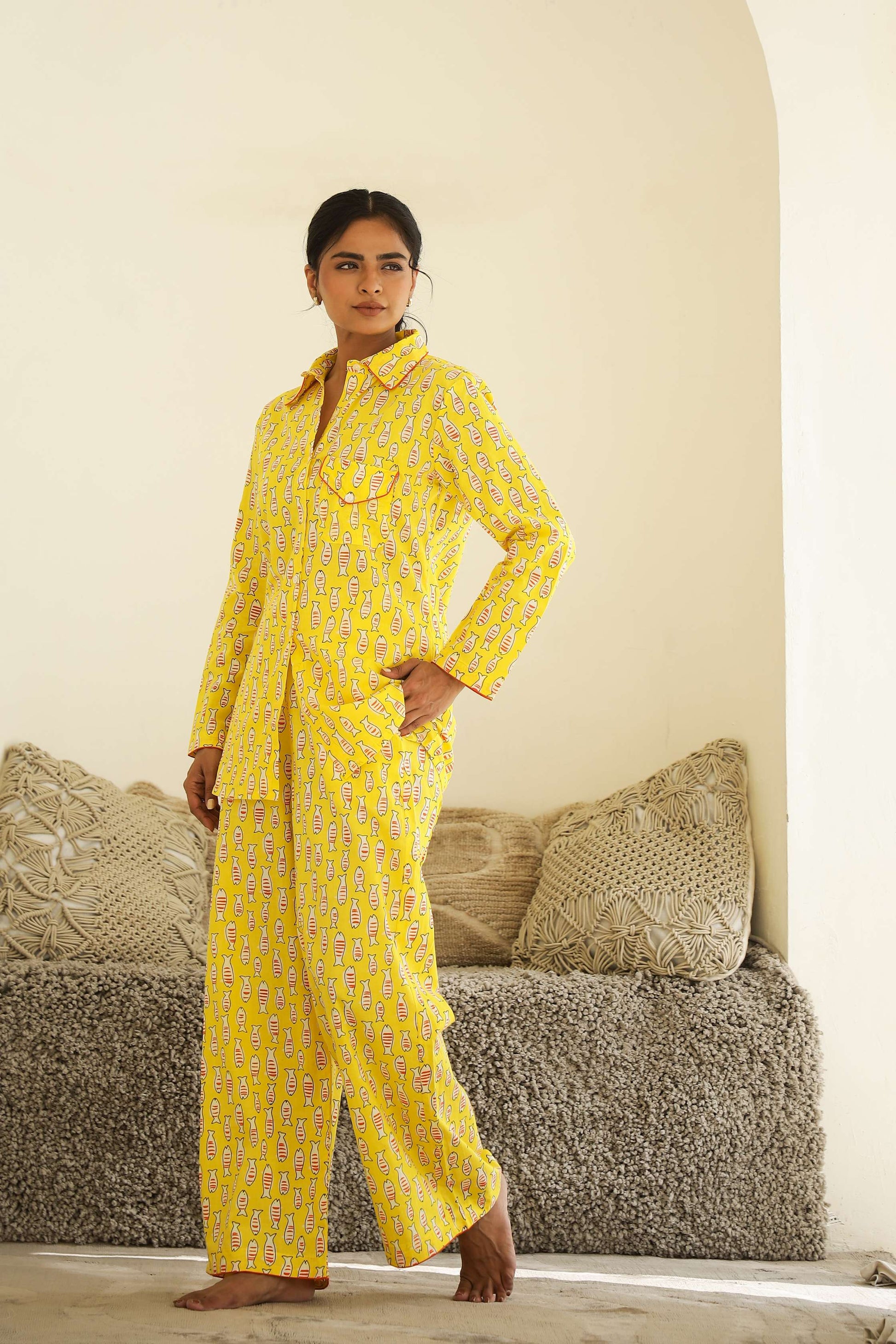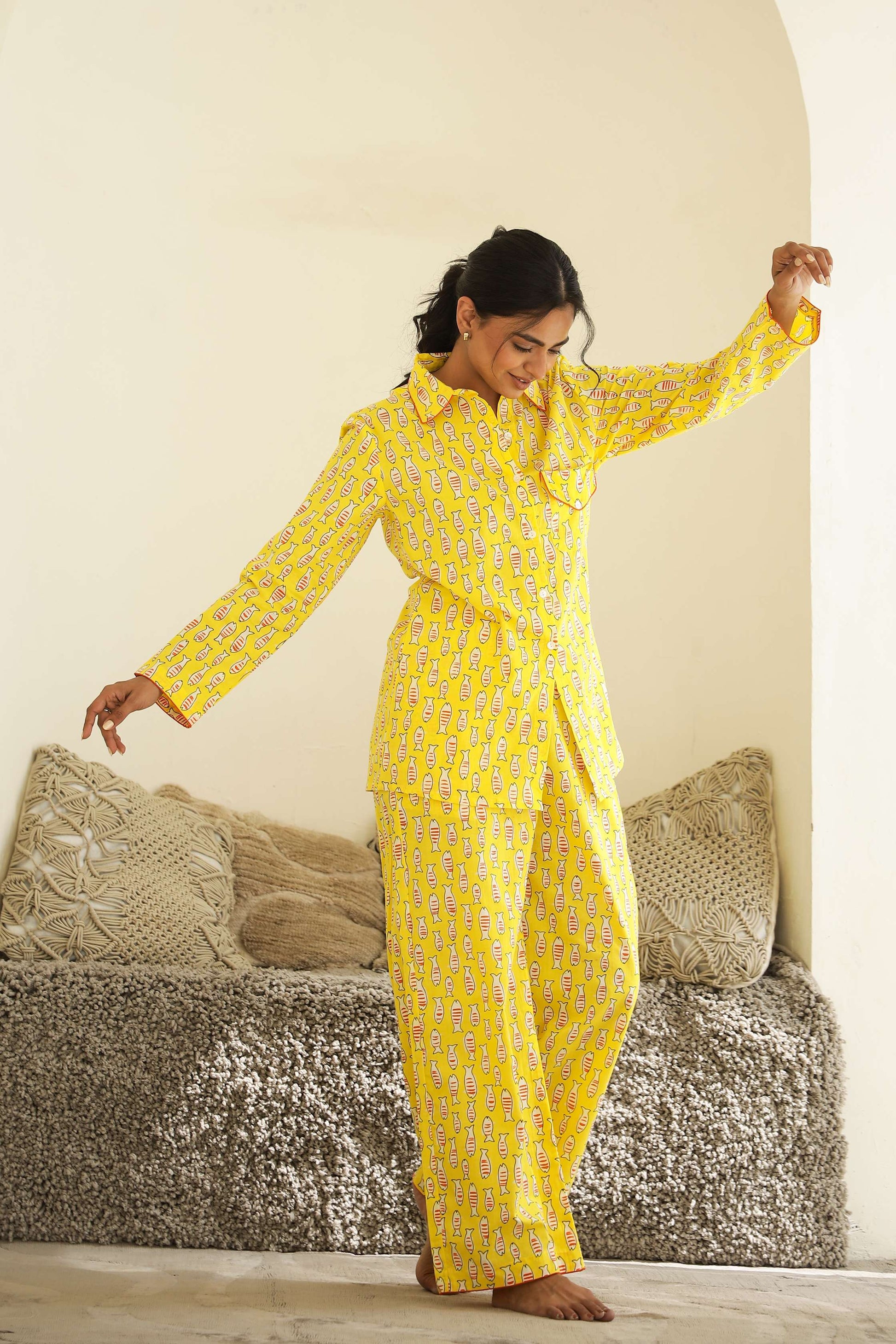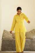 Parrot Green Chirping Birds Collared Cotton Lounge Co-Ord Set with 3 button