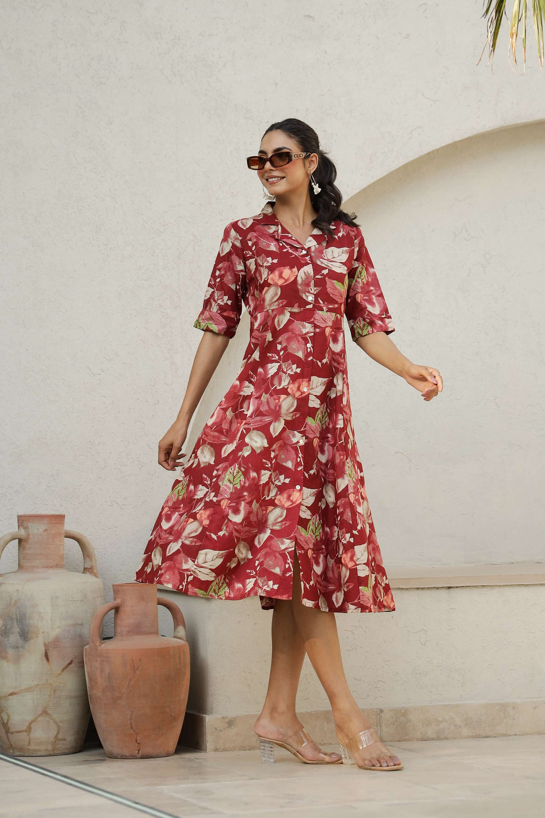 Red Floral Cotton Shirt Dress – Elegant Flared Midi