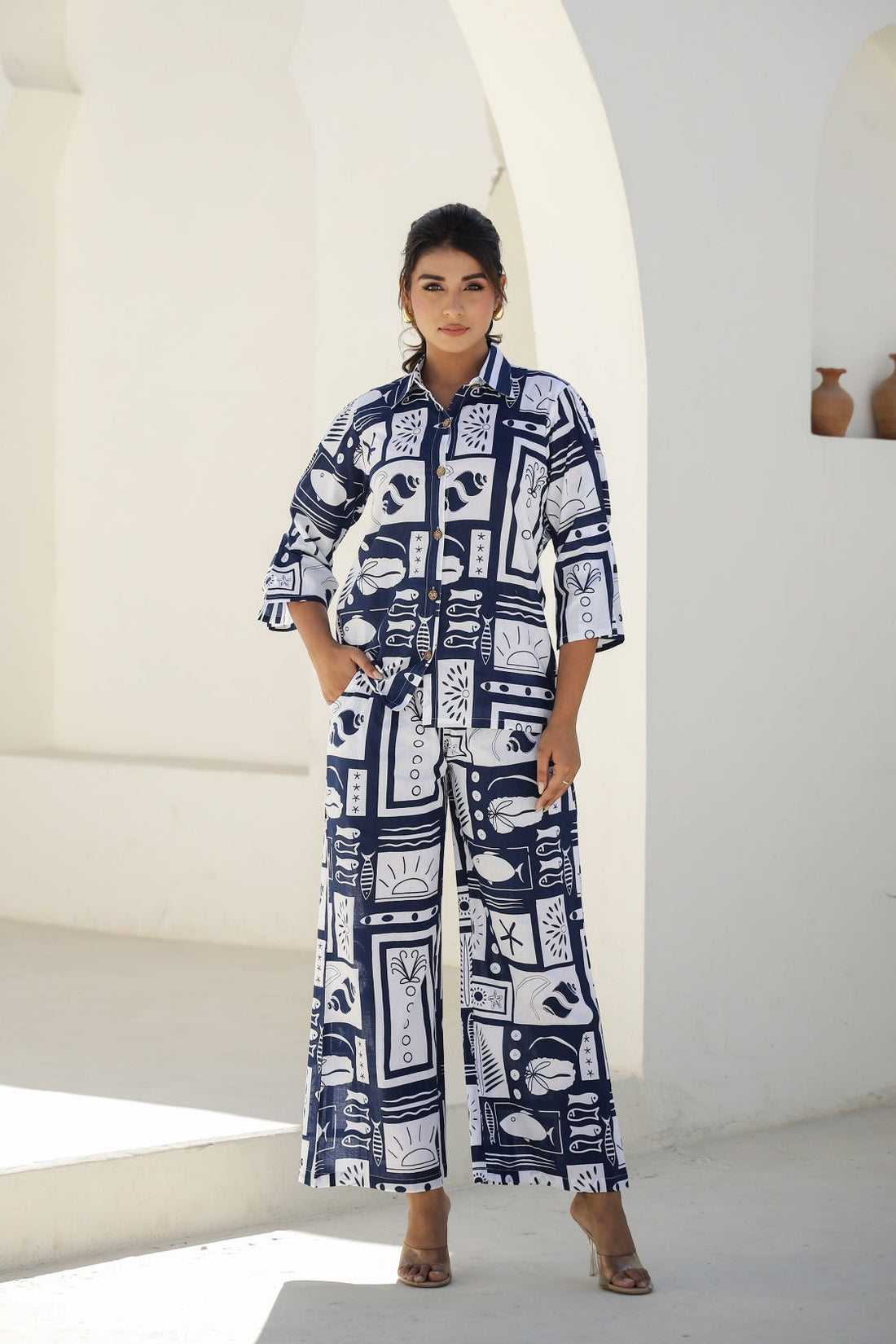 Chic Navy Blue & White Abstract Print Co-Ord Set