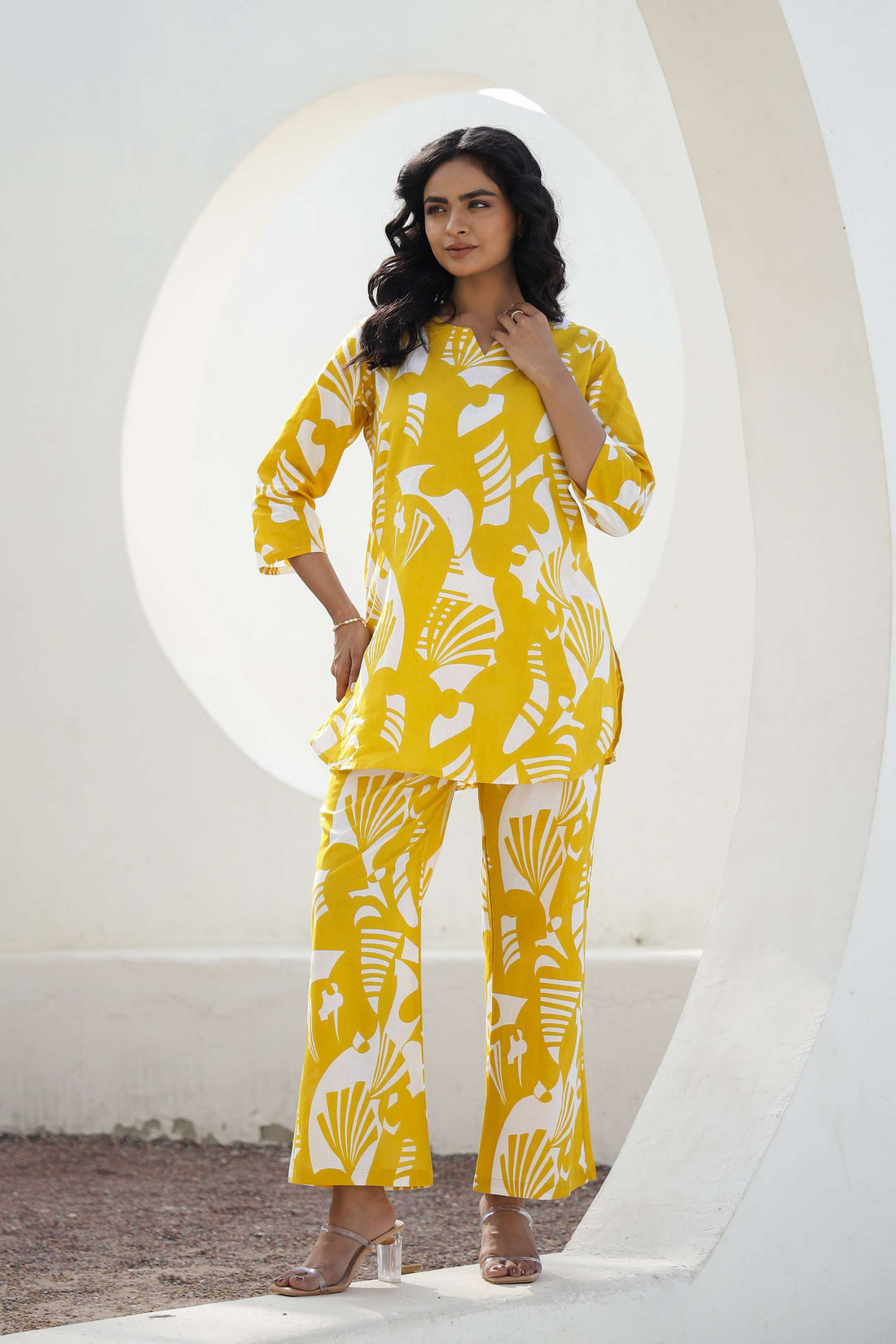 Brighten up your wardrobe with this Sunny Yellow Abstract Cotton Cord Set. Made from soft,...