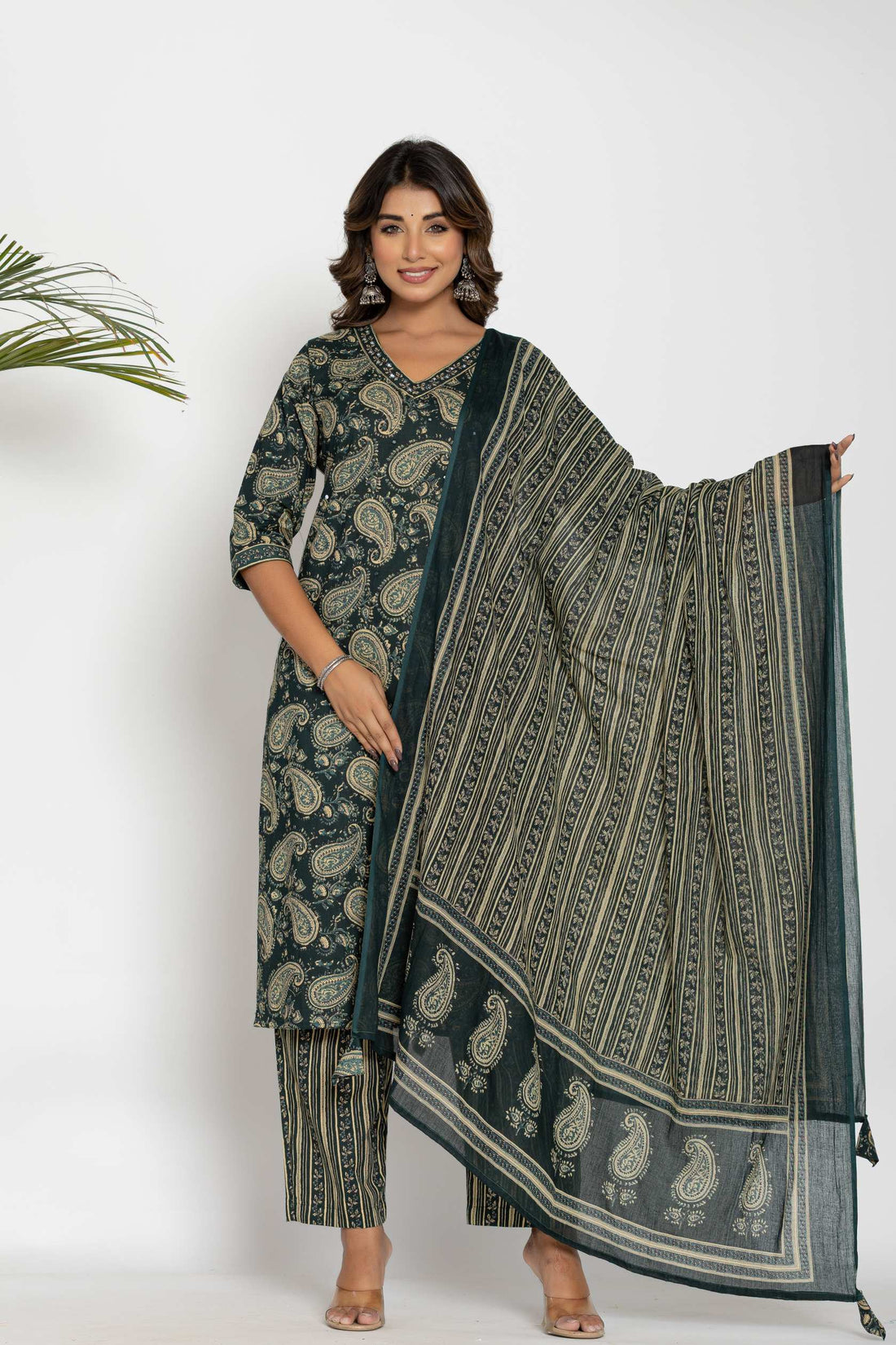 Black & Beige Paisley Printed Cotton Suit Set - Kurti, Pant & Dupatta