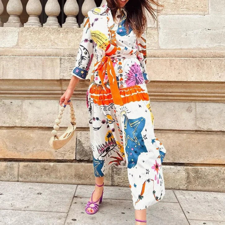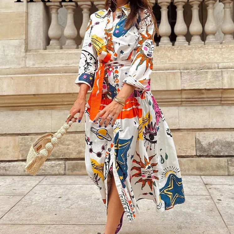 Unleash your inner bohemian with the Abilene Printed Dress. This Long Midi dress features a waist belt and a stunning bohemian print, making it a show-stopper for any occasion. Made of a cotton blend, the loose fit and midi length guarantee comfort and style all year round. Perfect for day events, evening gatherings, and vacation looks.