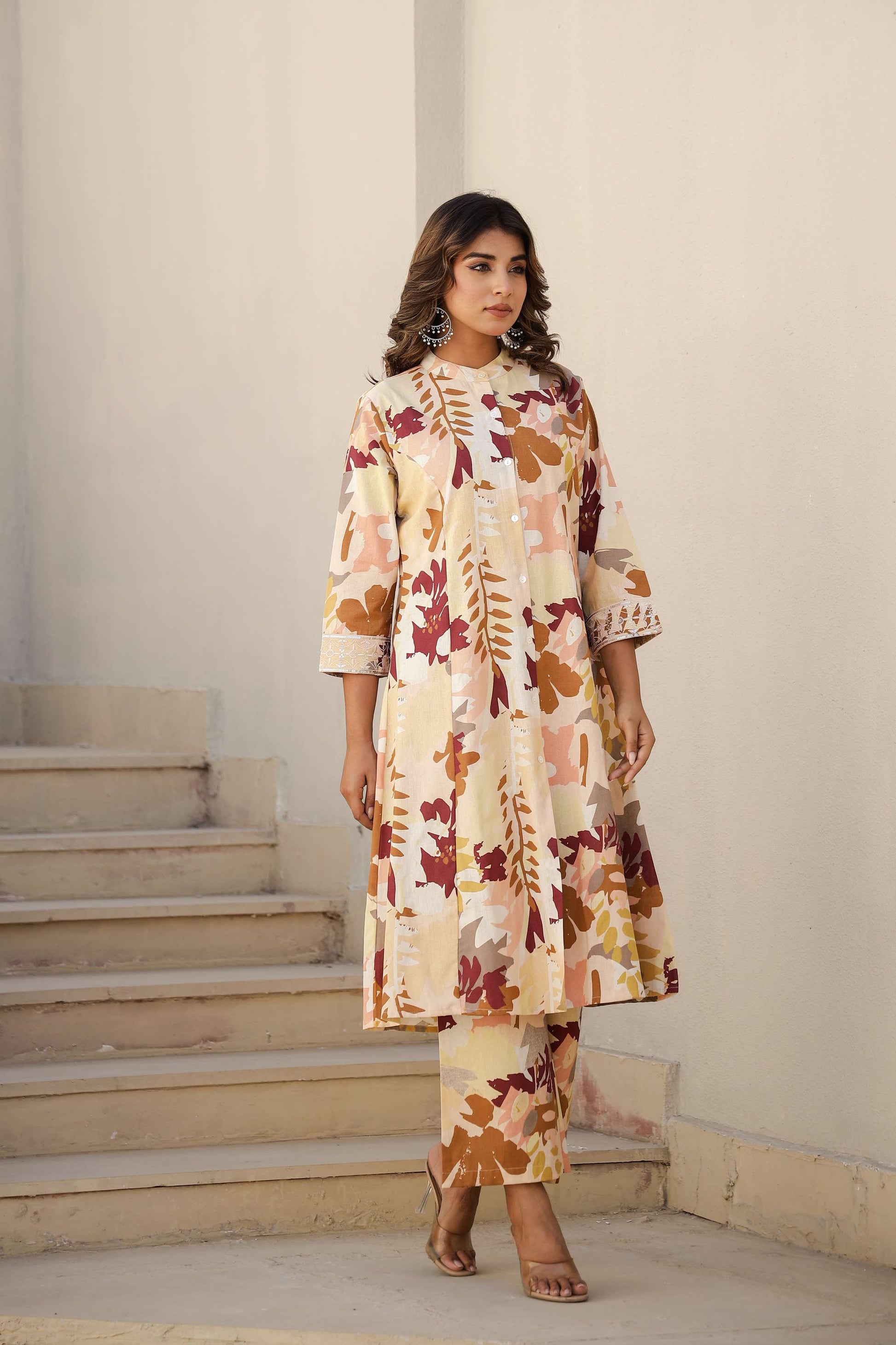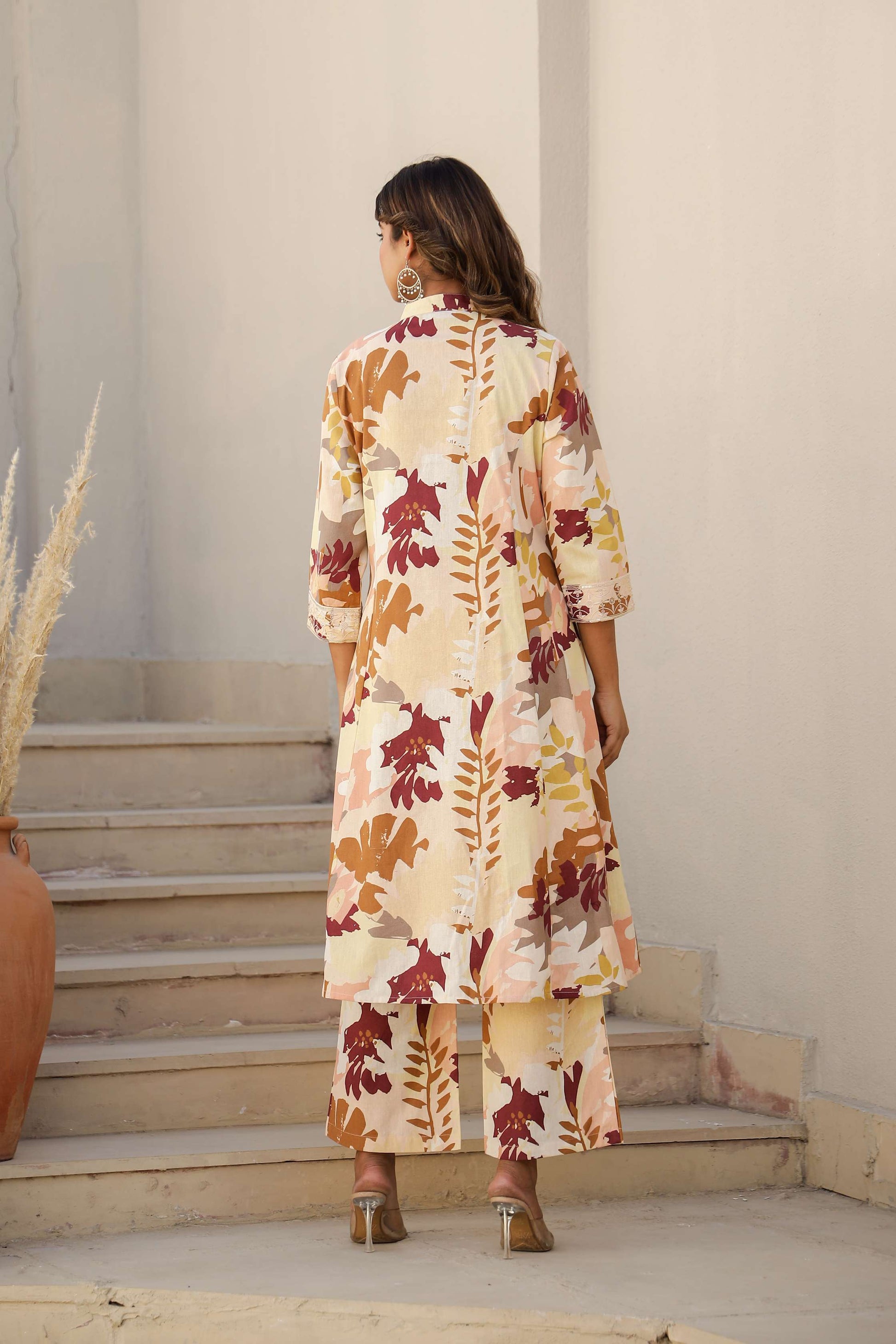 Cotton Flax A-Line Kurta Set with Handcrafted Detailing – Maroon & Mustard Print
