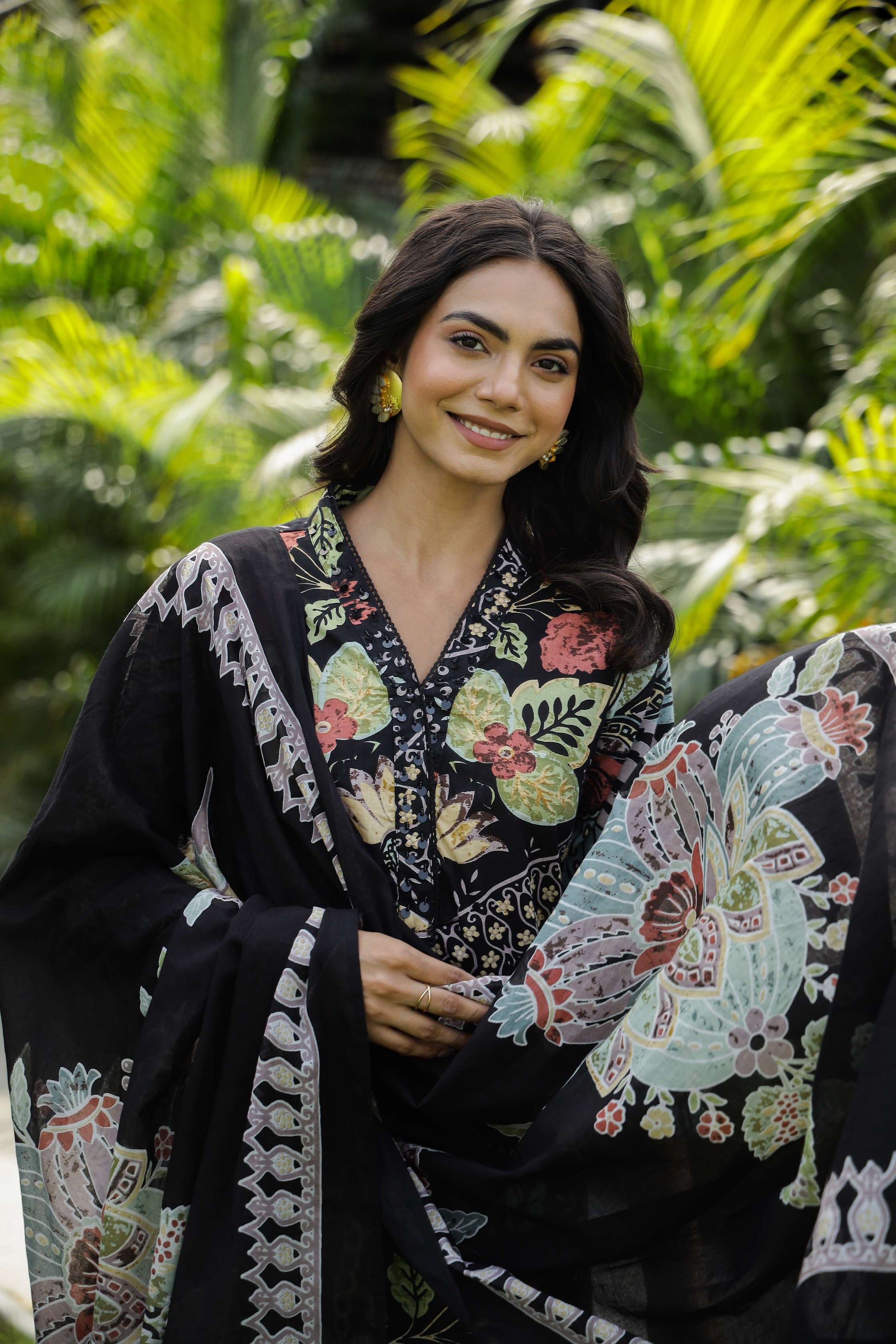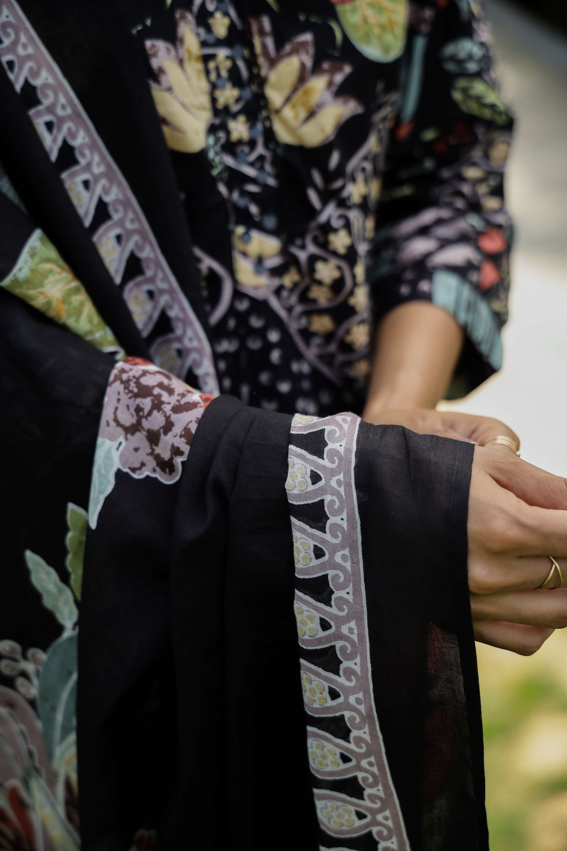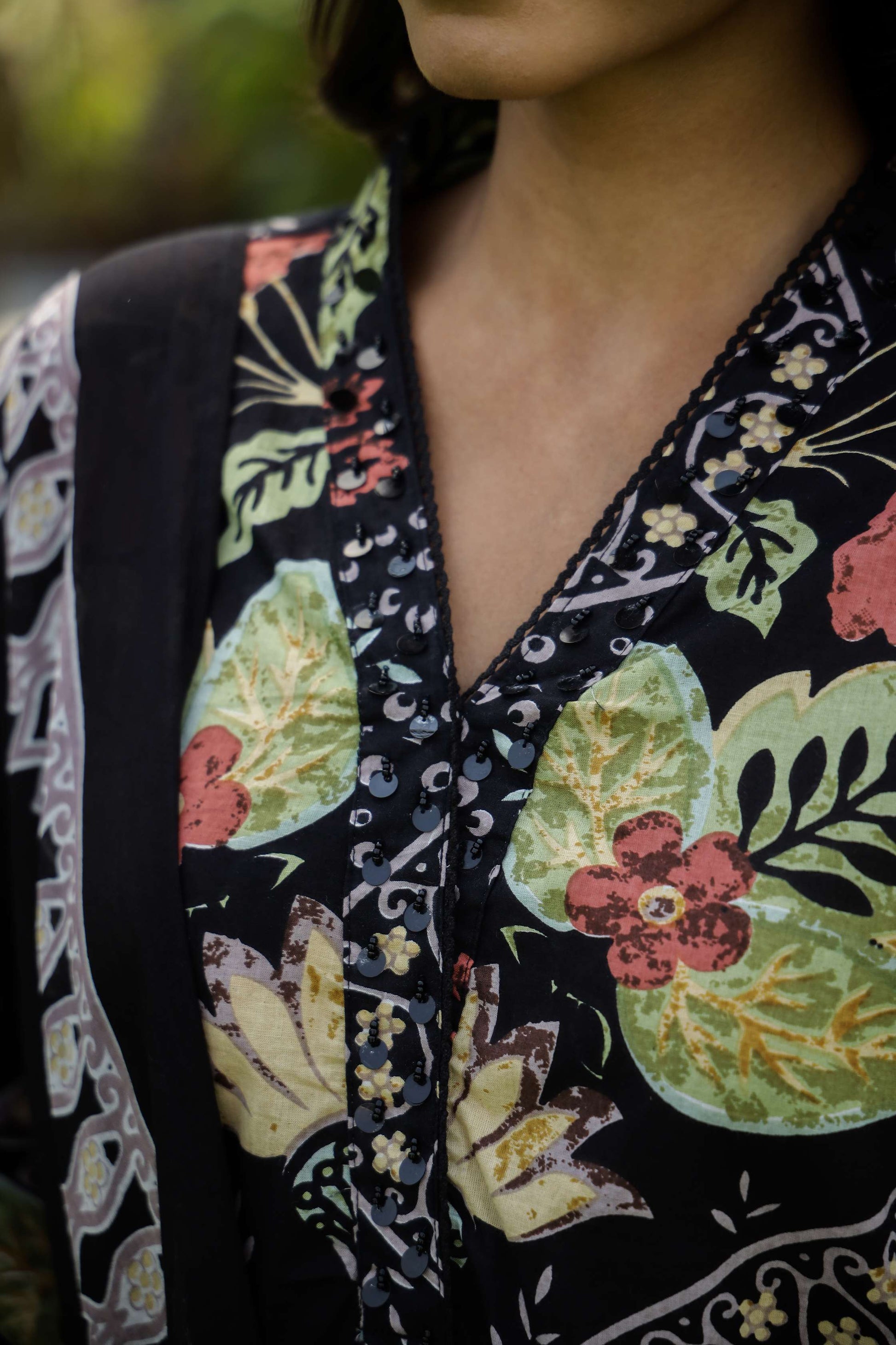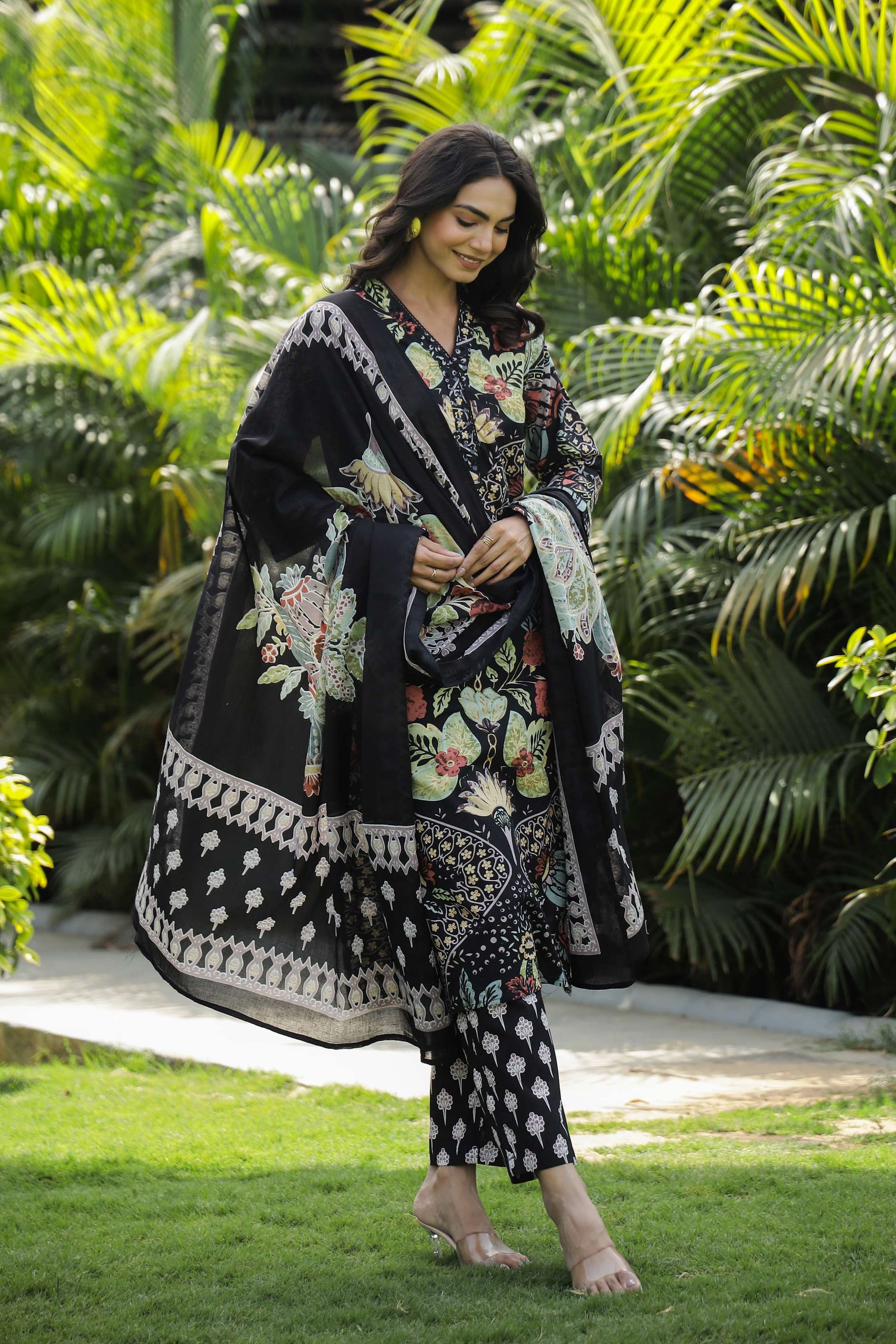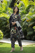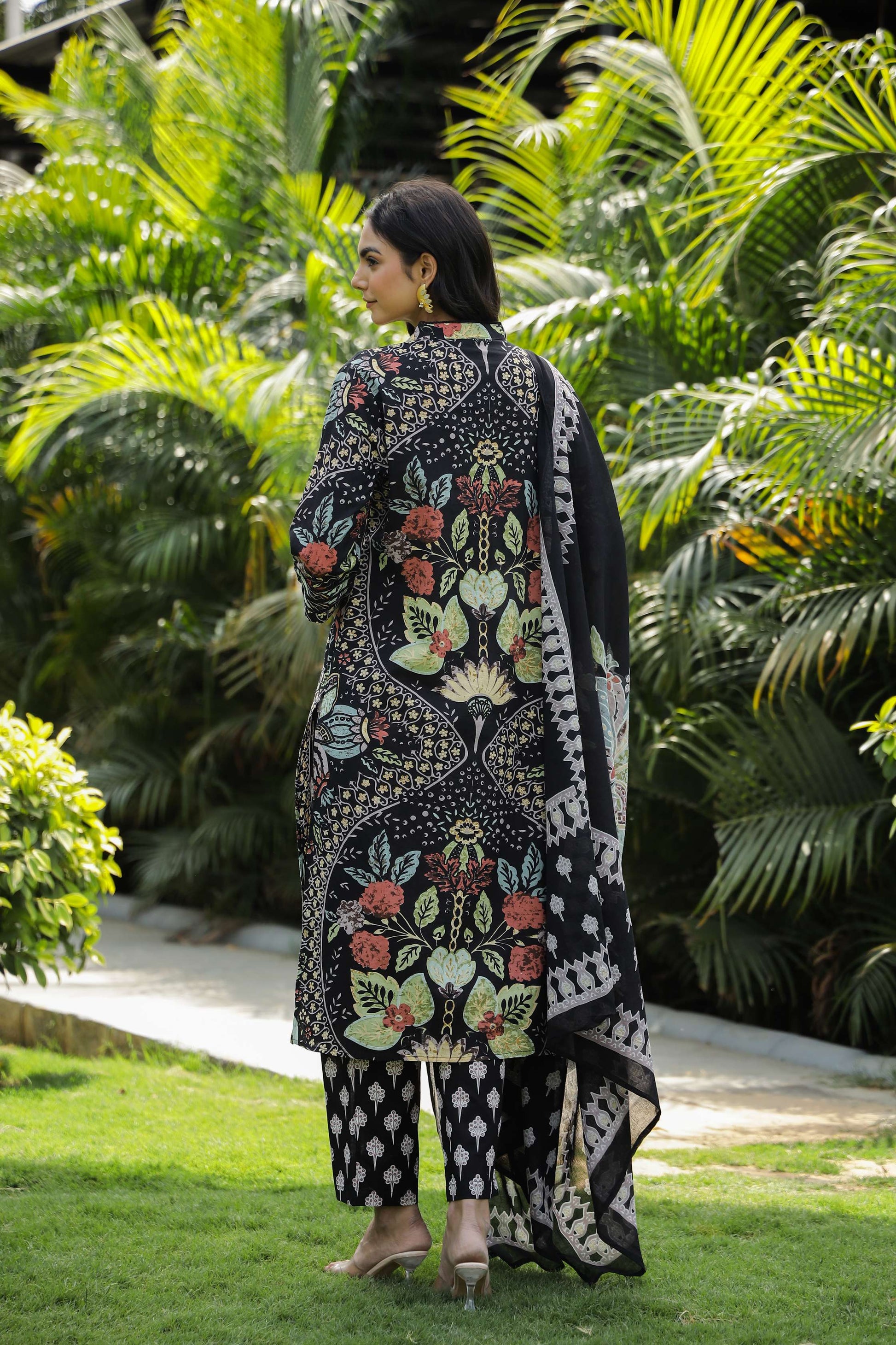 Black Floral Printed Cotton Kurta Set with Dupatta & Pants