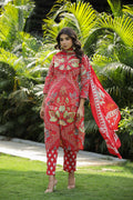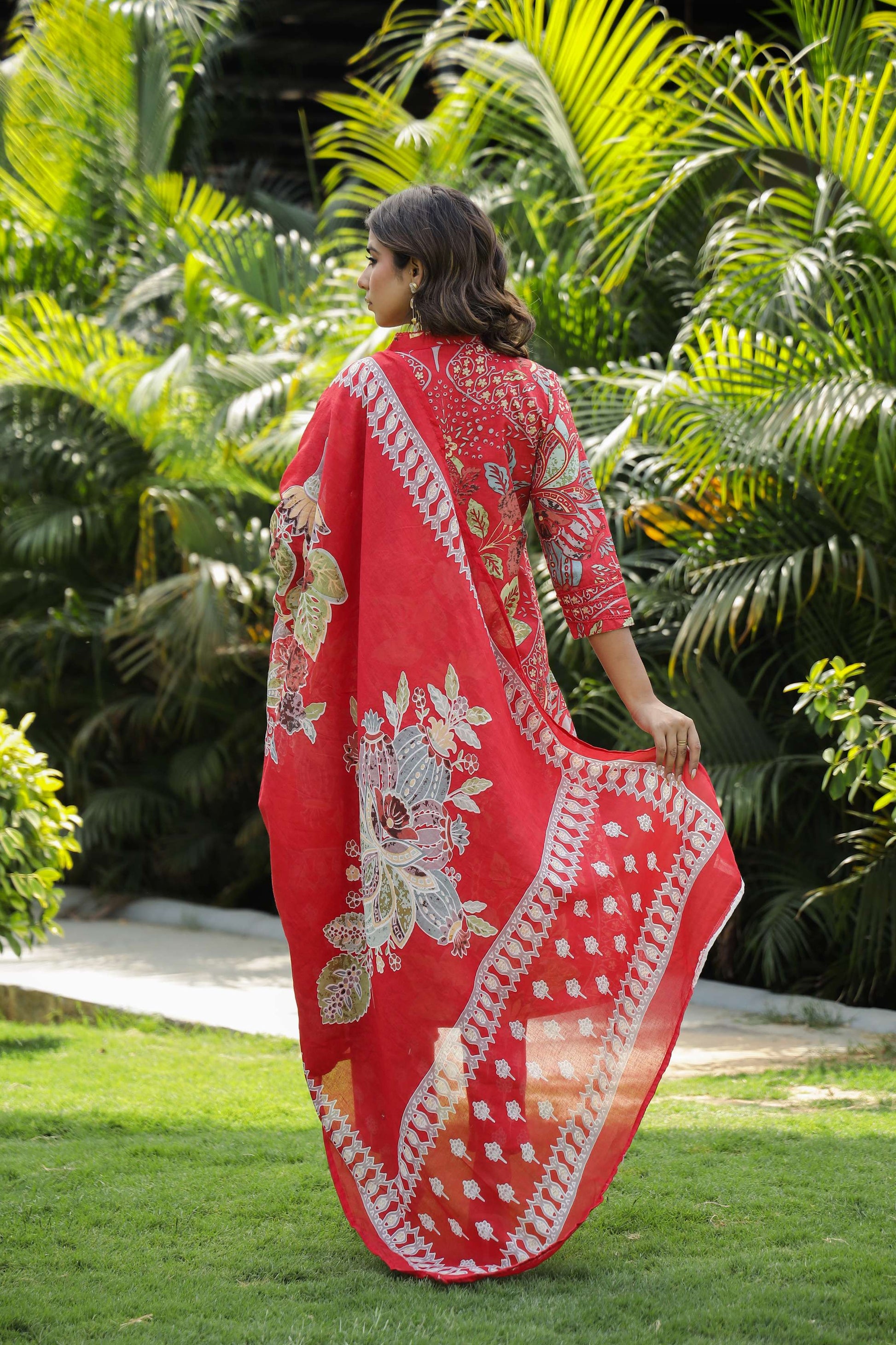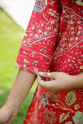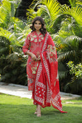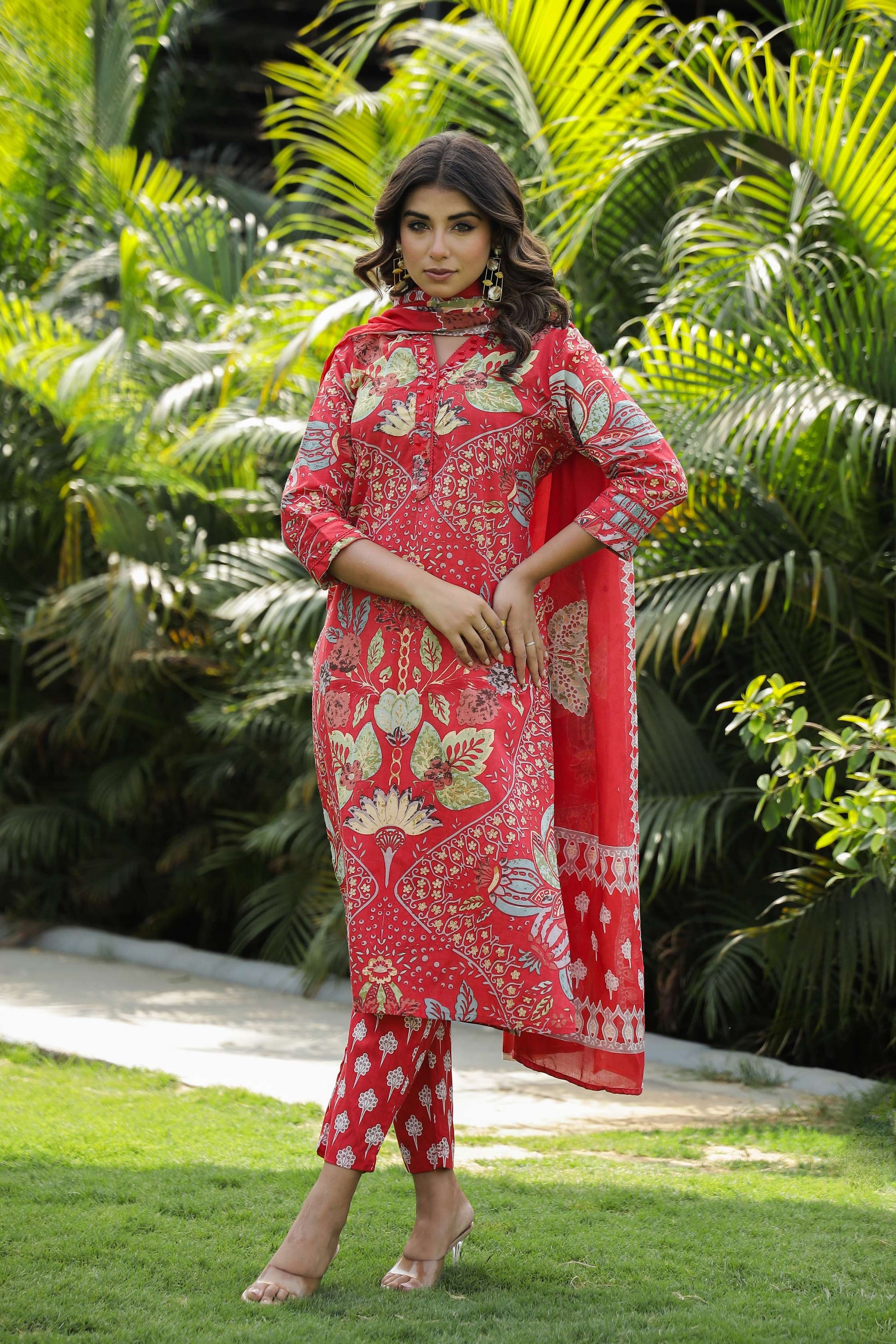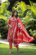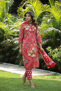 Red Floral Printed Cotton Kurta Set with Dupatta & Pants