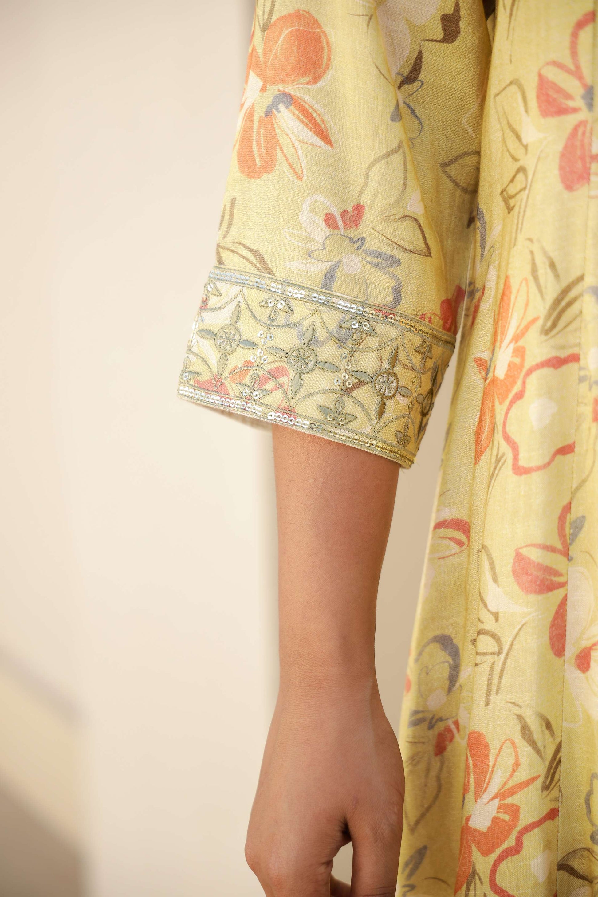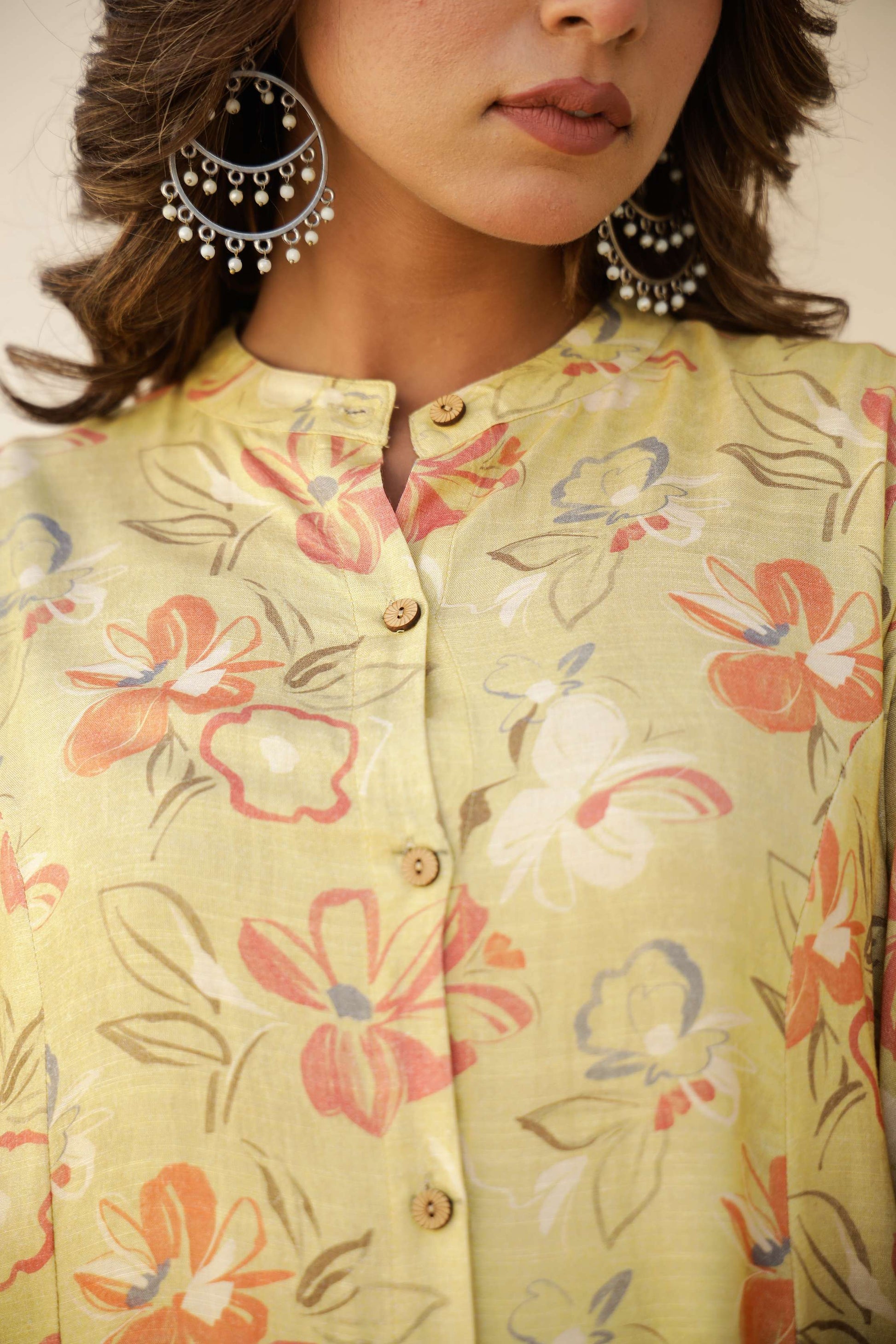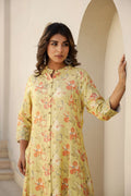 Brighten up your look with this yellow floral printed kurta set. Made from soft cotton, it features a button-down kurta with vibrant floral motifs and matching straight pants. A cheerful outfit for festive occasions, casual gatherings, or office wear.