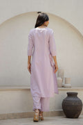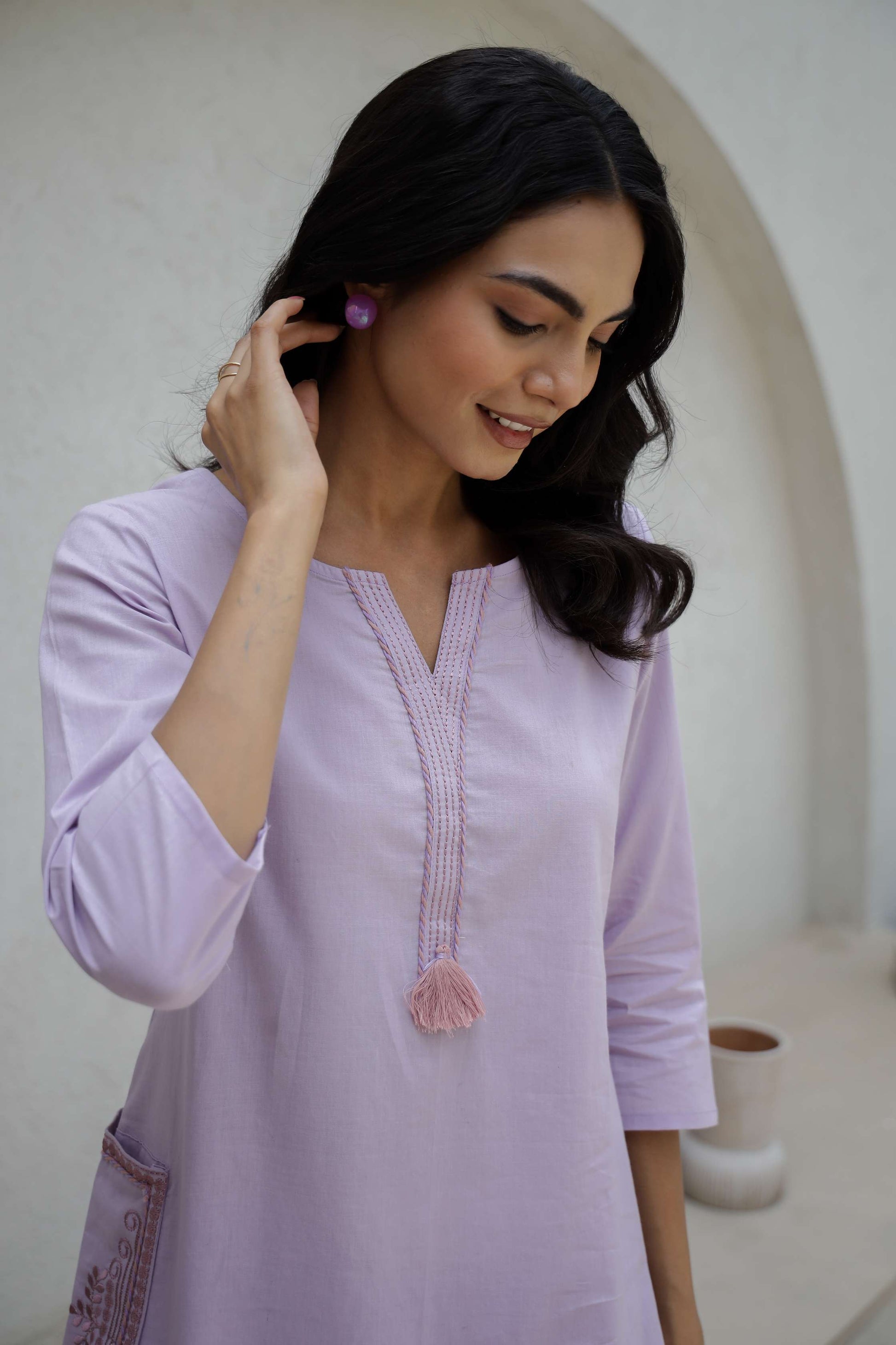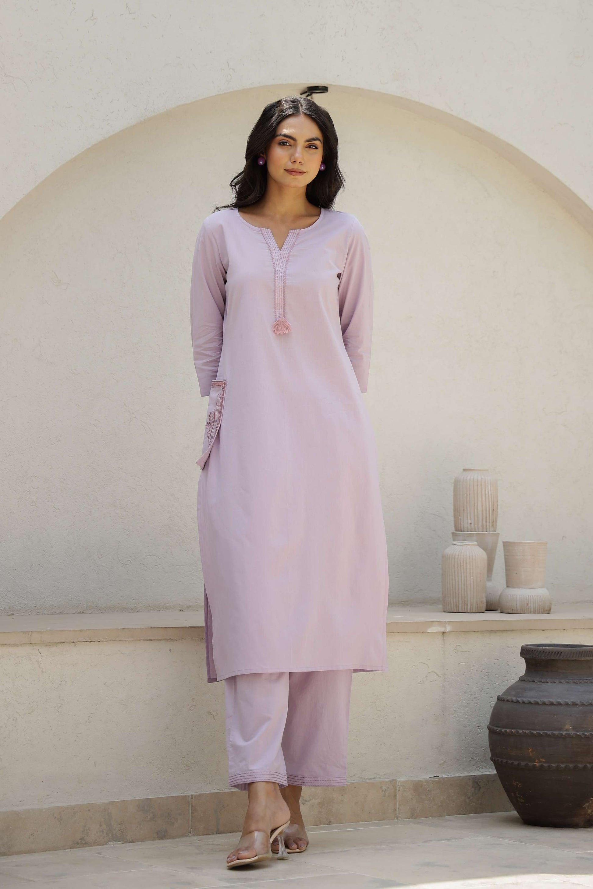 Keep it minimal yet stylish with this purple solid cotton kurta set. Designed with a straight-fit silhouette and a delicate embroidered side pocket, this outfit is perfect for a chic everyday look.