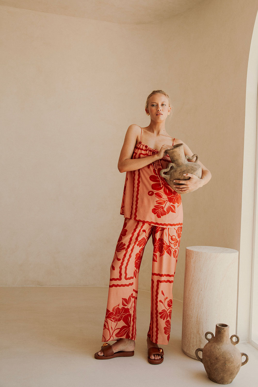 The ultra chic, resort style Alani Top is made from a high quality zipper crepe fabric with our exclusive Fiore Postcards print. It features thin rouleau straps with an adjustable draw tie at centre neckline and a relaxed fit. Get the set with the Alani Pants.
