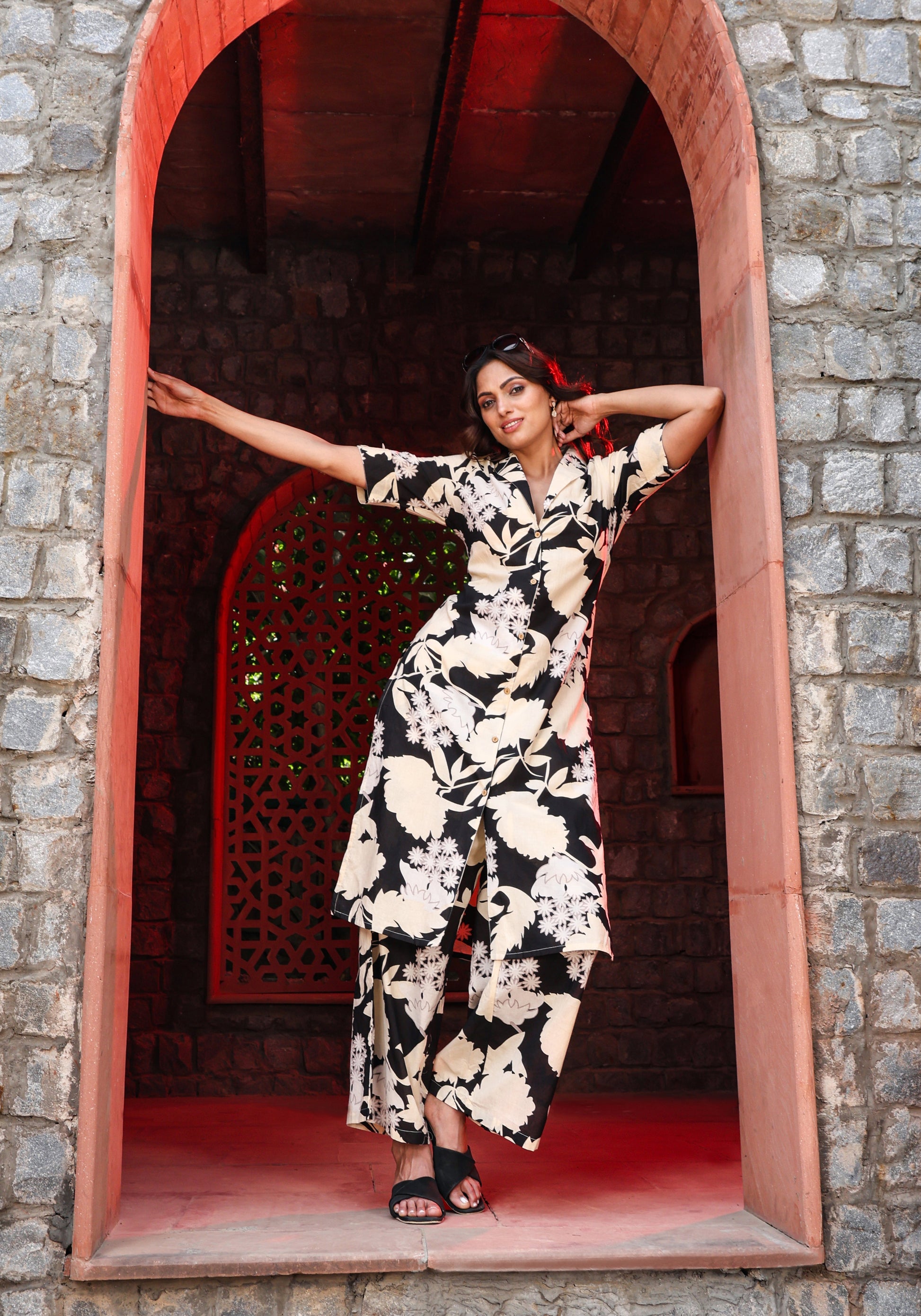 Bold, artistic, and unapologetically confident — this Black & Beige Floral Co-ord Set is the ultimate statement-maker. Designed with a collared, button-down tunic top and wide-leg pants, it features a stunning oversized floral print that adds flair to every step.