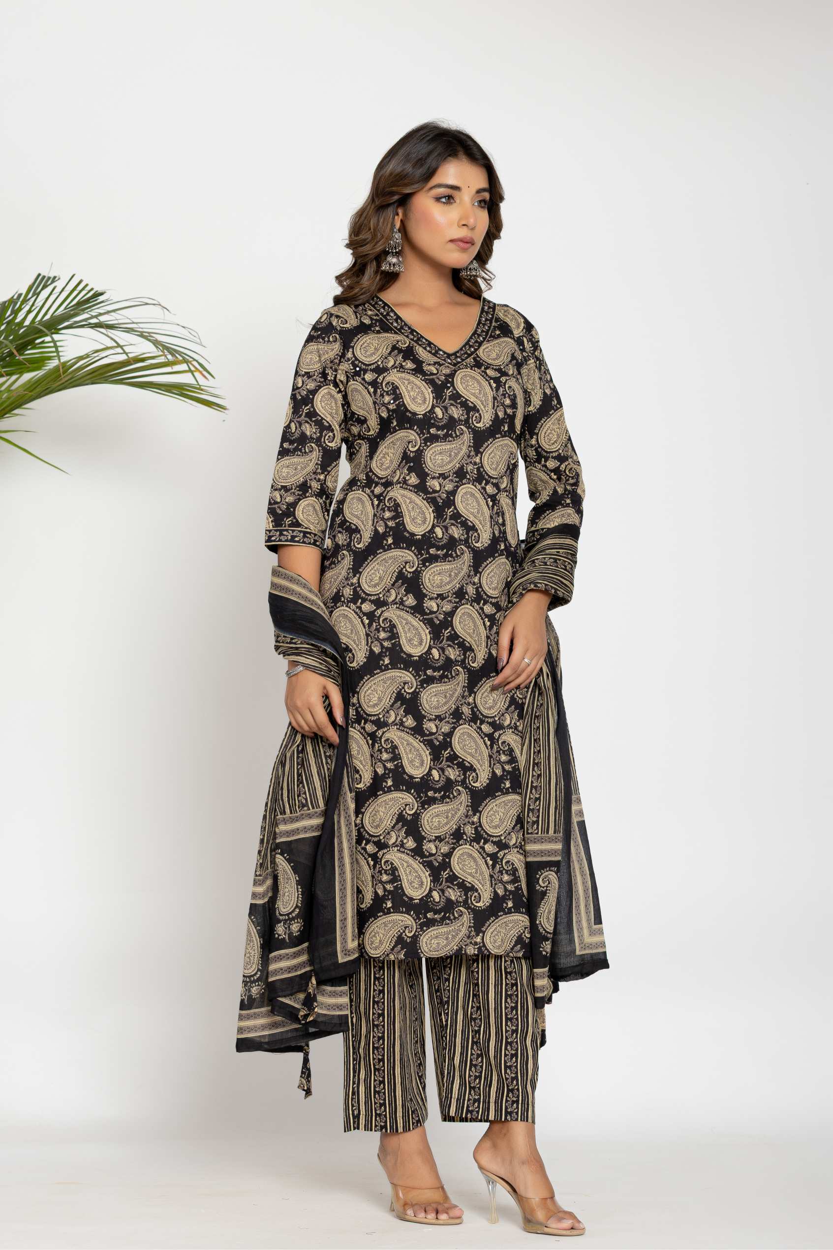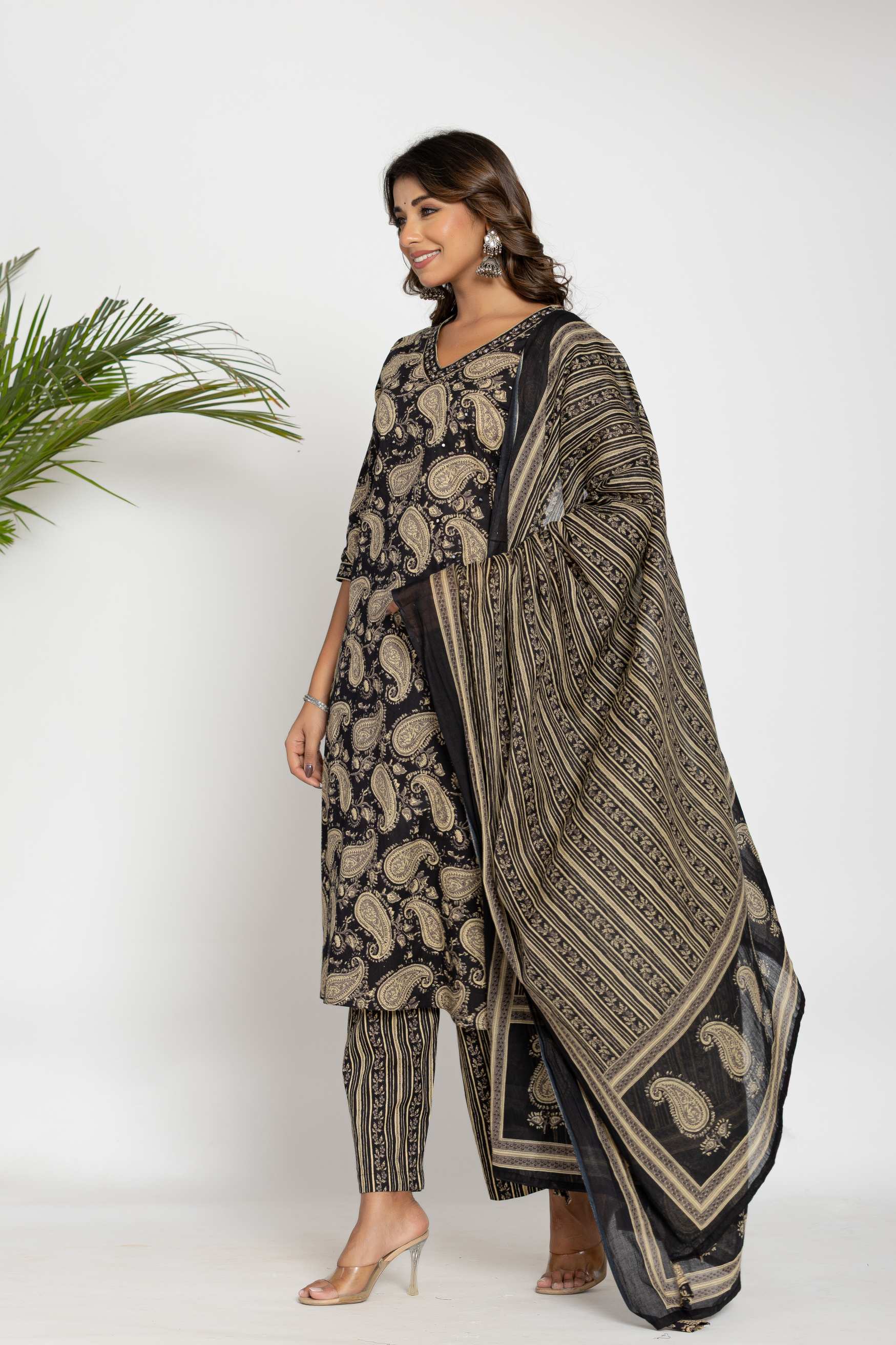 Black & Beige Paisley Printed Cotton Suit Set - Kurti, Pant & Dupatta