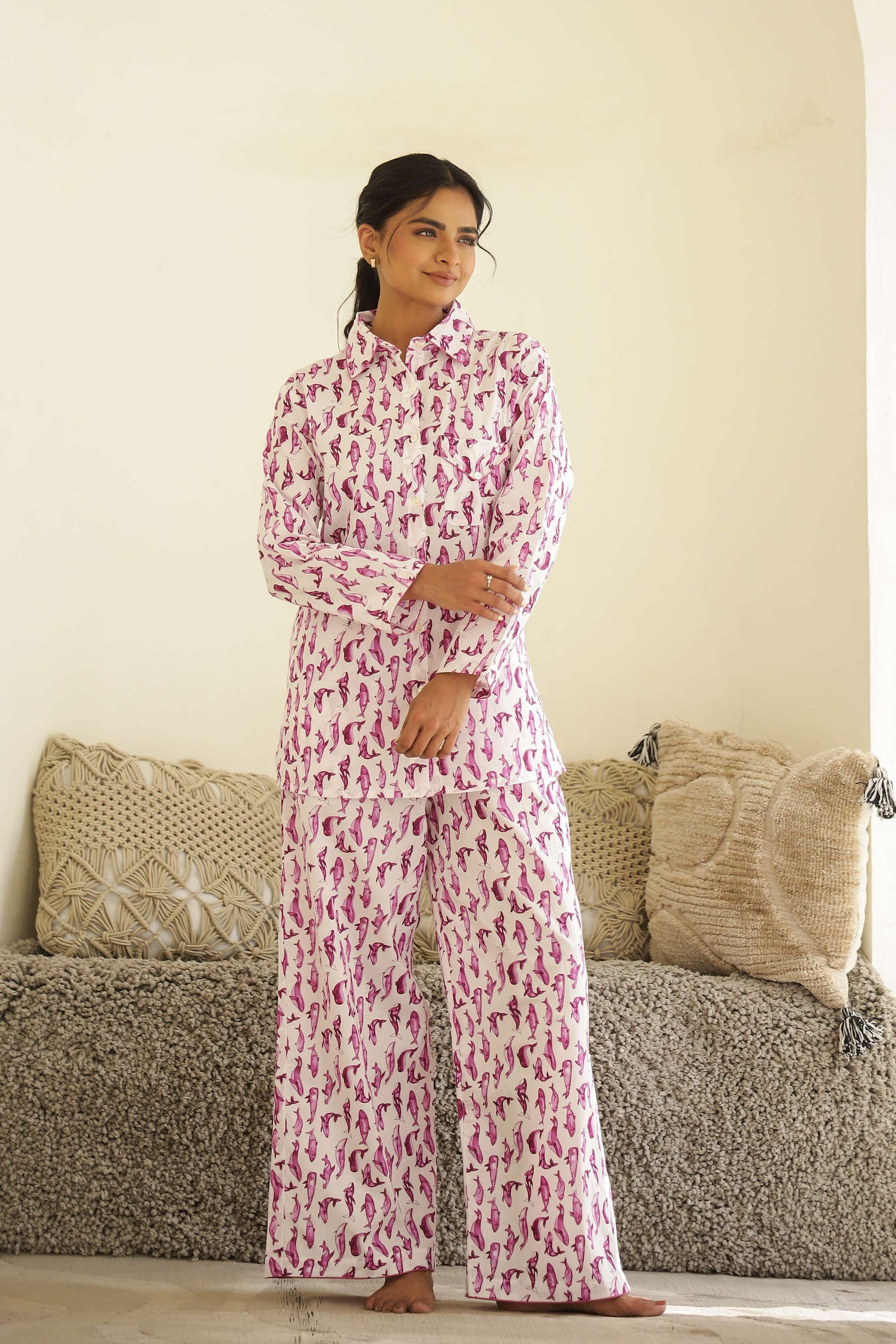 Embrace effortless charm with our Blush Flamingo Print Cotton Co-Ord Set, a playful blend of comfort and chic style. Featuring a crisp white base with whimsical pink flamingo motifs, this set is perfect for lazy lounging days, quick errands, or cozy weekend vibes.