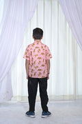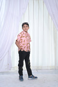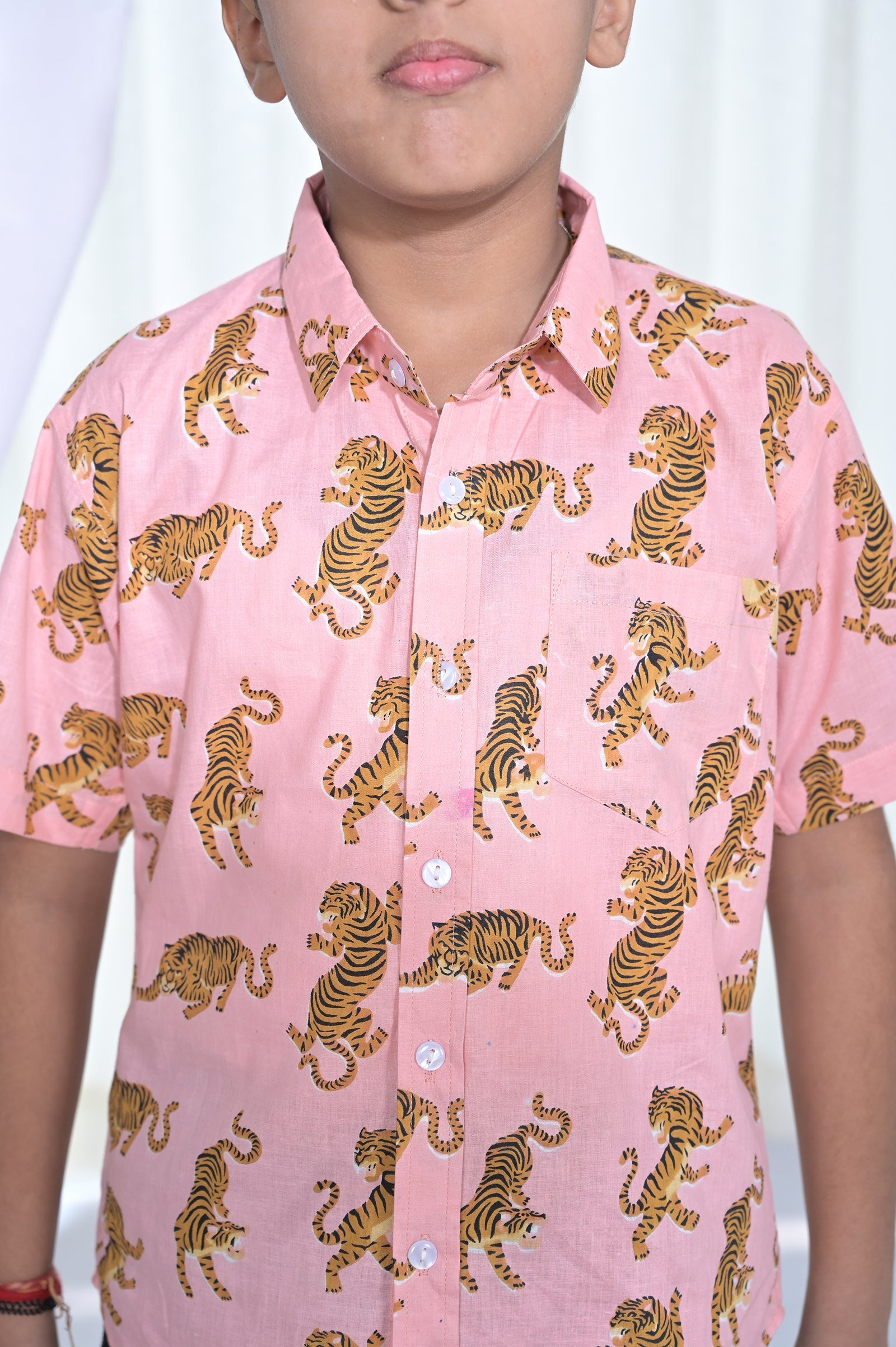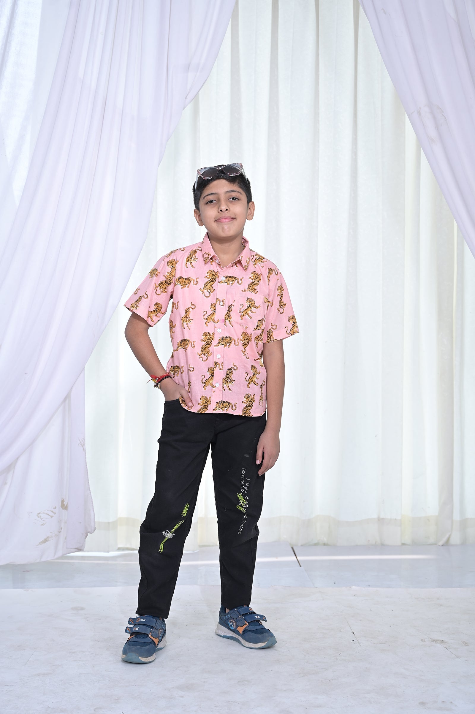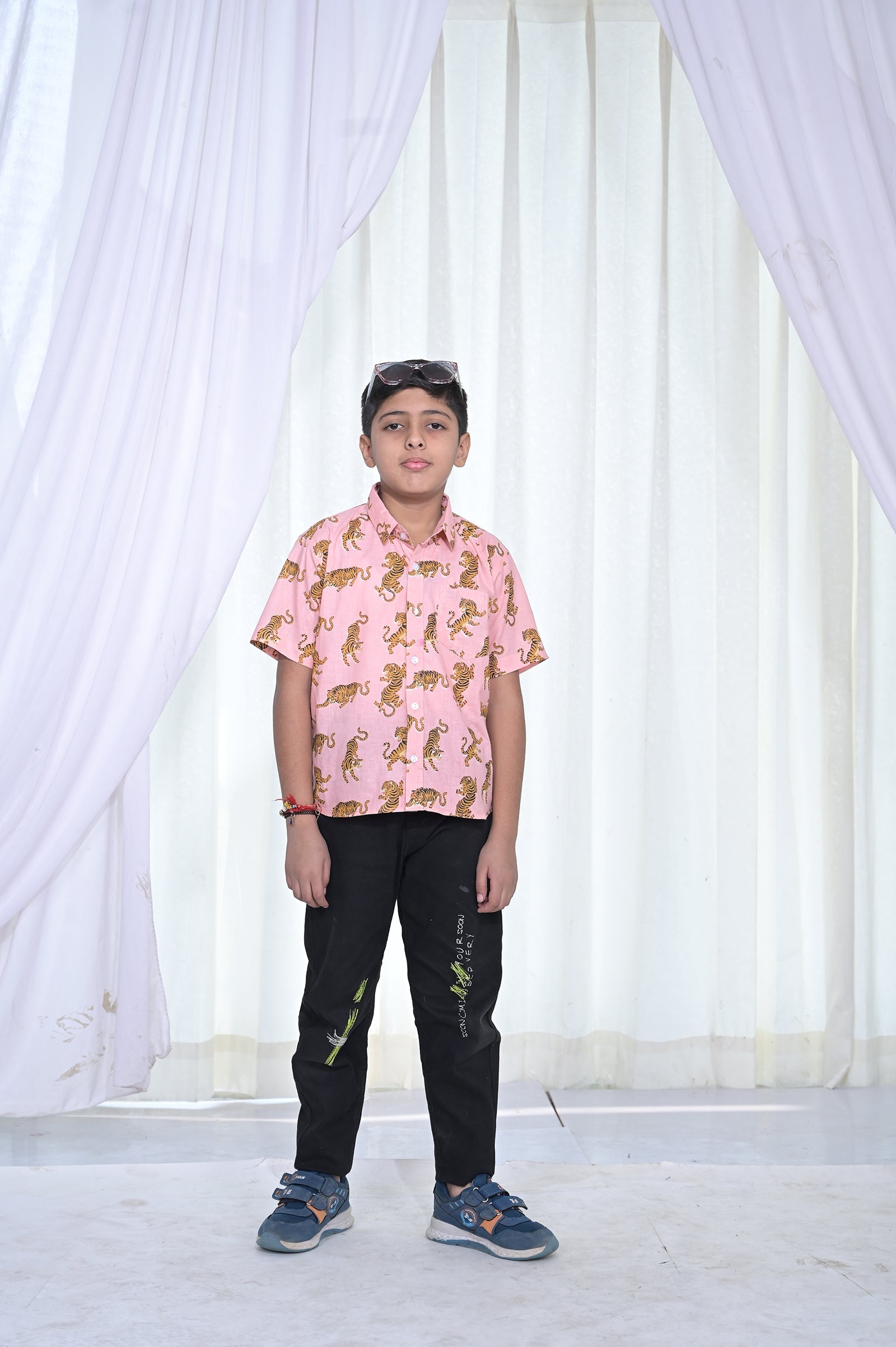 Unleash wild style with this eye-catching pink tiger print shirt for boys. Crafted from breathable cotton, this short-sleeve shirt features a playful pattern of bold tigers on a soft pink background—perfect for boys who love fun fashion with a roar of personality!