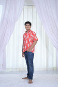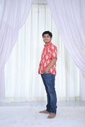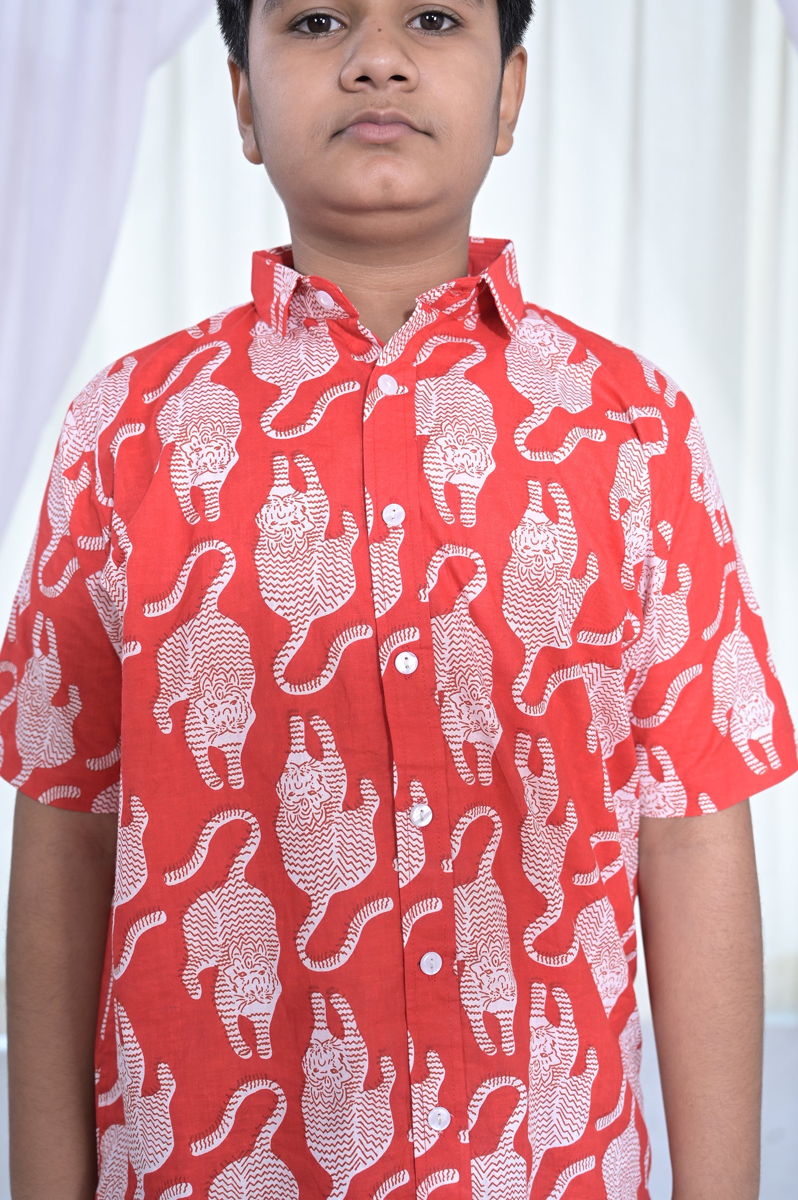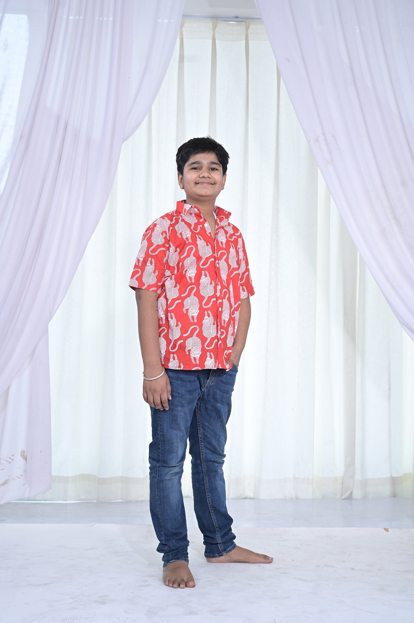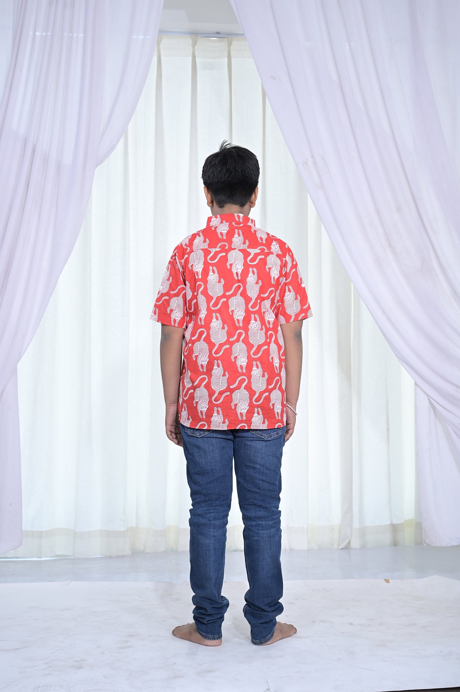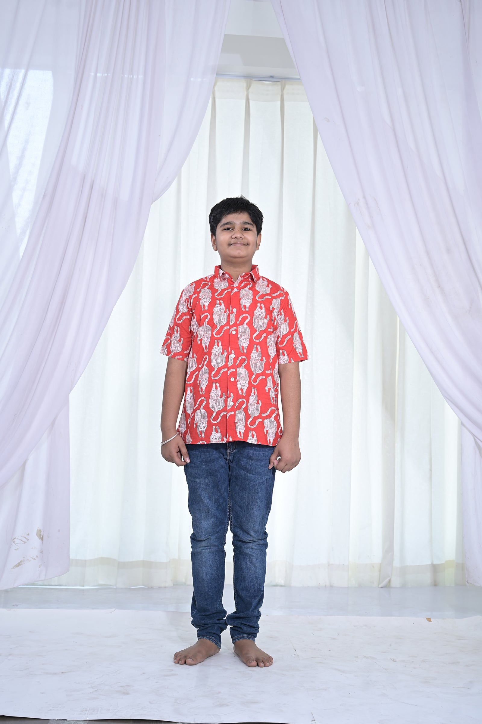 Add a pop of fun to your boy’s closet with this bold red shirt featuring a quirky white cat print. Designed with a relaxed fit and soft, breathable cotton, this shirt is perfect for casual wear, parties, and summer outings. The eye-catching print adds a playful edge to his everyday look.