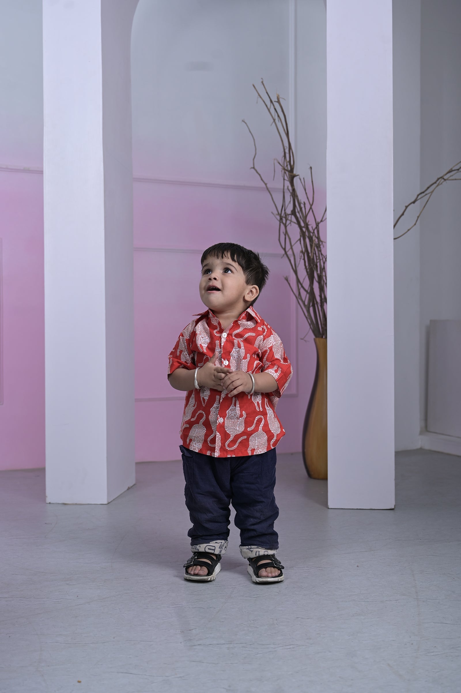 Make a bold statement in our vibrant red shirt, scattered with crisp white cheetah silhouettes. Crafted from soft cotton, it’s a fun, eye-catching piece that’s as comfortable as it is stylish.