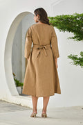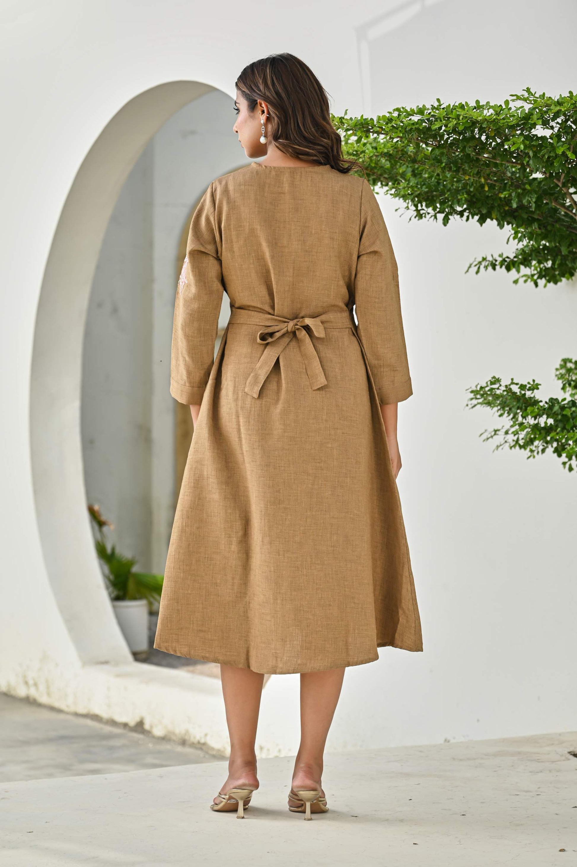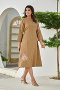 Elegant Brown A-Line Cotton Dress with Floral Embroidery