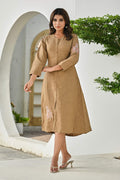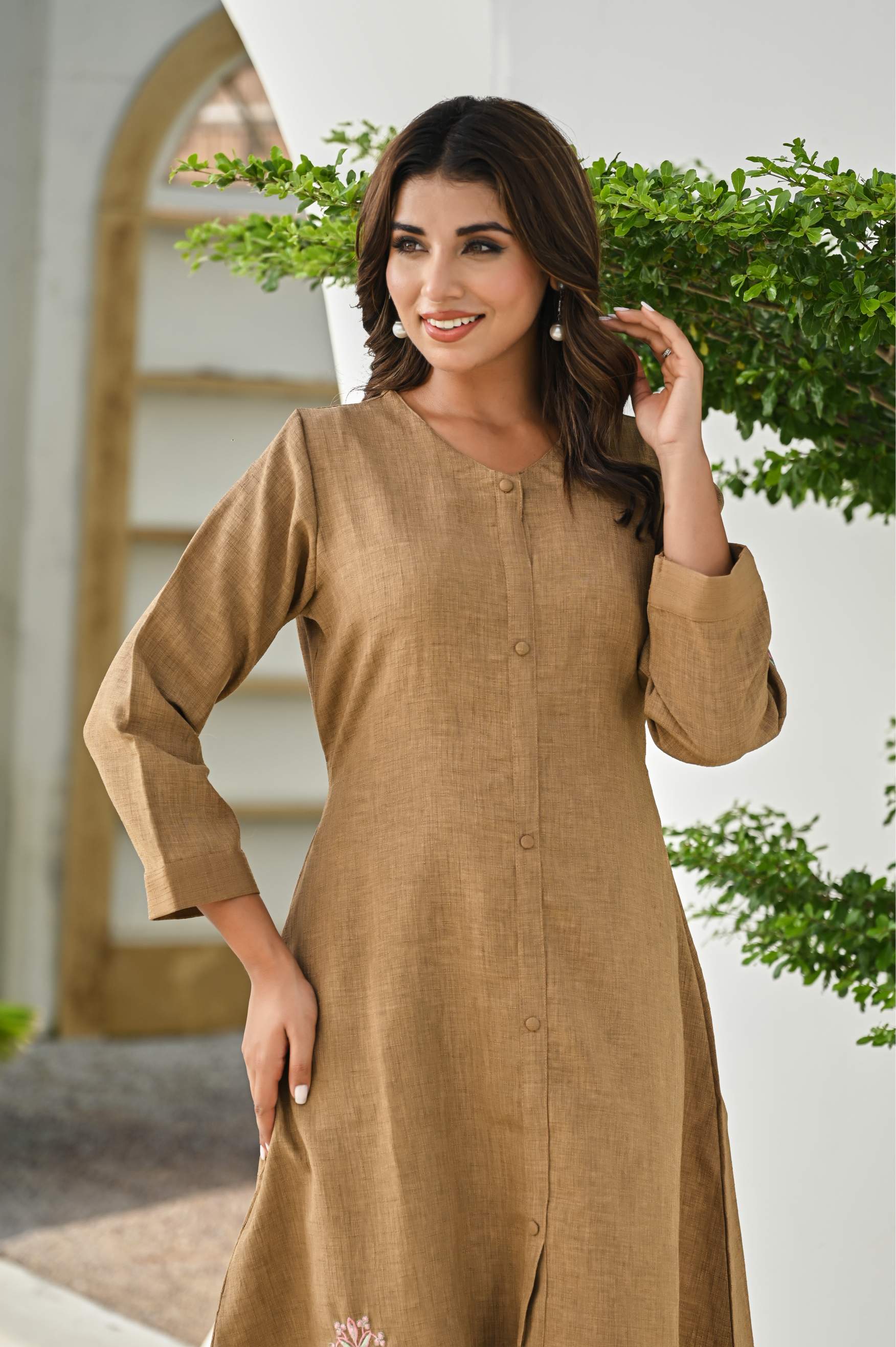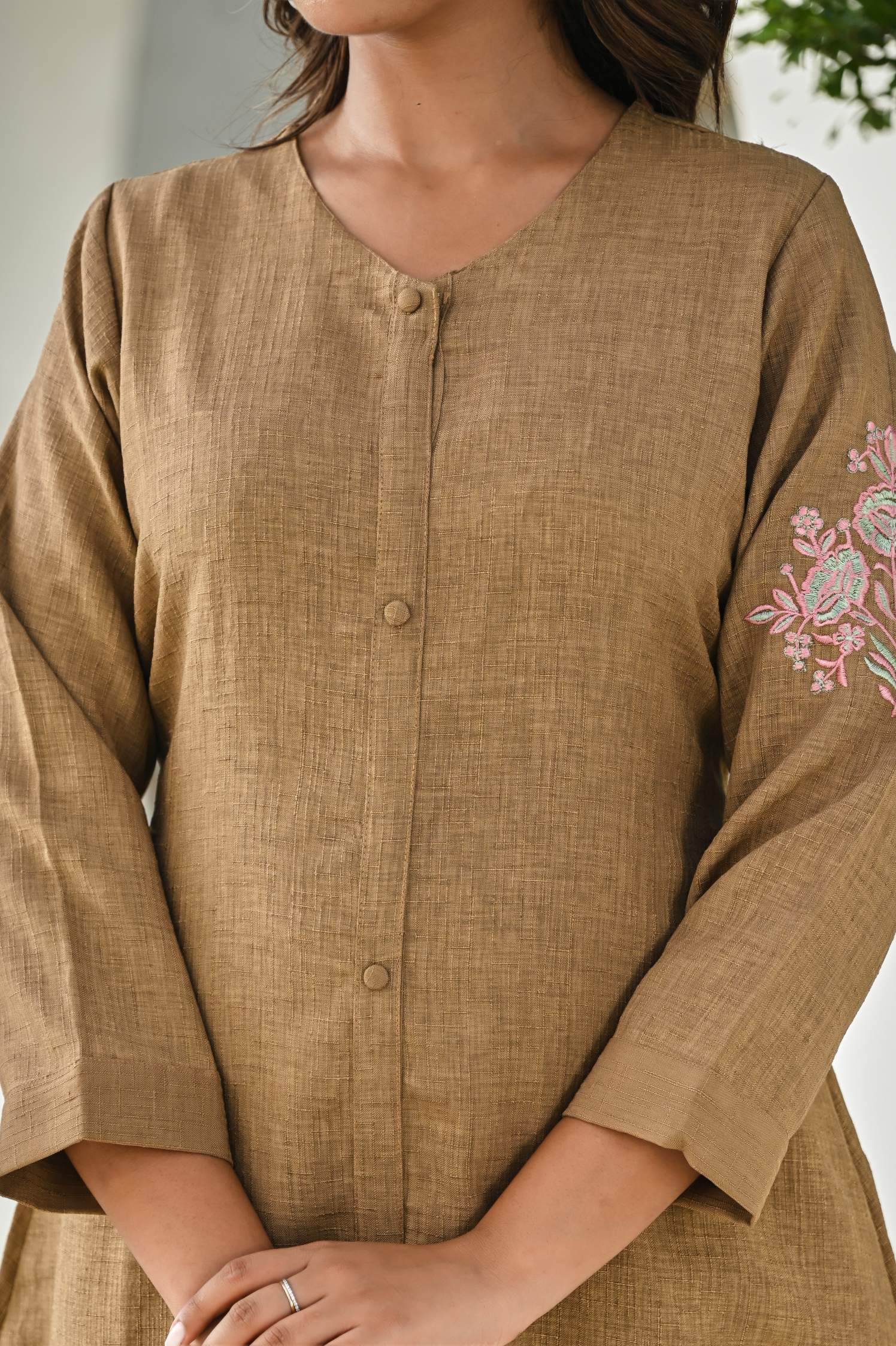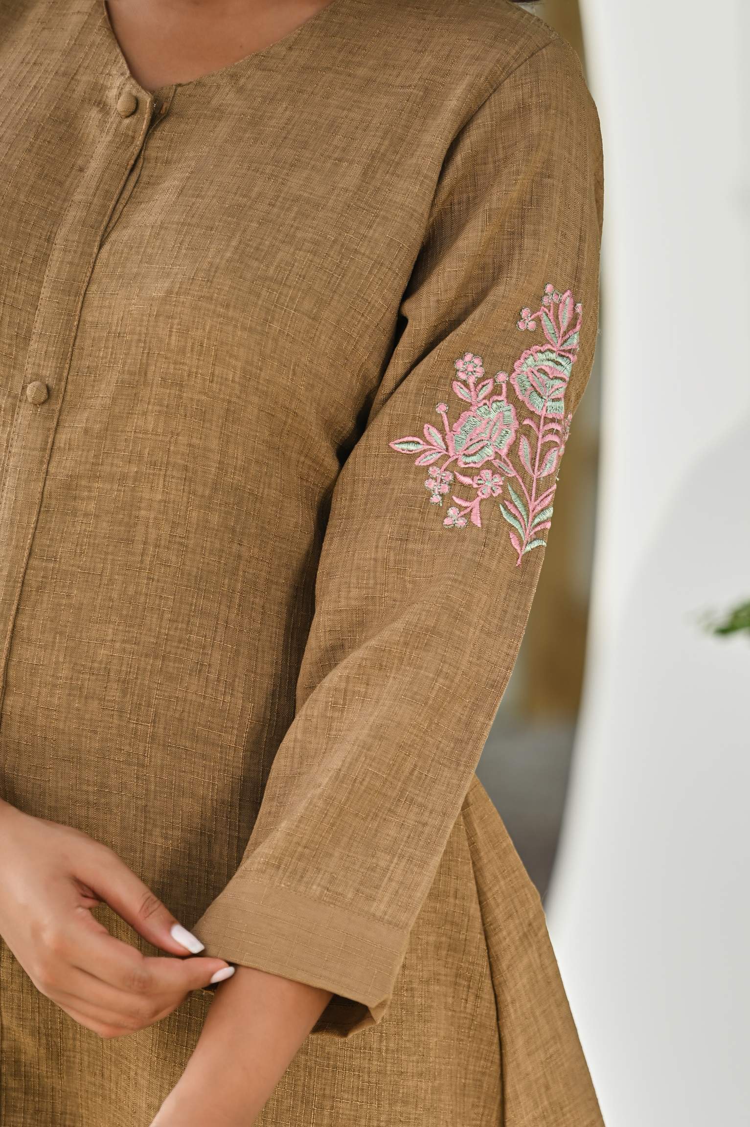 Discover timeless elegance with this beautifully tailored brown dress. Crafted from soft cotton fabric, it features subtle floral embroidery on the sleeve and hem, adding a delicate charm to your everyday ethnic wear. The A-line silhouette ensures comfort with style, perfect for casual outings or office wear.