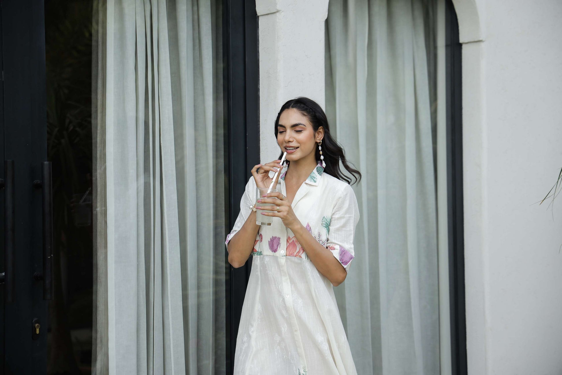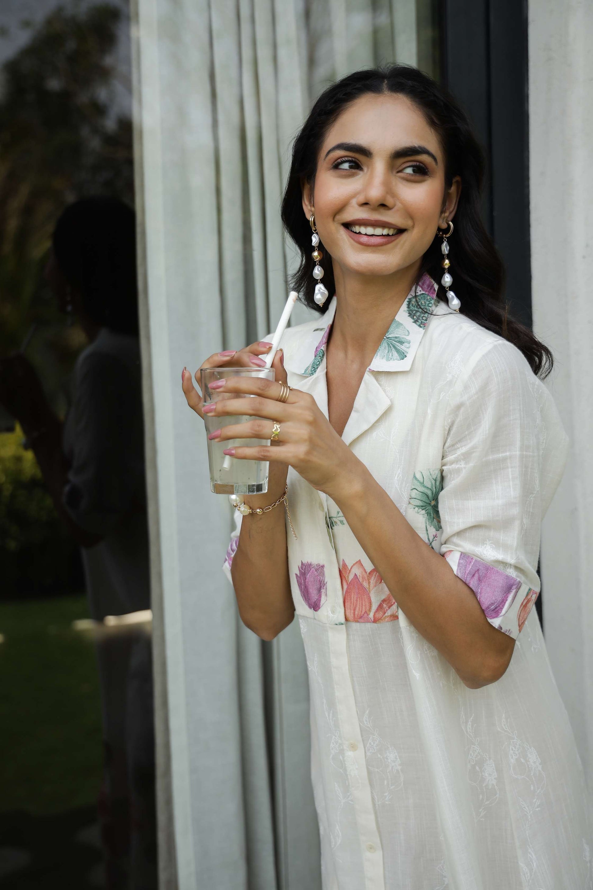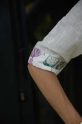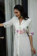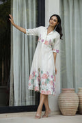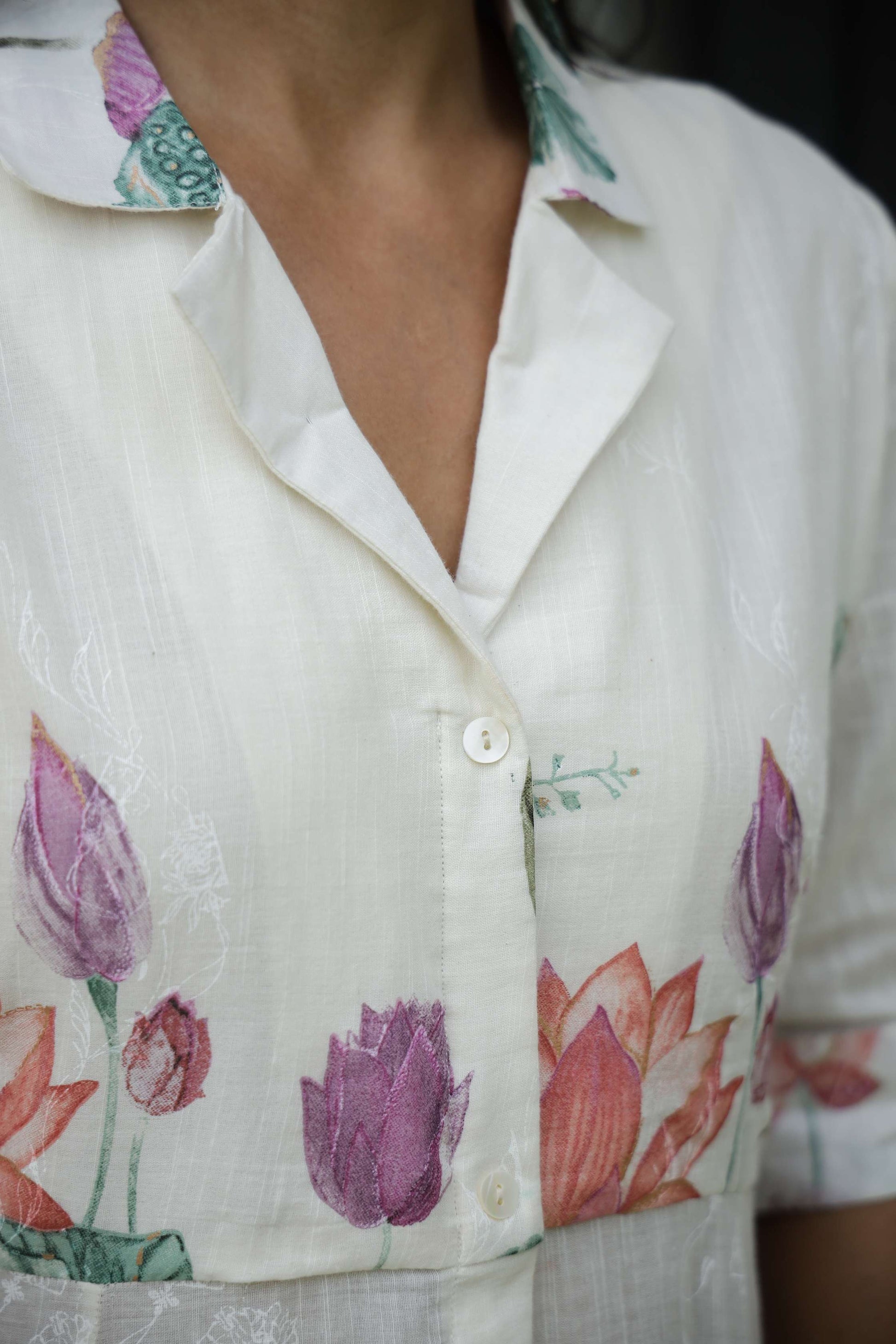 A graceful shirt-style midi dress adorned with lotus flower motifs in pink, purple, and green. Ideal for daytime elegance, festive gatherings, or casual luxe looks.
