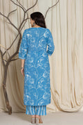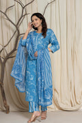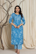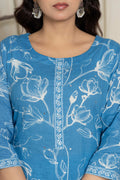 Elegant Sky Blue Floral Cotton Suit Set - Kurti, Pant & Dupatta