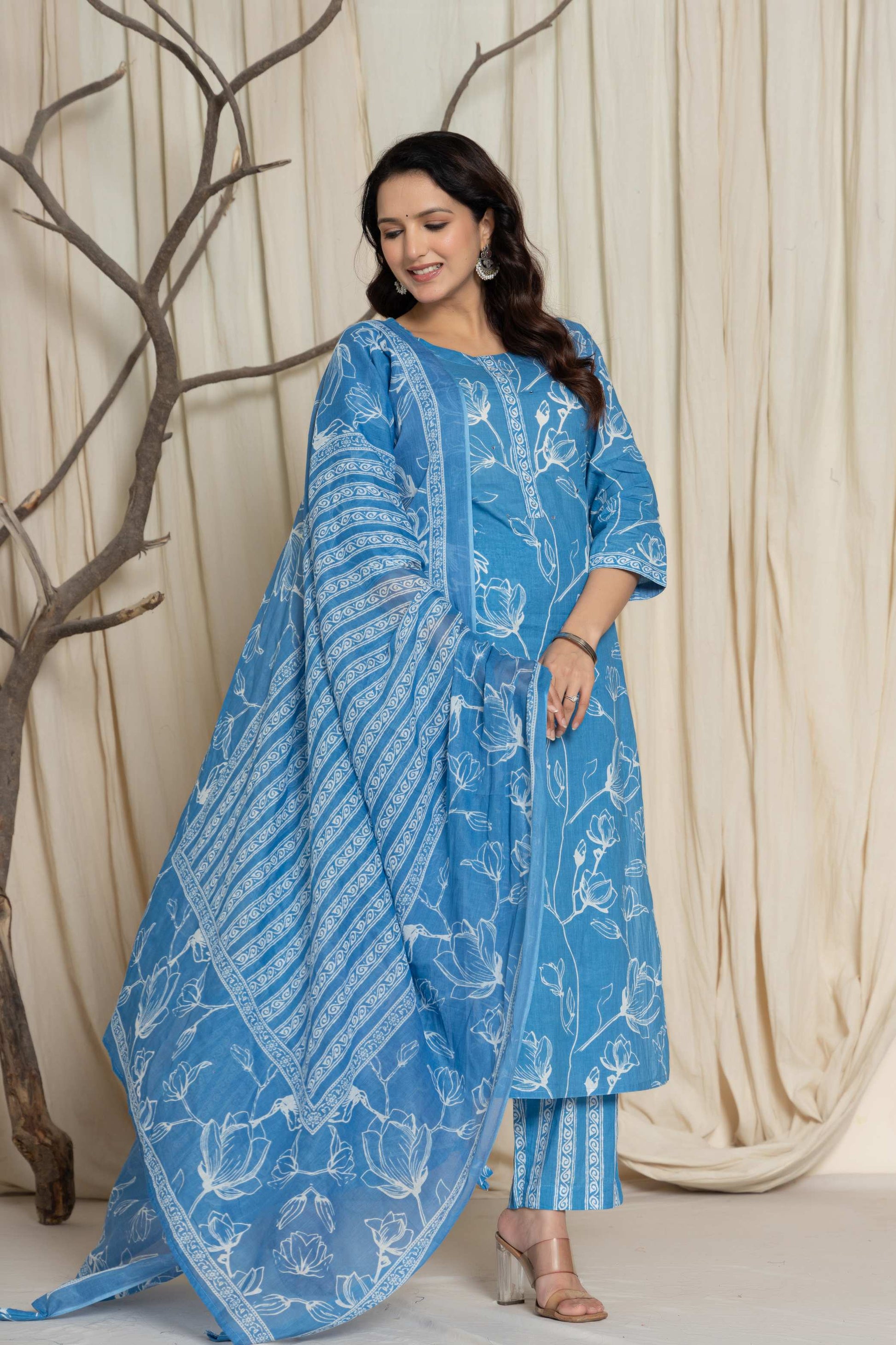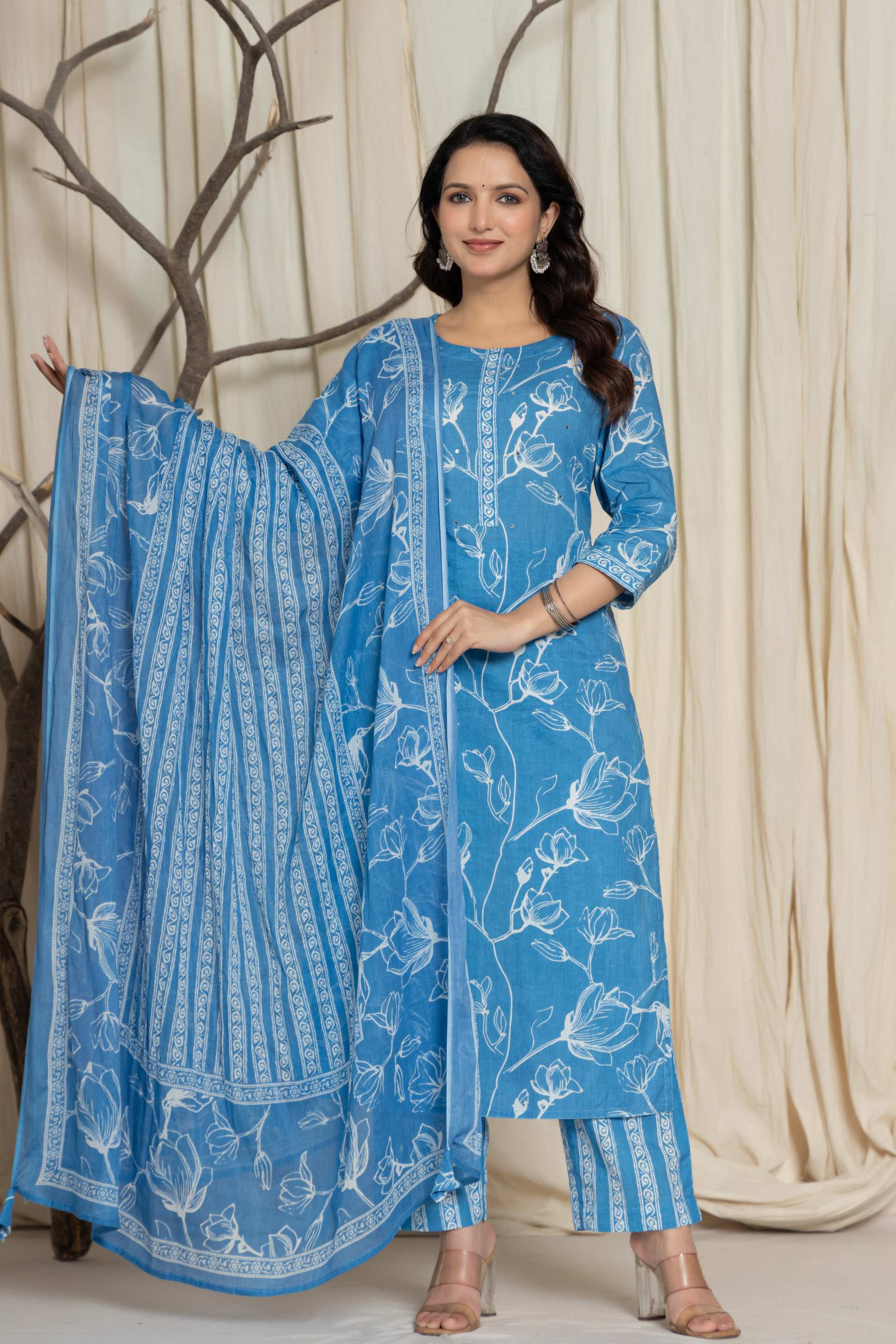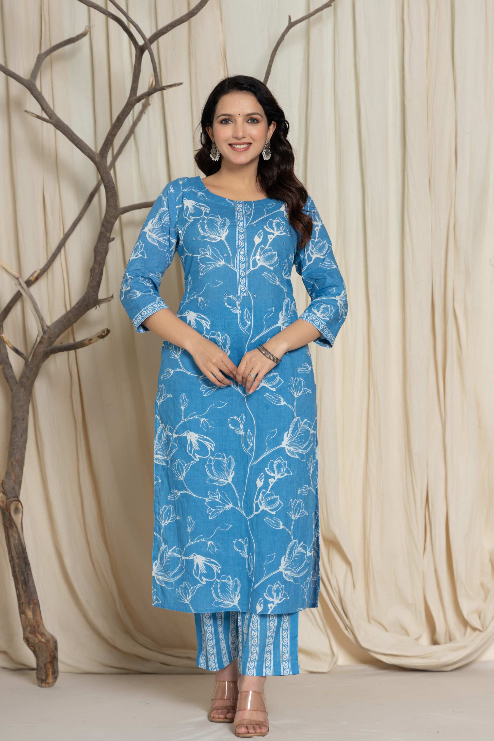 Upgrade your ethnic wardrobe with this beautiful sky blue floral suit set, crafted from premium cotton fabric for ultimate comfort. The set features intricate prints and elegant design, making it a perfect choice for casual outings, festive occasions, or office wear.