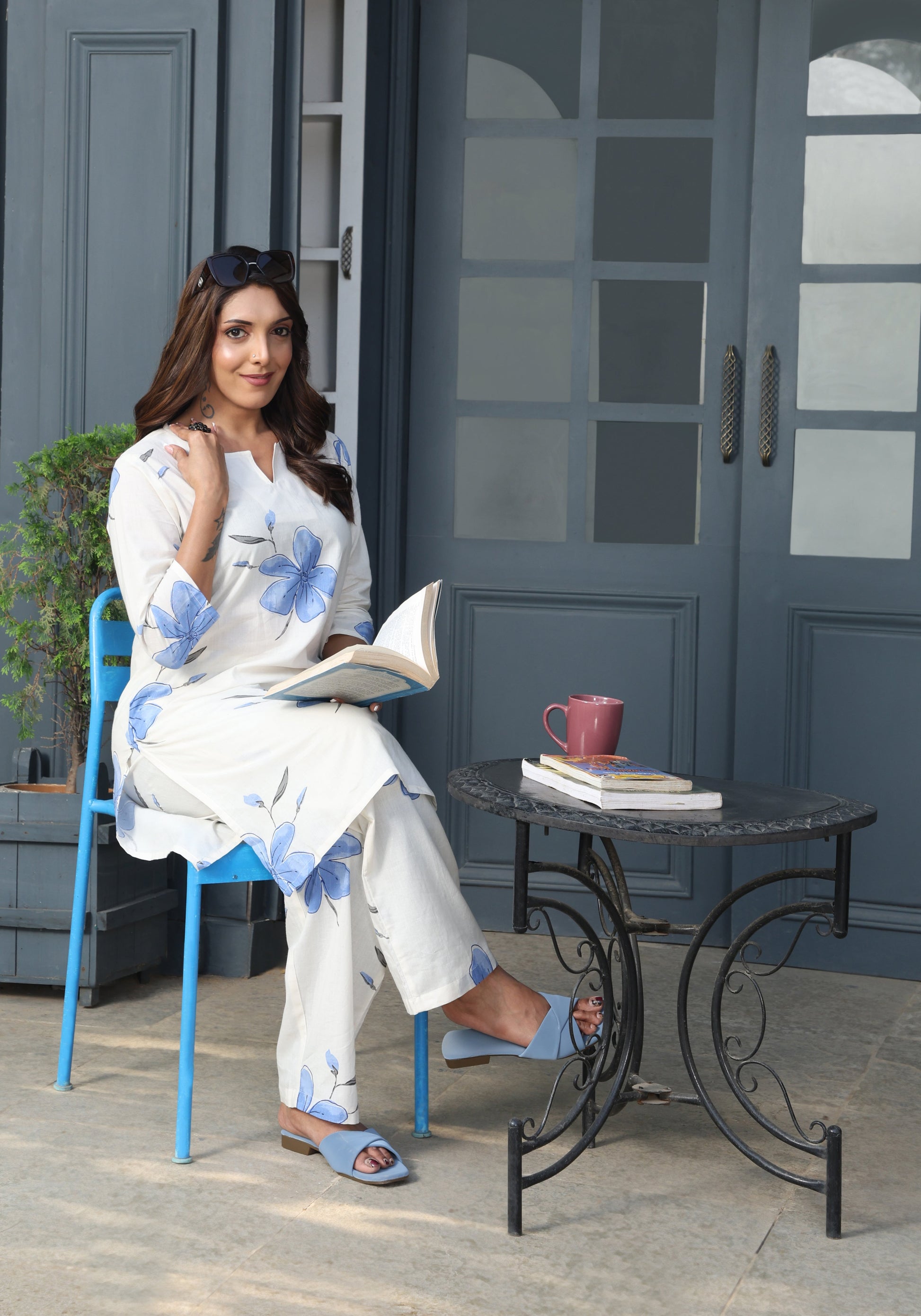 Pair it with blue flats or minimal sandals and some silver jhumkas for a relaxed, graceful look.