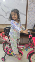 This pastel powder blue coord set features fine Chikankari craftsmanship and a playful yet elegant look — perfect for a fusion of tradition and comfort.