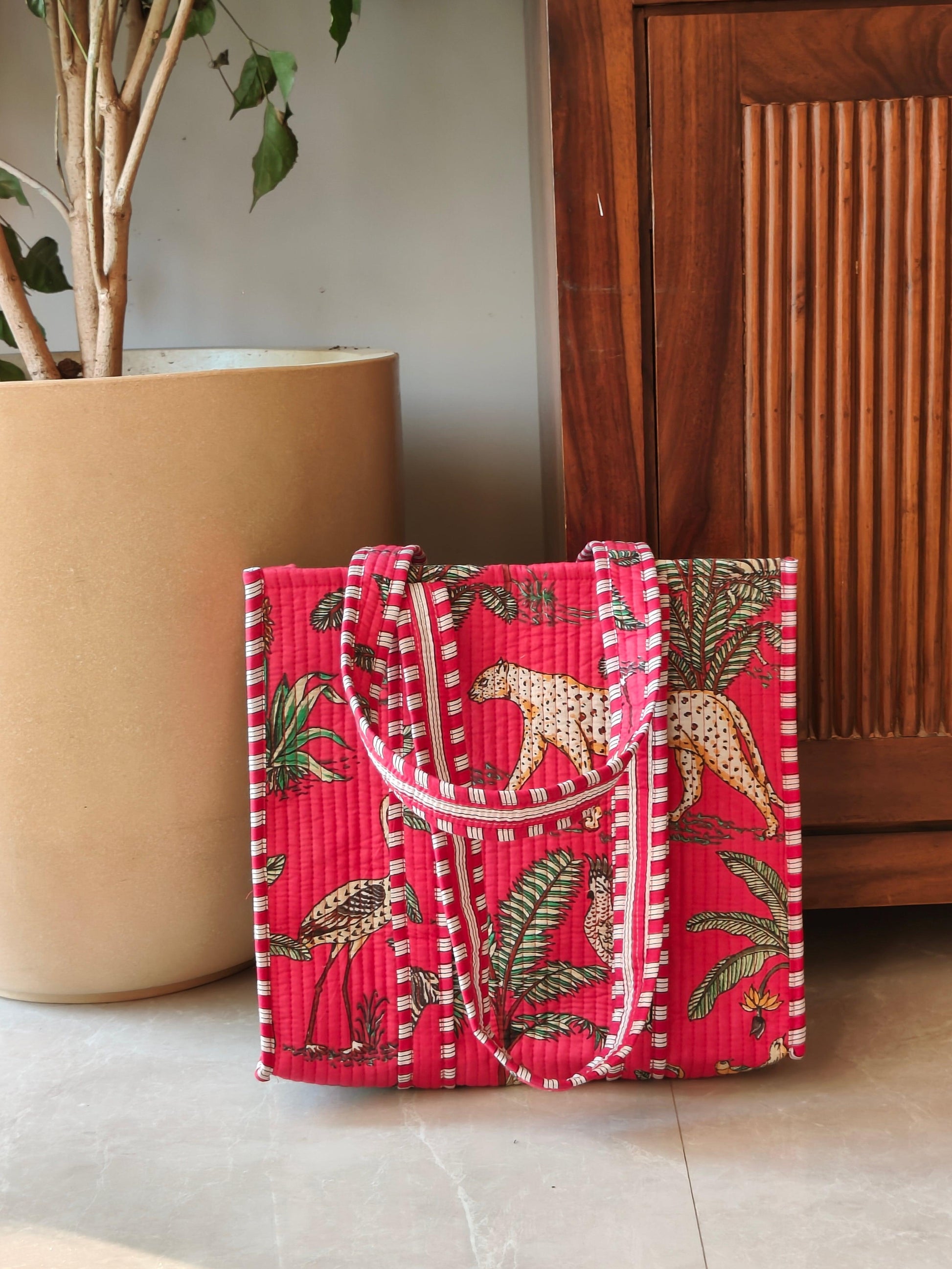 Handcrafted Jungle-Print Pink Tote Bag for Indian Women – Eco-Friendly, Spacious & Stylish