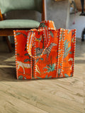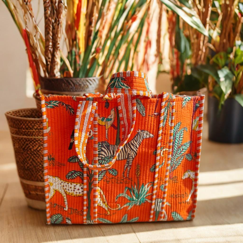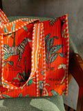 Enhance your wardrobe with our Handcrafted Jungle-Print Tote Bag, tailored for the modern Indian woman who values both style and functionality. Adorned with a striking jungle print featuring vibrant orange hues, this tote makes a bold statement while perfectly complementing casual outfits or ethnic wear. Whether it's a shopping spree, office day, or a weekend getaway, this spacious bag is your go-to companion for carrying all essentials effortlessly.