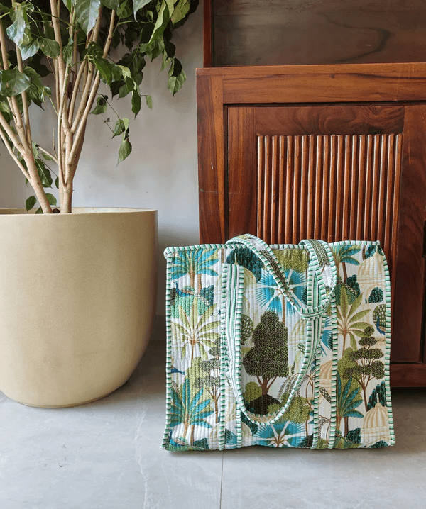 #ToteBagForWomen #TropicalPrintBag #HandcraftedBagsIndia #EcoFriendlyBags #StylishToteForIndianWomen #BotanicalPrintBag #ShoppingBagsIndia #EthnicBagsOnline #WomenAccessoriesIndia #SustainableFashion