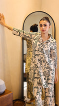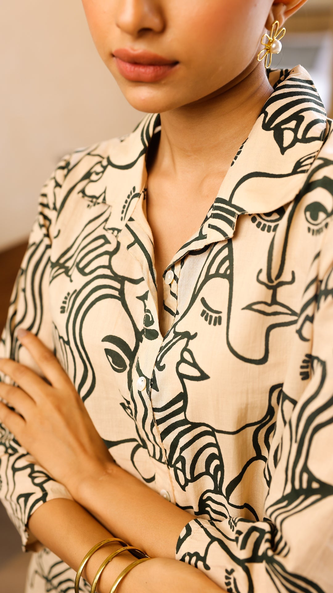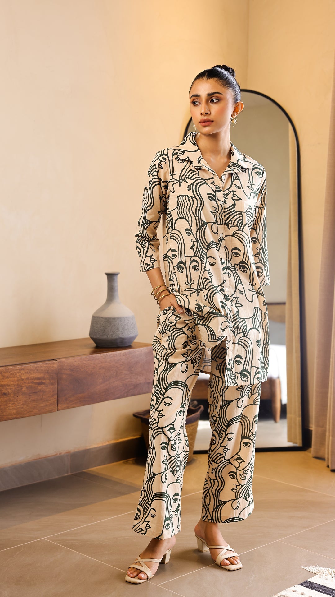 Beige & Green Artistic Face Print Co-ord Set
