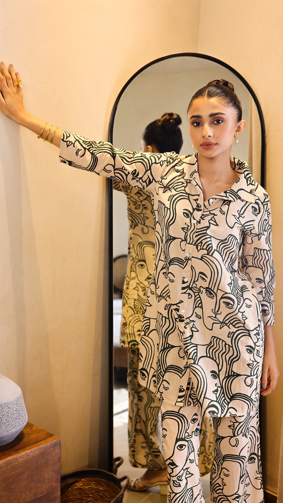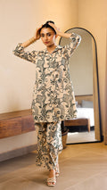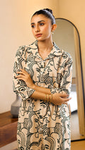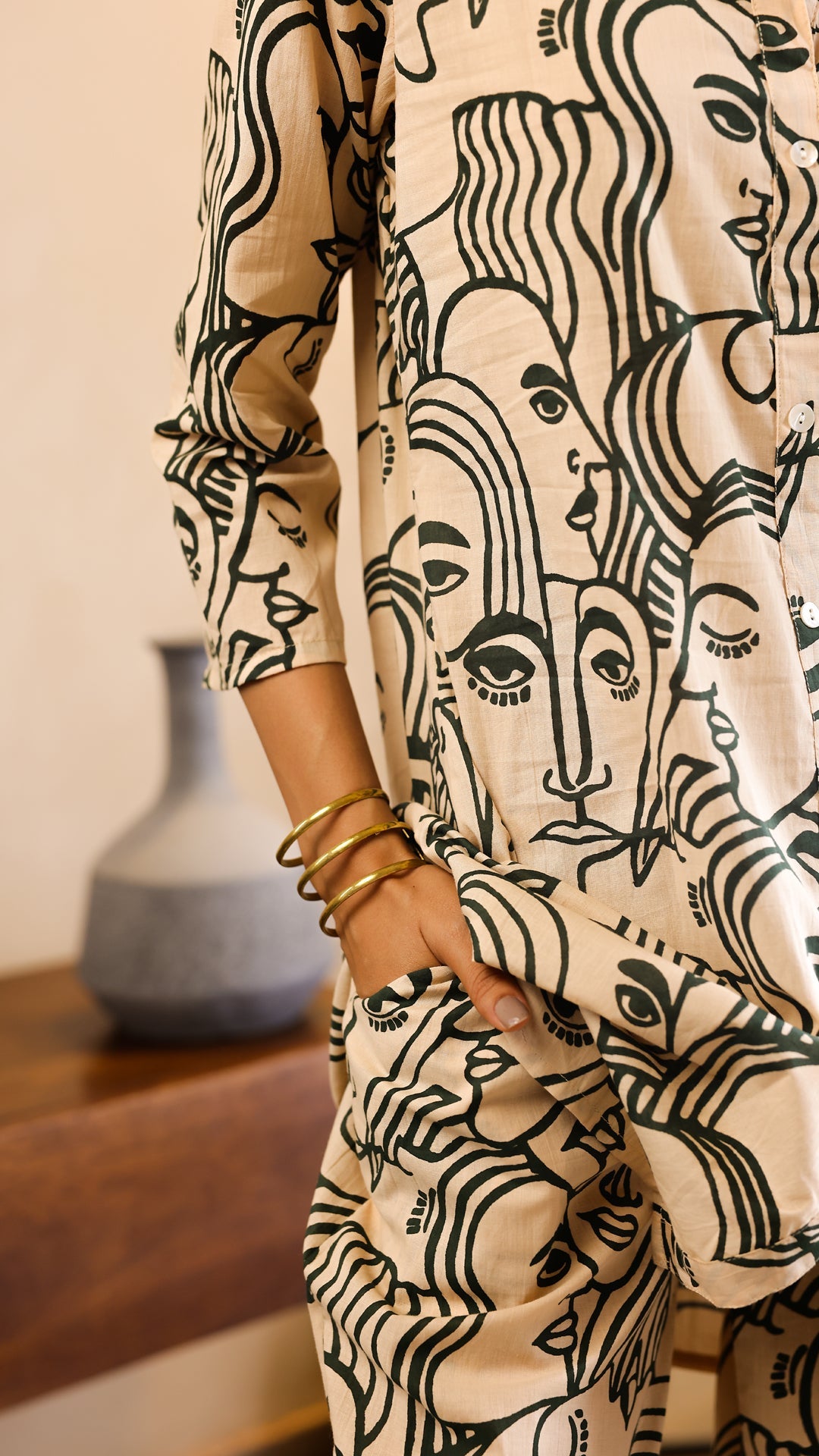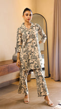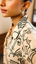 A bold yet elegant co-ord set in beige, adorned with abstract black face prints. Made from breathable cotton-linen, this kurta and pant combo is ideal for casual chic or workwear styling. Front button-down design adds modern structure to artistic charm.