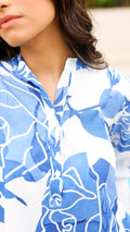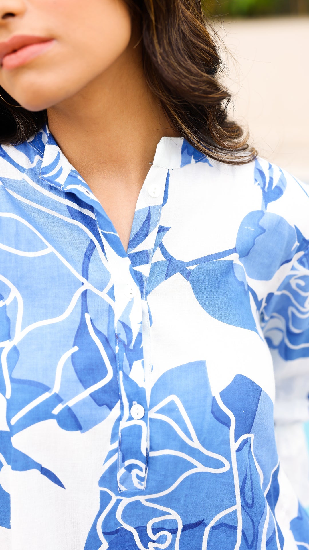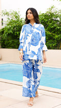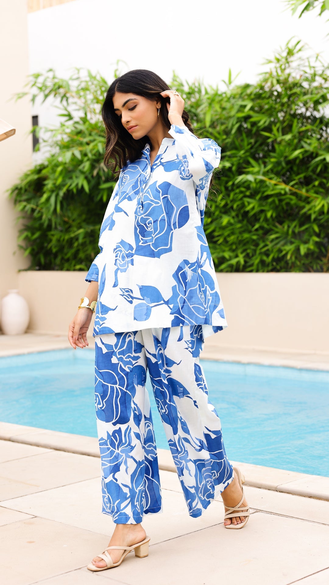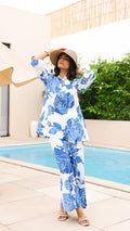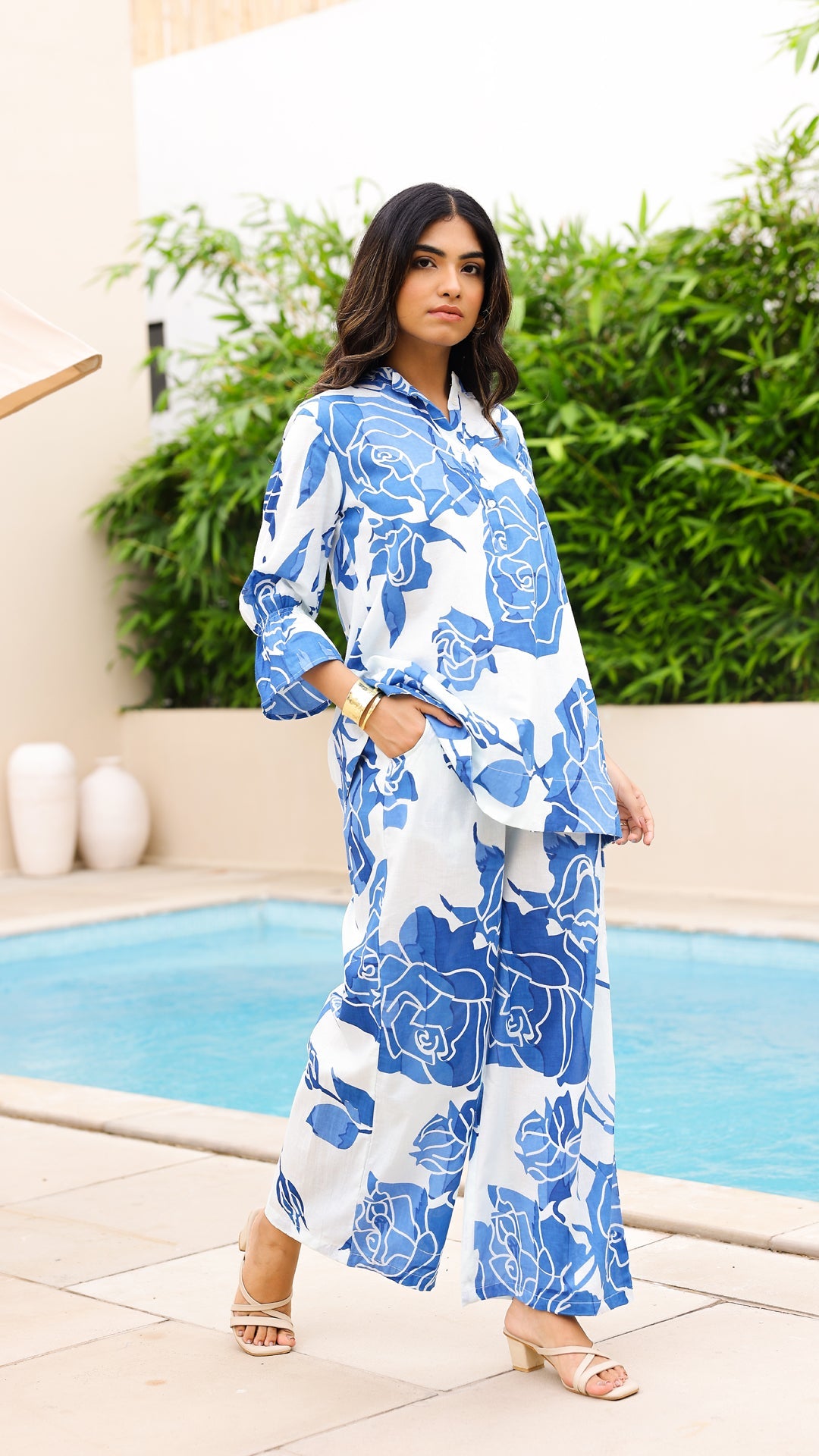 Effortlessly chic and breezy, this blue floral co-ord set is a summer wardrobe essential. Featuring oversized rose prints on a soft white base, it includes a flowy kurta with gathered sleeves and relaxed-fit pants. Perfect for daytime elegance.