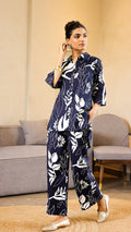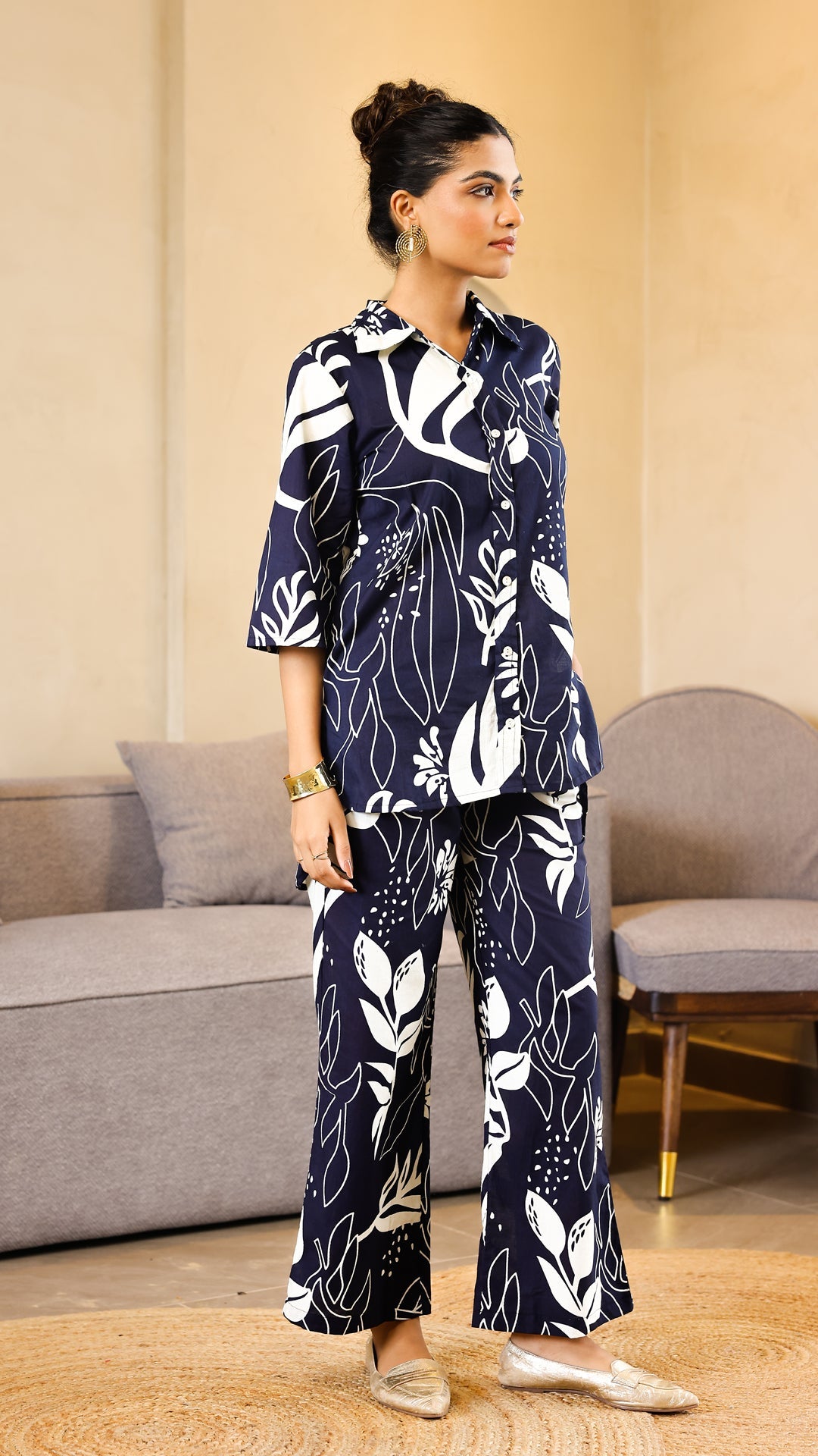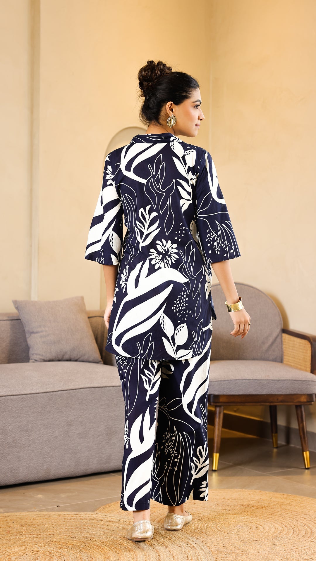 This navy and white floral co-ord set brings effortless elegance with its minimal monochrome palette. Crafted from soft, breathable cotton, it's perfect for both lounging and stepping out in style.