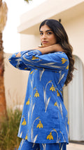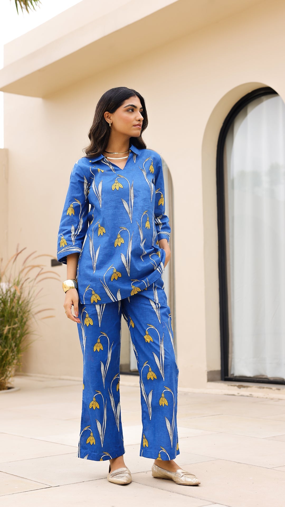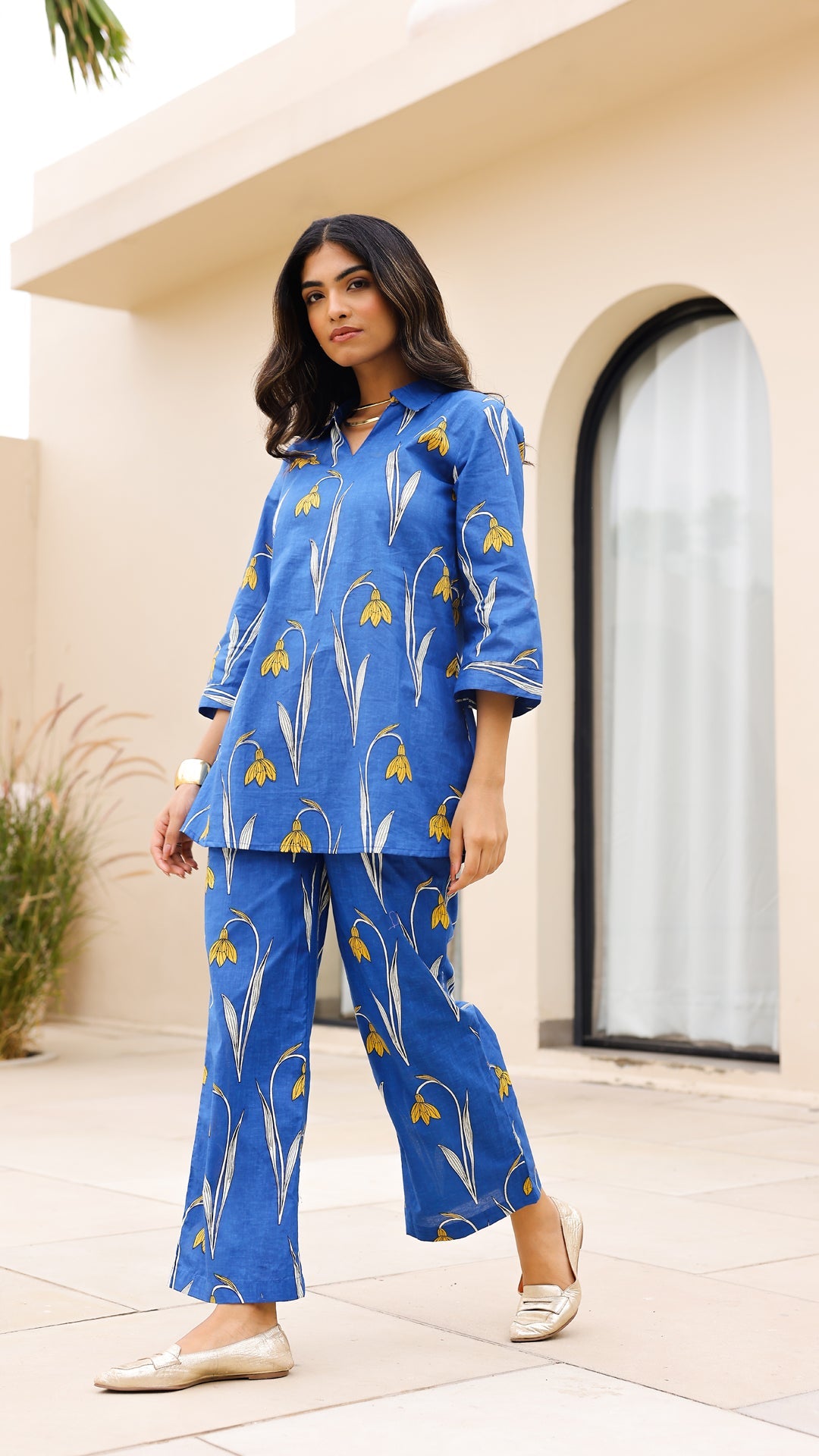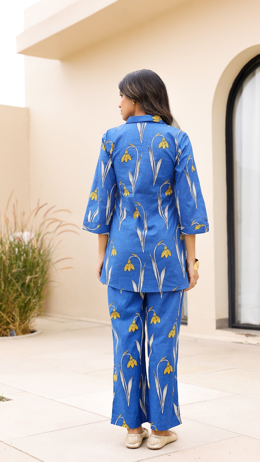 Add a pop of freshness to your wardrobe with this breezy blue co-ord set featuring delicate yellow flower prints. Made from lightweight cotton, it's ideal for effortless everyday elegance.