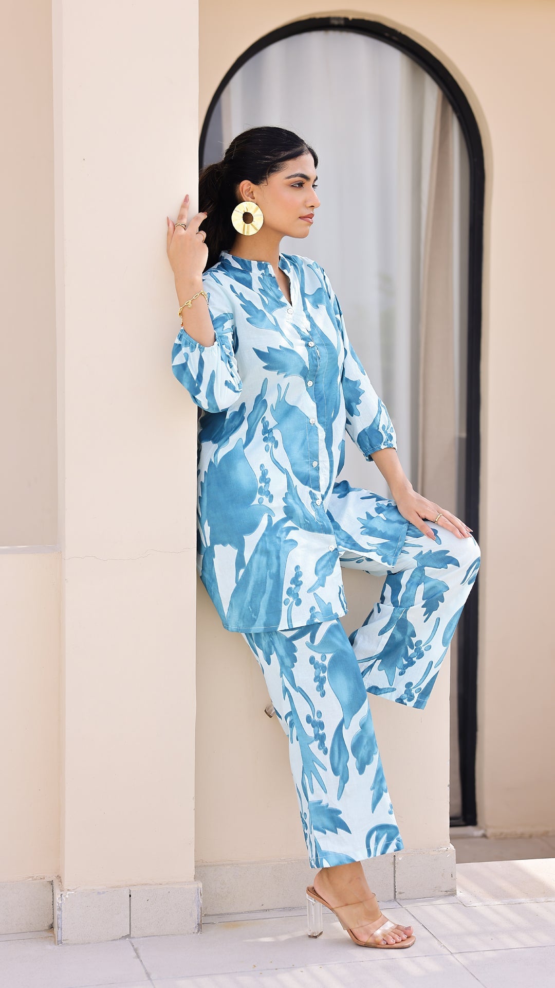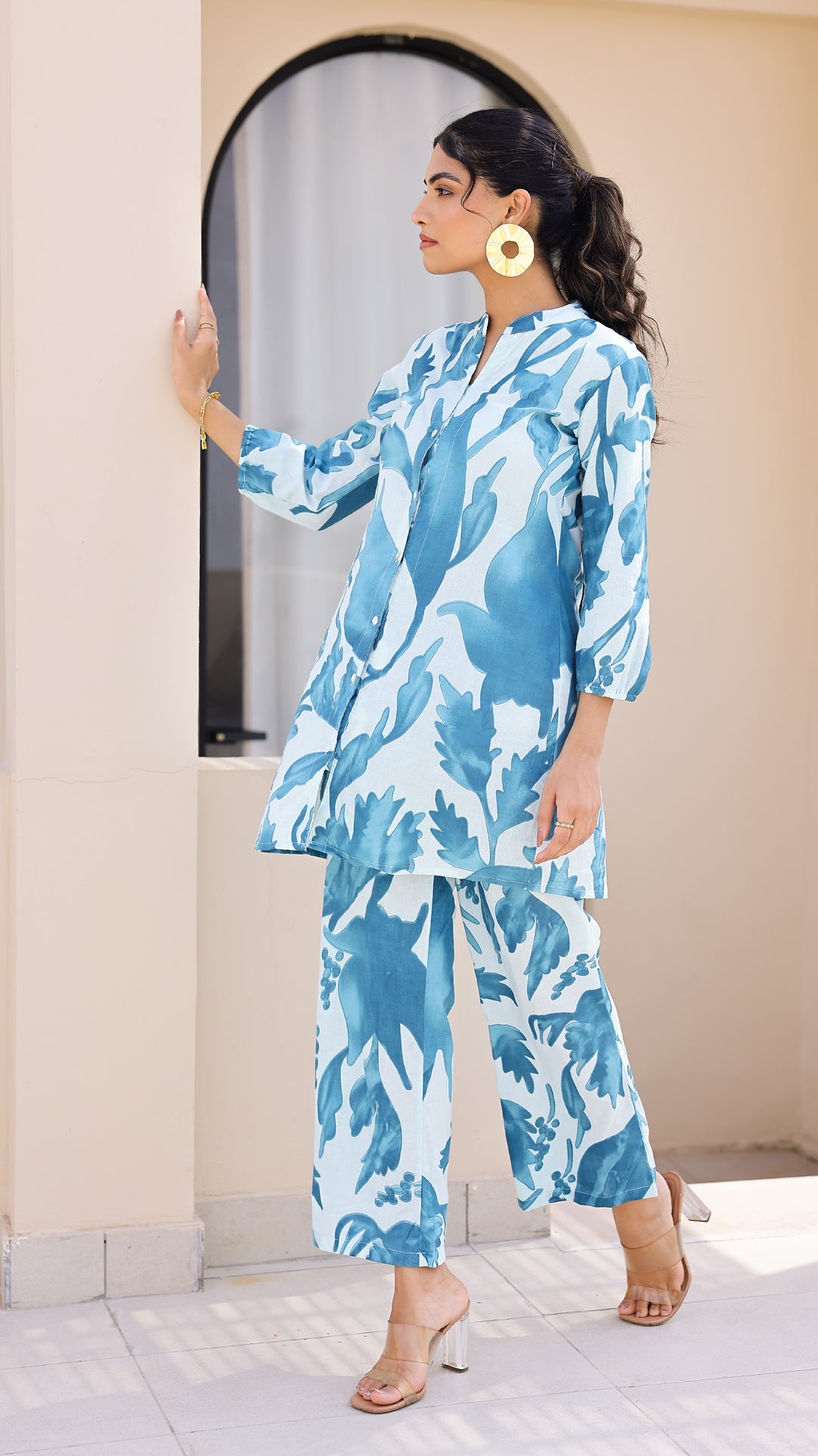 Soothing tones meet bold design in this sky blue co-ord set featuring oversized leaf motifs. Crafted from breathable cotton-linen, this button-down kurta with 3/4 sleeves pairs effortlessly with relaxed-fit pants—ideal for summer days, vacations, or casual brunch looks.
