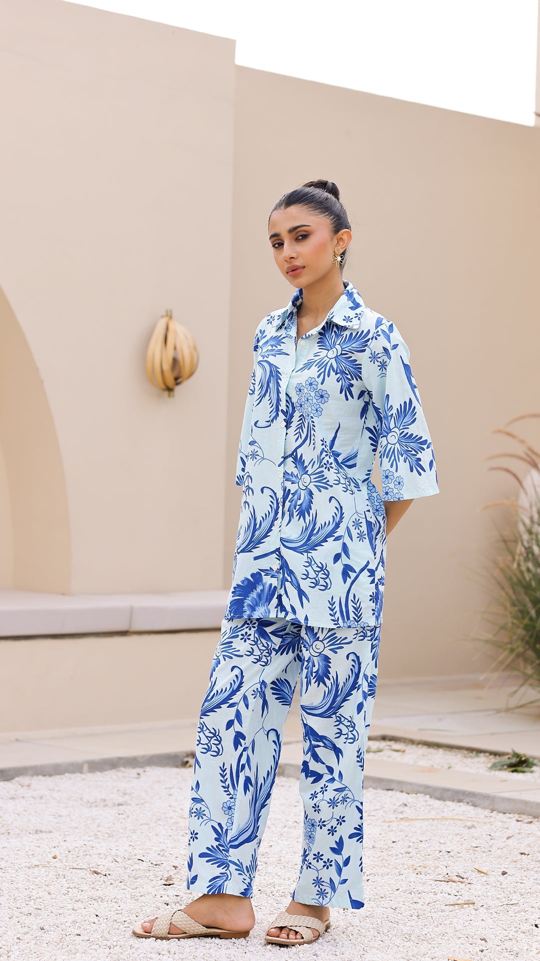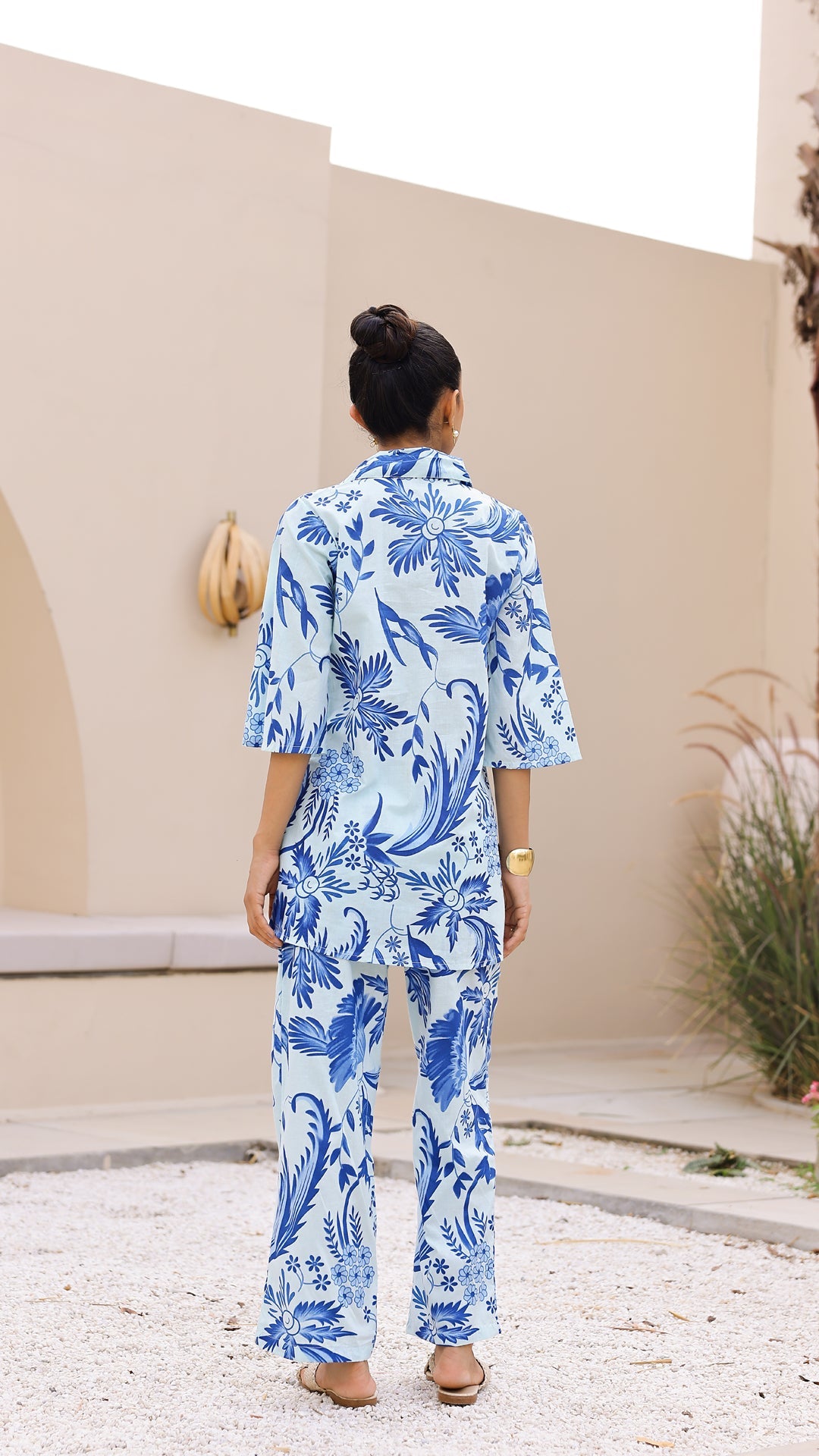 Sky Blue Hand-Drawn Floral Co-Ord Set – Cotton Comfortwear