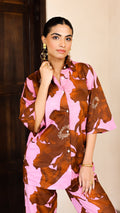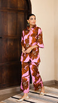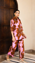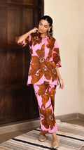 Make a bold statement in our Chocolate Floral Co-Ord Set, featuring oversized brown florals on a soft pink base. Crafted in breathable cotton blend, this two-piece set is chic yet comfy—ideal for festive brunches, travel days, or effortless daily dressing.