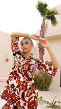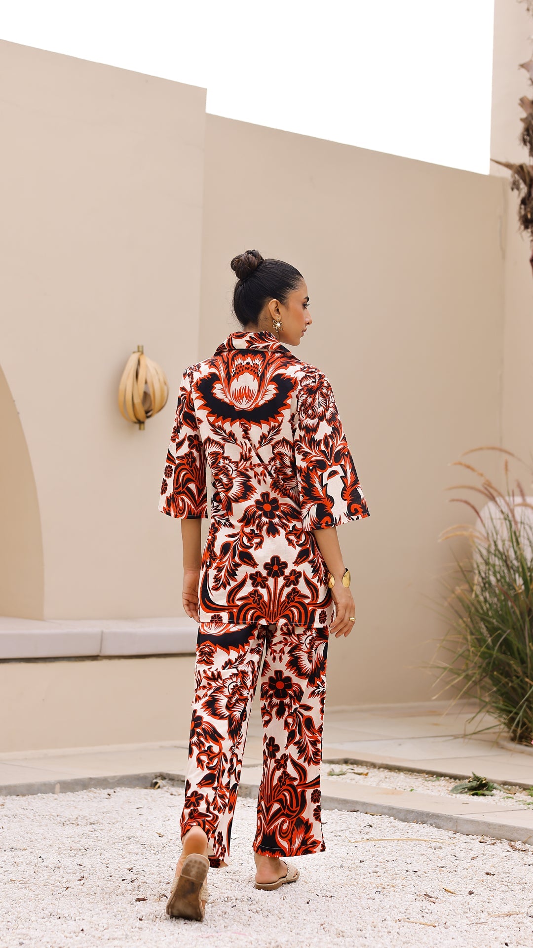 Turn heads with our Red & Black Baroque Co-Ord Set. This dramatic printed ensemble is tailored in soft cotton and features an oversized floral-baroque design on a relaxed-fit shirt and straight pants. A bold yet breathable pick for statement dressing.