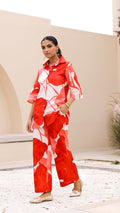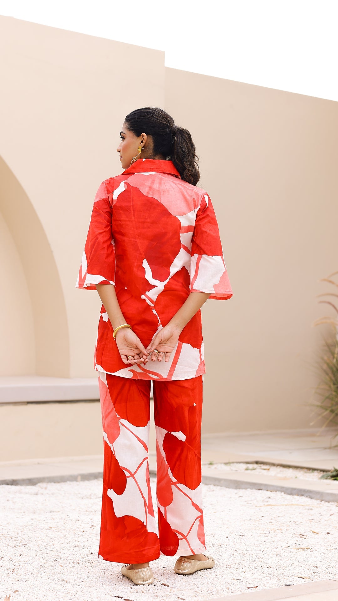 Make a vibrant statement with our Bold Red Petal Co-Ord Set. Designed in breathable cotton, this oversized floral two-piece features vivid red and white petal prints on a collared shirt and relaxed-fit pants. Ideal for resort days, casual brunches, or standout everyday wear.