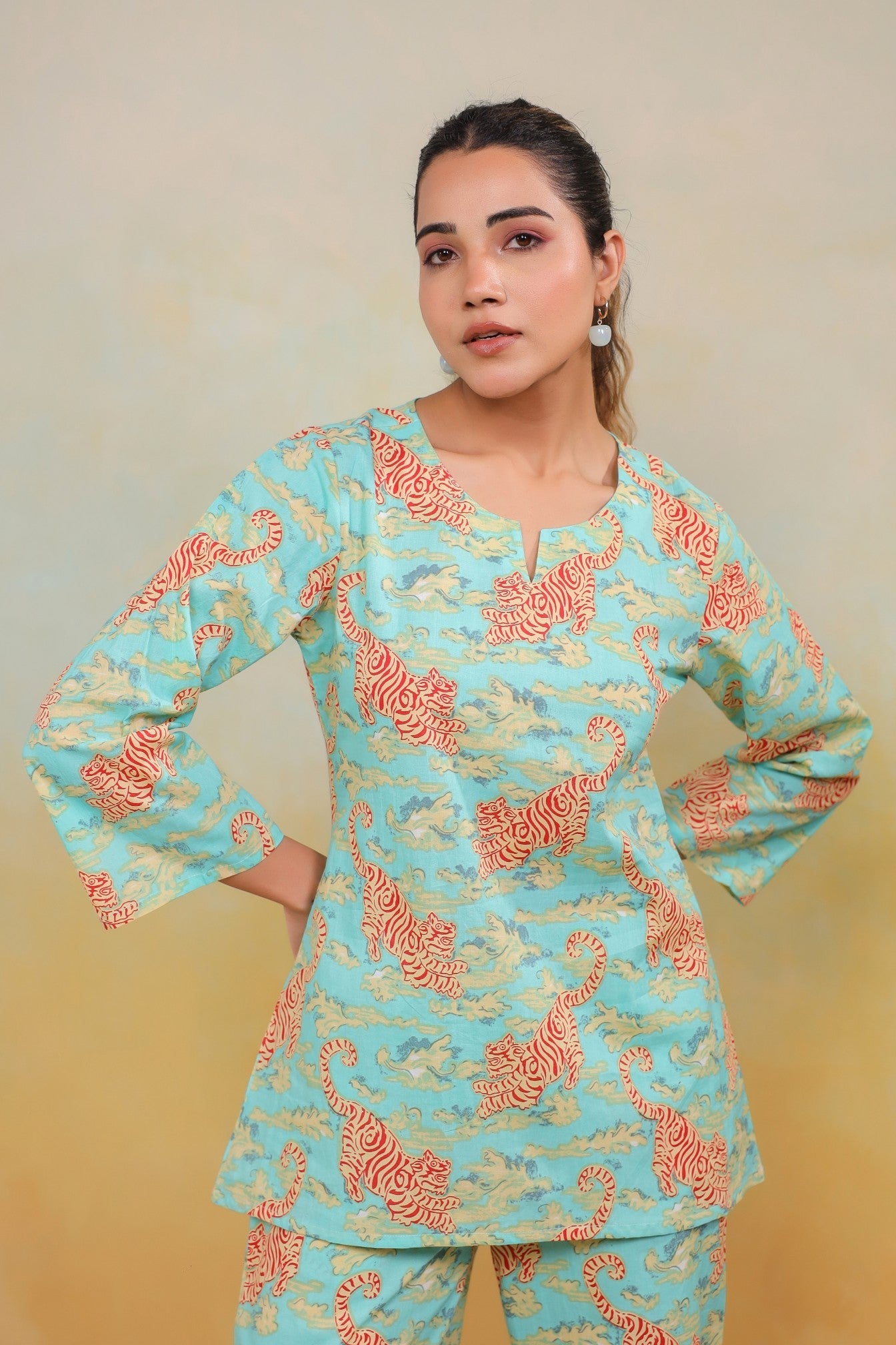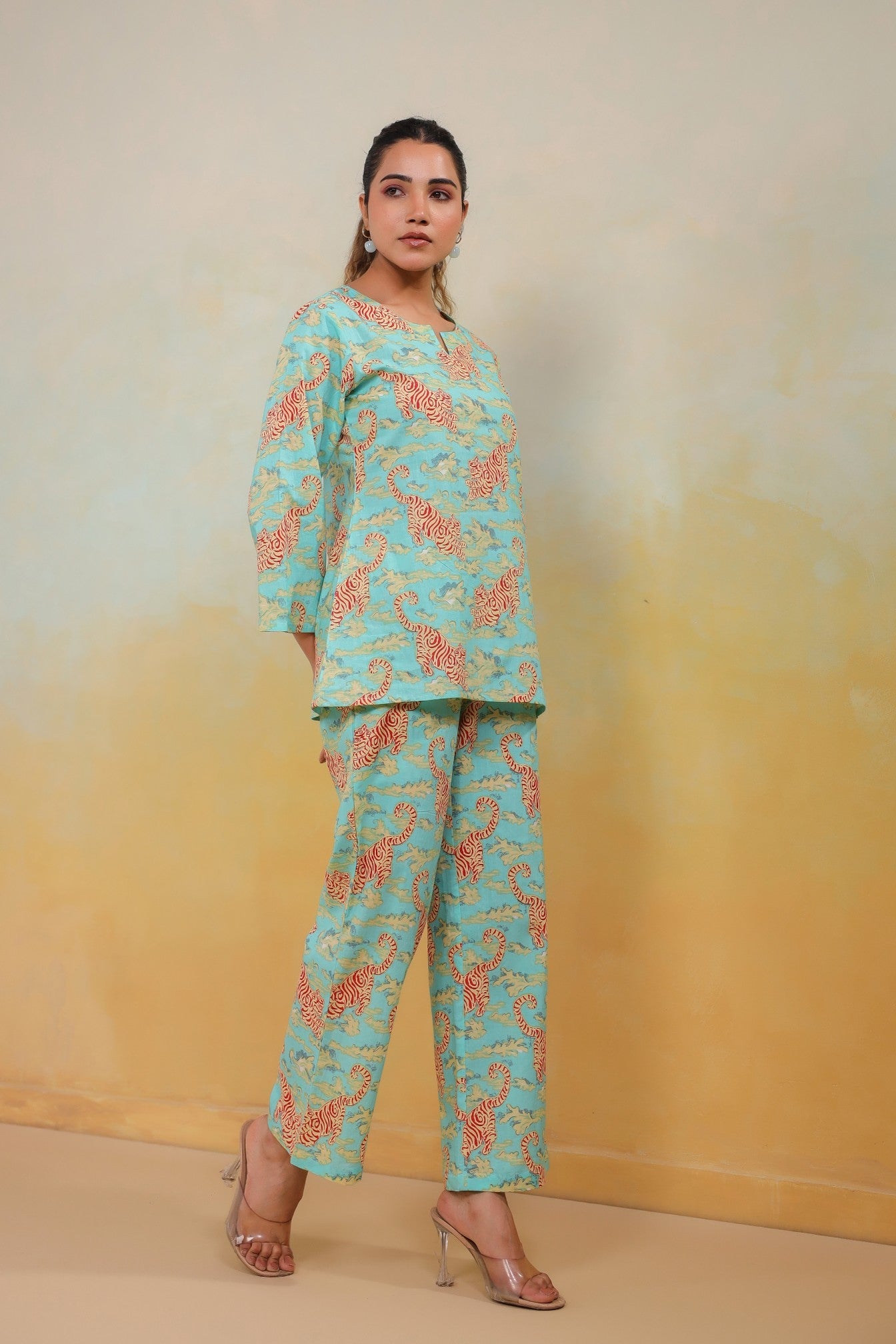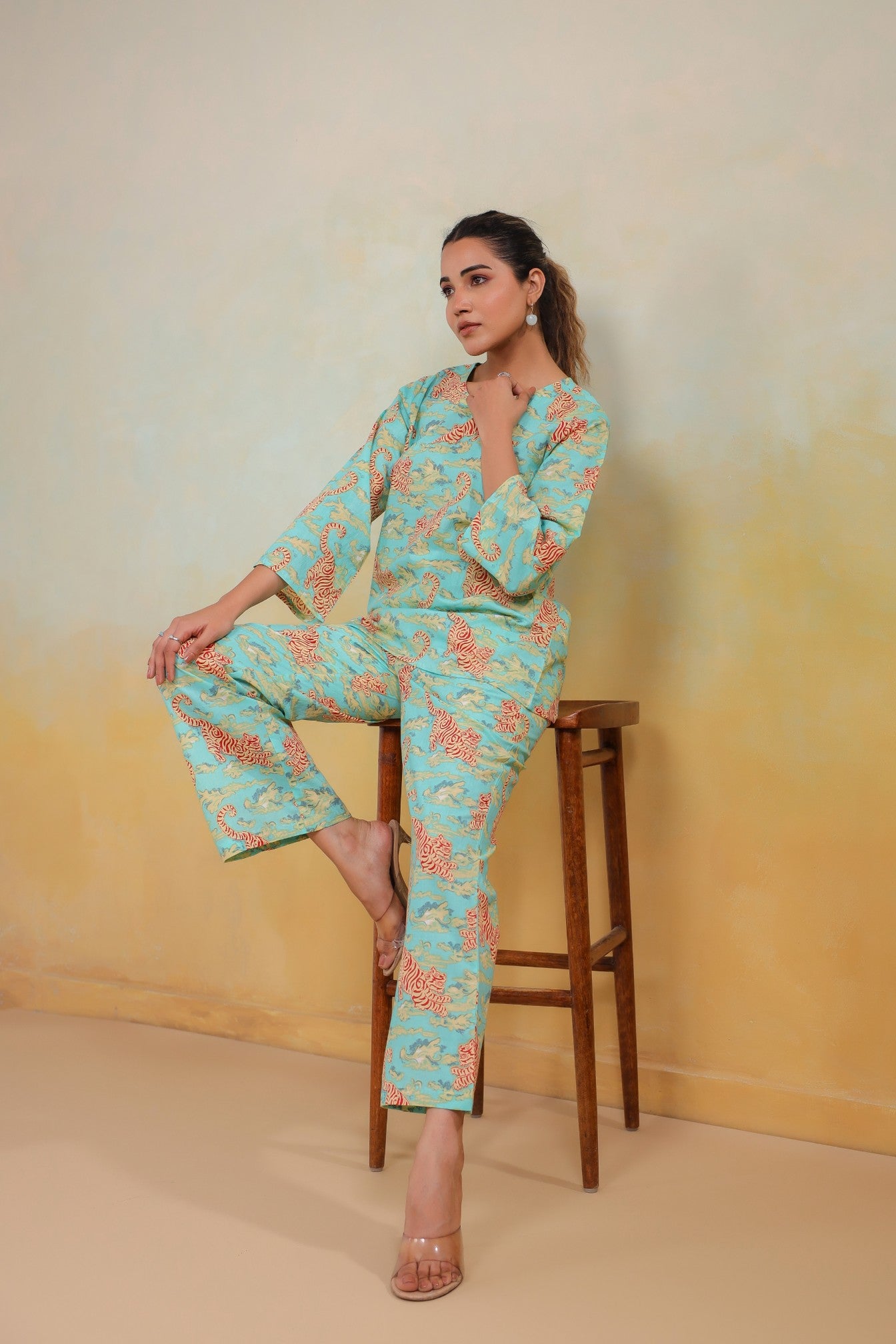 Regal Tiger – Luxe Printed Co-ord Set in Aqua
