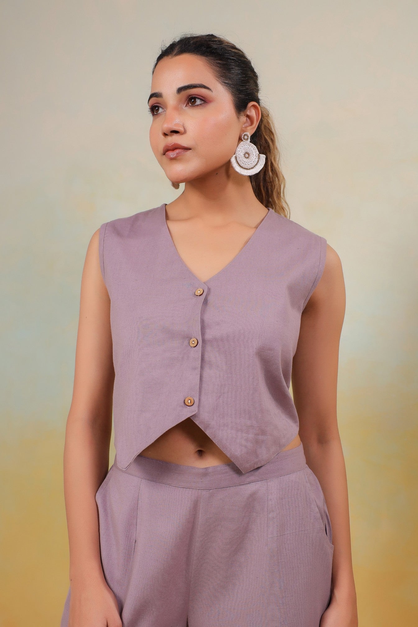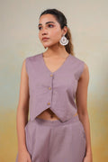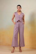 Step into understated luxury with the Serene Elegance Co-Ord Set, designed for the modern muse. This two-piece set features a tailored sleeveless vest with delicate button details, paired seamlessly with relaxed wide-leg pants for a chic yet comfortable silhouette. Rendered in a soothing mauve tone, this ensemble embodies grace and versatility—ideal for brunch dates, travel escapades, or effortless day-to-night transitions.