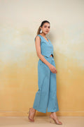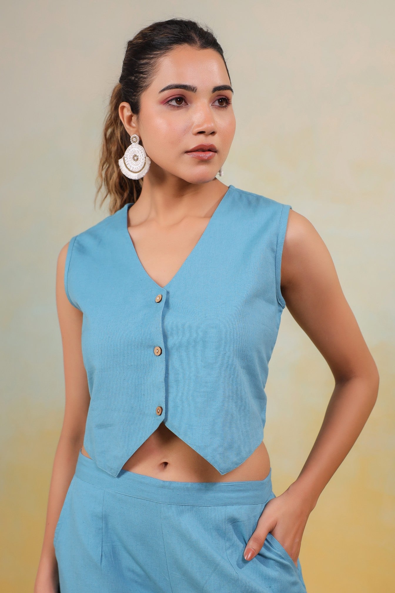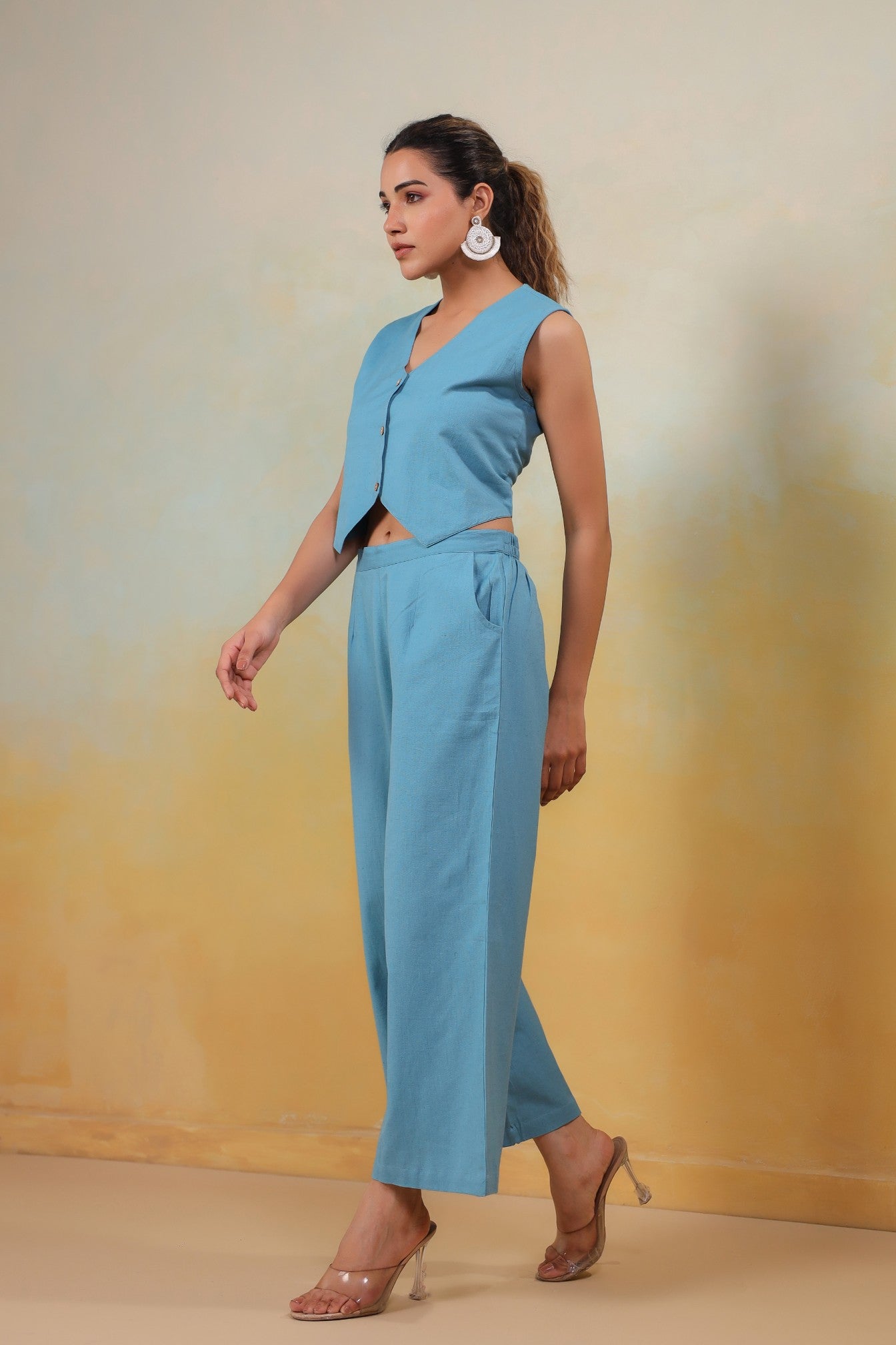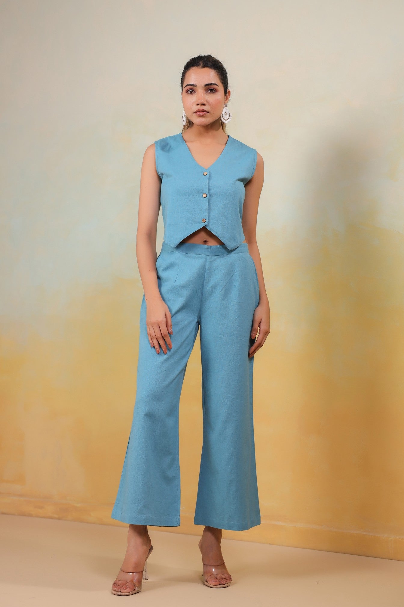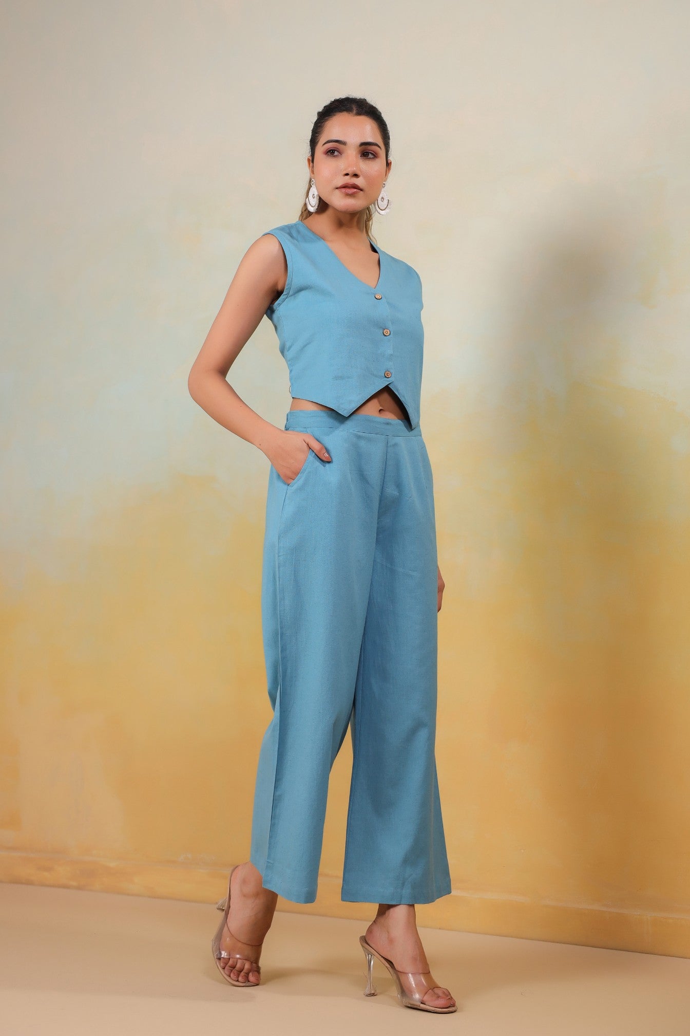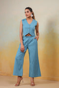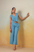 Bask in the serene beauty of the Azure Grace Co-Ord Set—a perfect harmony of refinement and comfort. Crafted from breathable Cotton in a refreshing sky blue hue, this ensemble features a structured sleeveless vest with delicate button accents and flowy wide-leg pants that flatter every movement. Designed for versatility, it’s a must-have for leisurely brunches, summer soirées, or polished everyday elegance.
