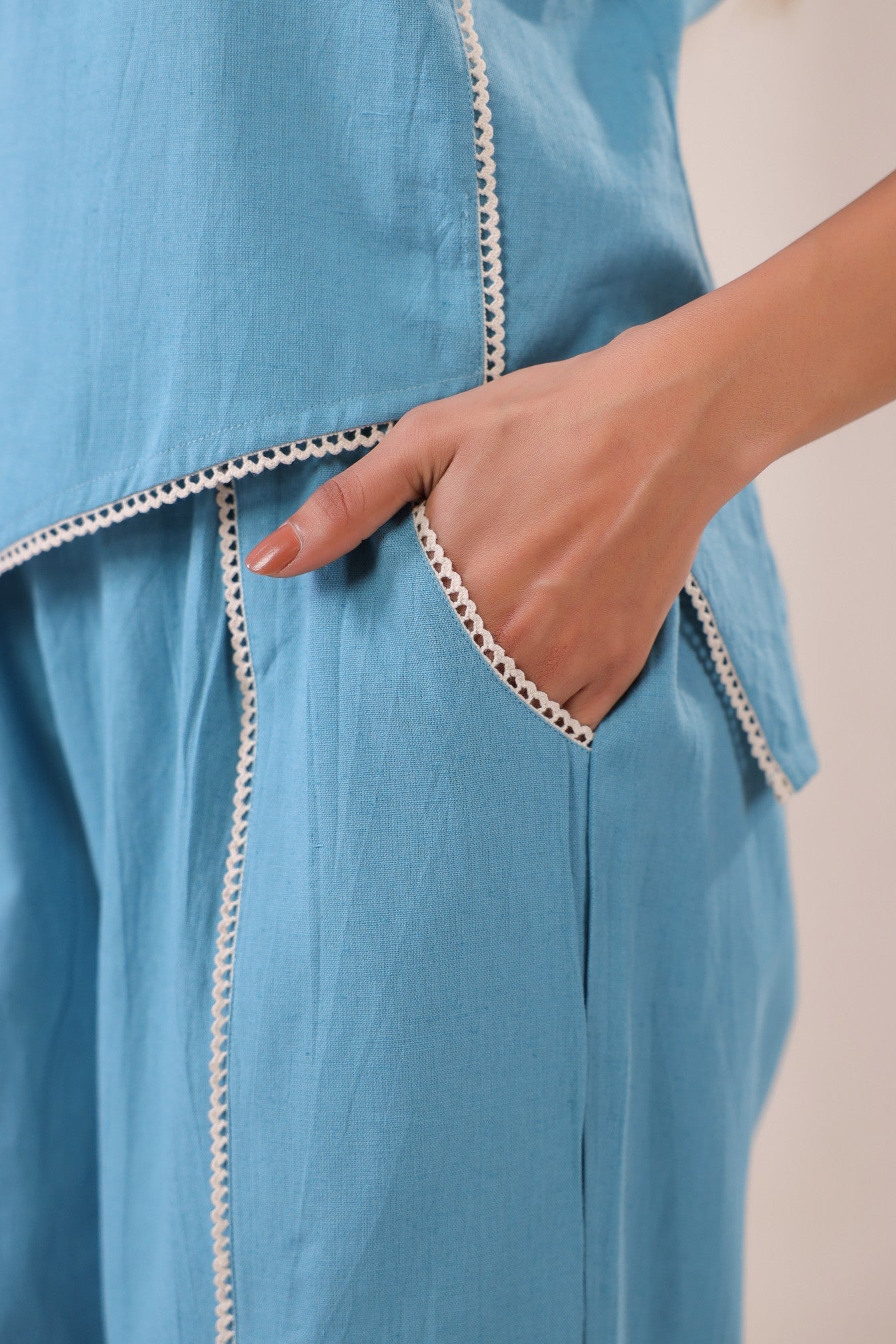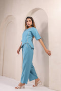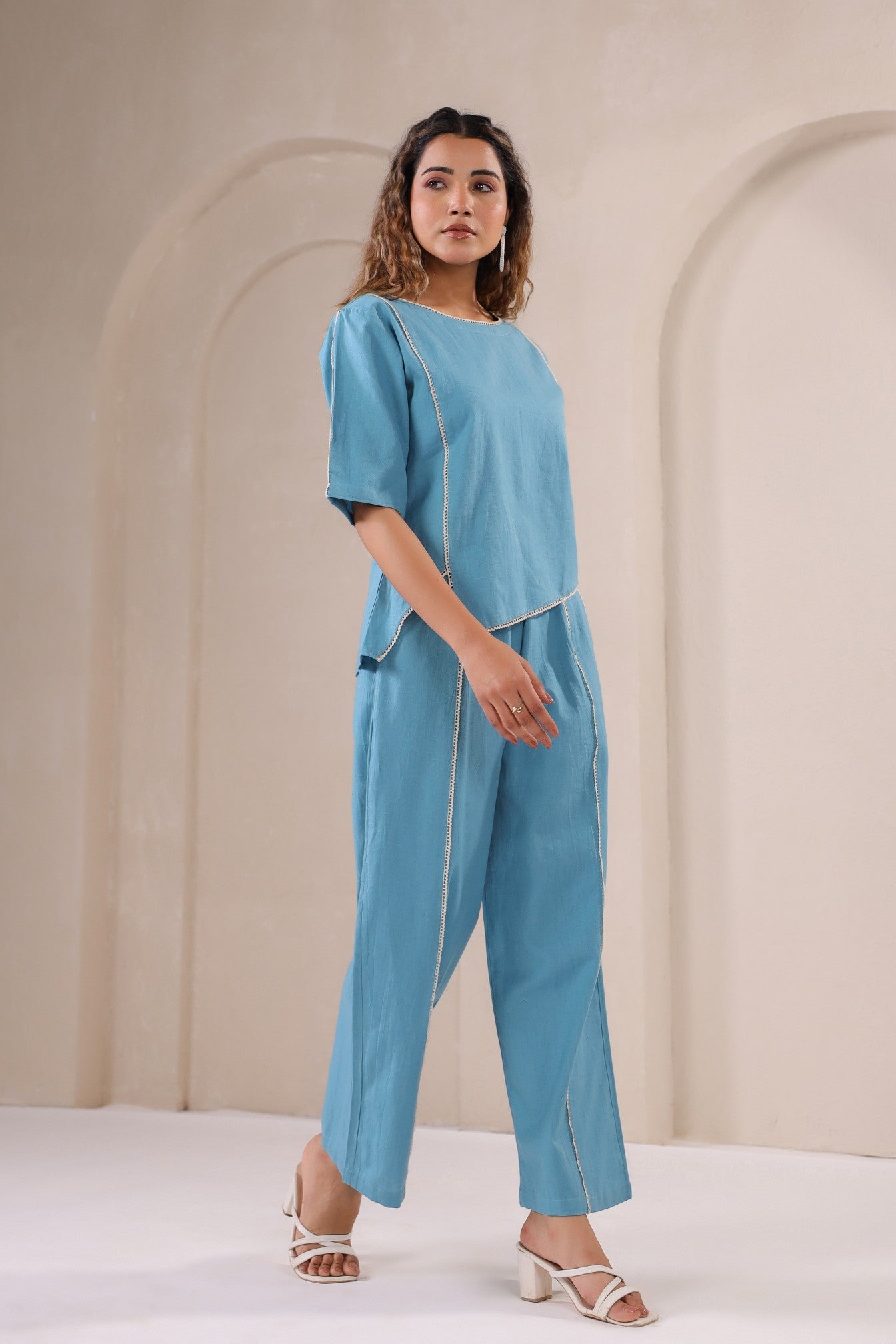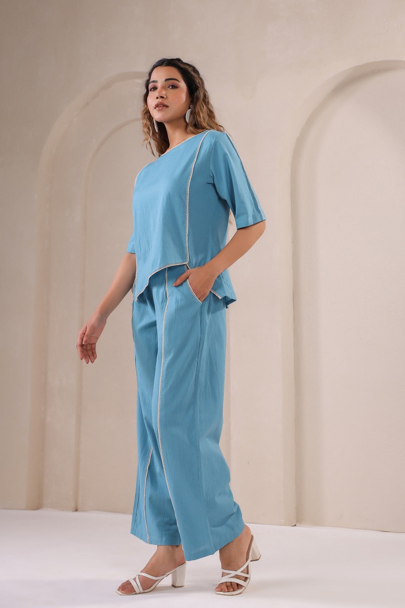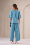 Embrace understated luxury with the Serene Azure Co-Ord Set, a graceful expression of modern elegance. Crafted in a soothing blue hue, this set features an asymmetrical top with subtle stitch detailing that adds a touch of artisanal charm. Paired with relaxed straight-leg pants, this ensemble effortlessly balances structure and fluidity, making it perfect for both casual sophistication and elevated styling.