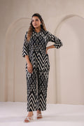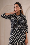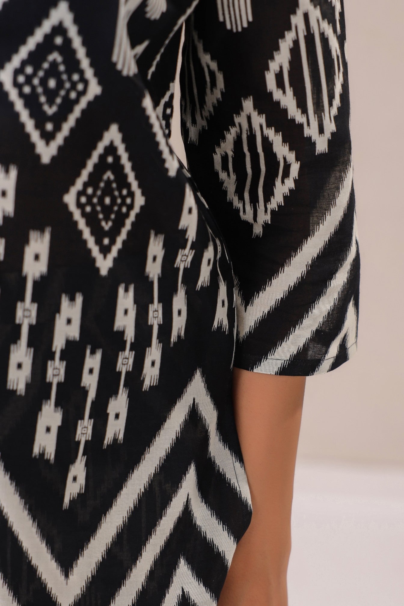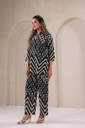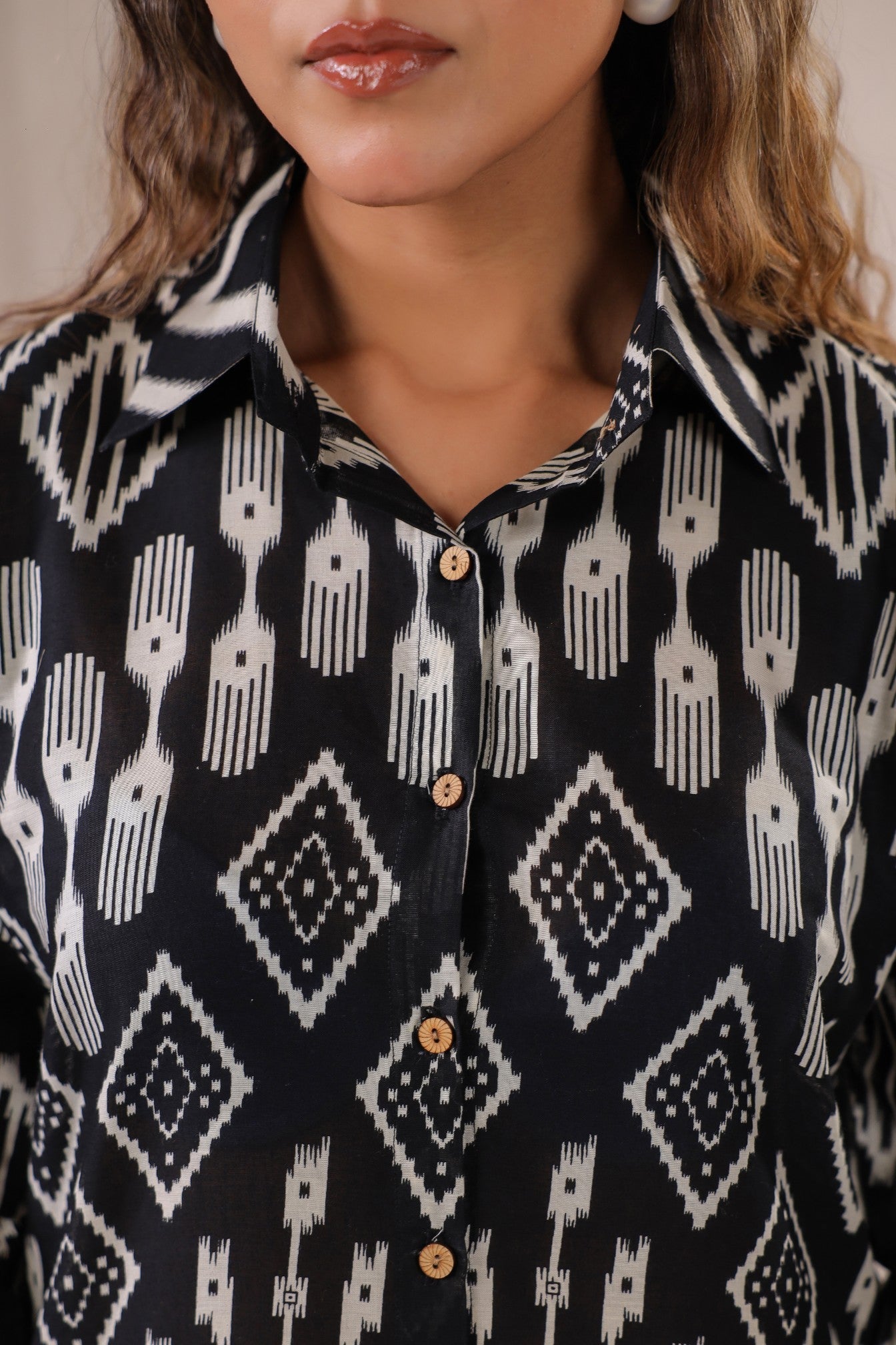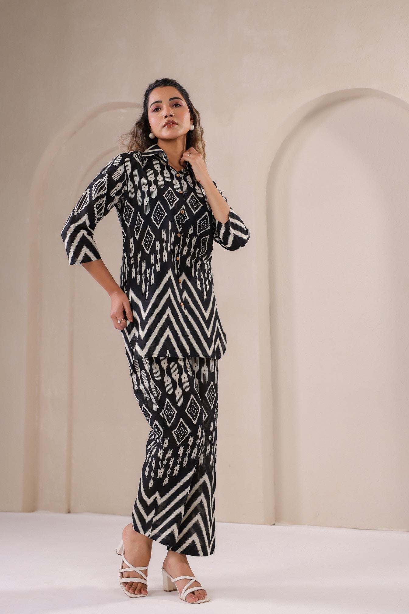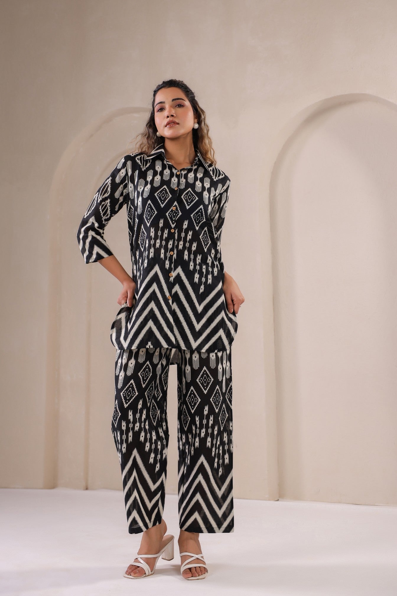Channel effortless sophistication with the Timeless Ikat Co-Ord Set, a bold yet elegant statement piece. Crafted from premium fabric adorned with a striking black-and-white Ikat pattern, this ensemble blends heritage artistry with modern silhouettes. The collared button-down tunic adds structure, while the relaxed straight-leg pants ensure ease of movement, making this a versatile staple for any wardrobe.