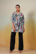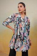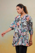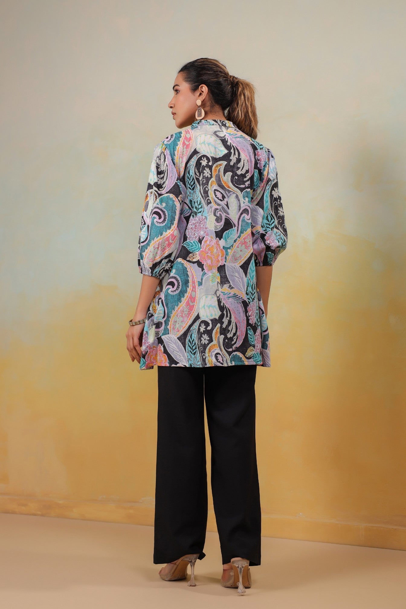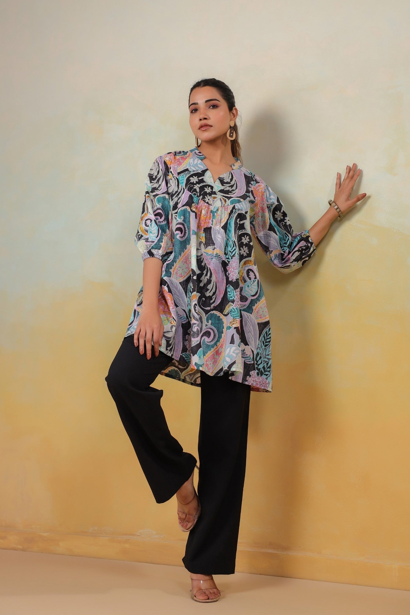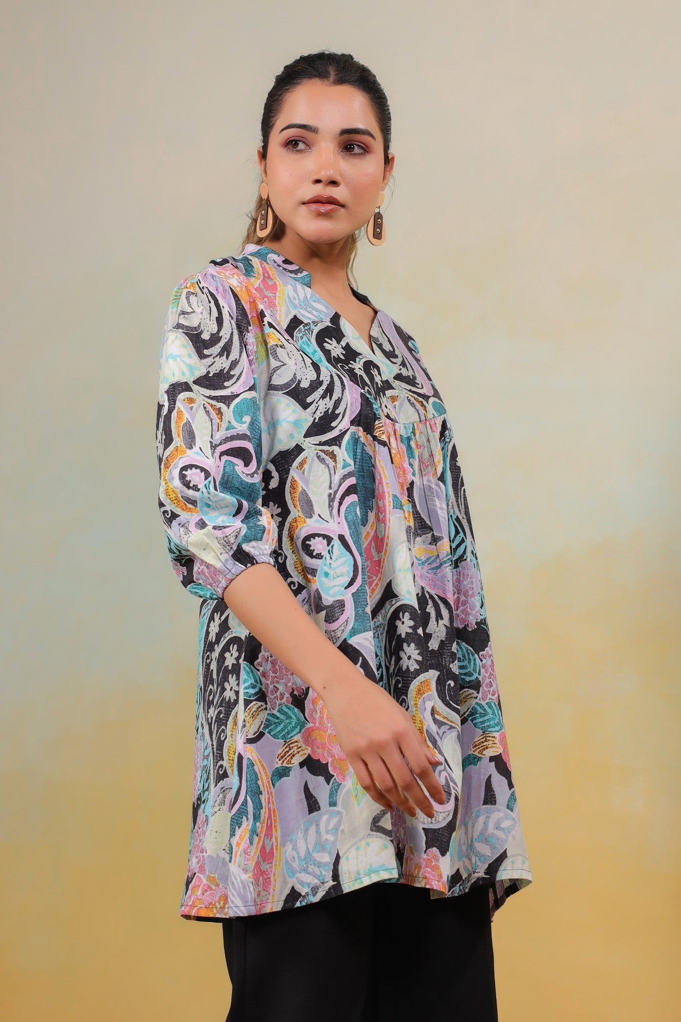 Step into a world of artistic elegance with the Enchanted Bloom Tunic, where intricate florals meet fluid silhouettes. This beautifully designed tunic features a vivid play of pastel hues over a rich black base, exuding an air of sophistication. The relaxed fit, gathered yoke, and subtle V-neckline make it a versatile piece that flatters all body types. Perfect for a day out or an intimate evening affair, this tunic ensures effortless charm and comfort.