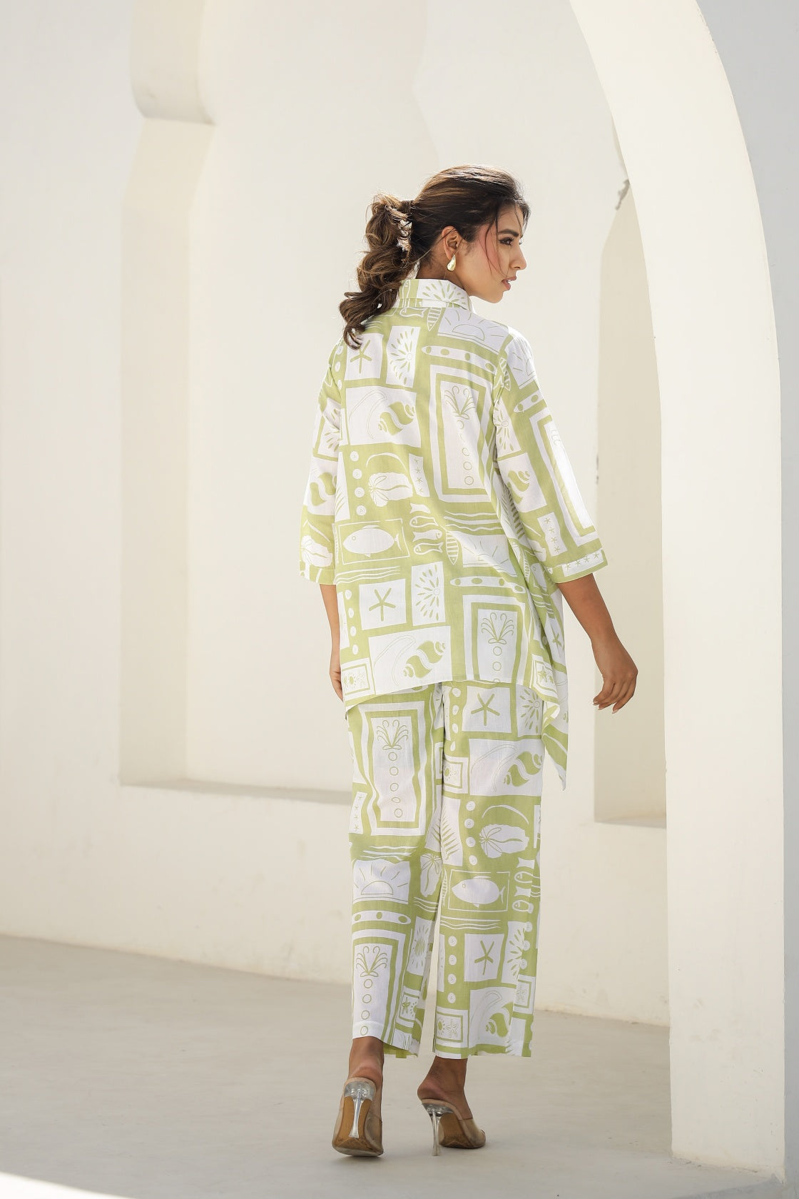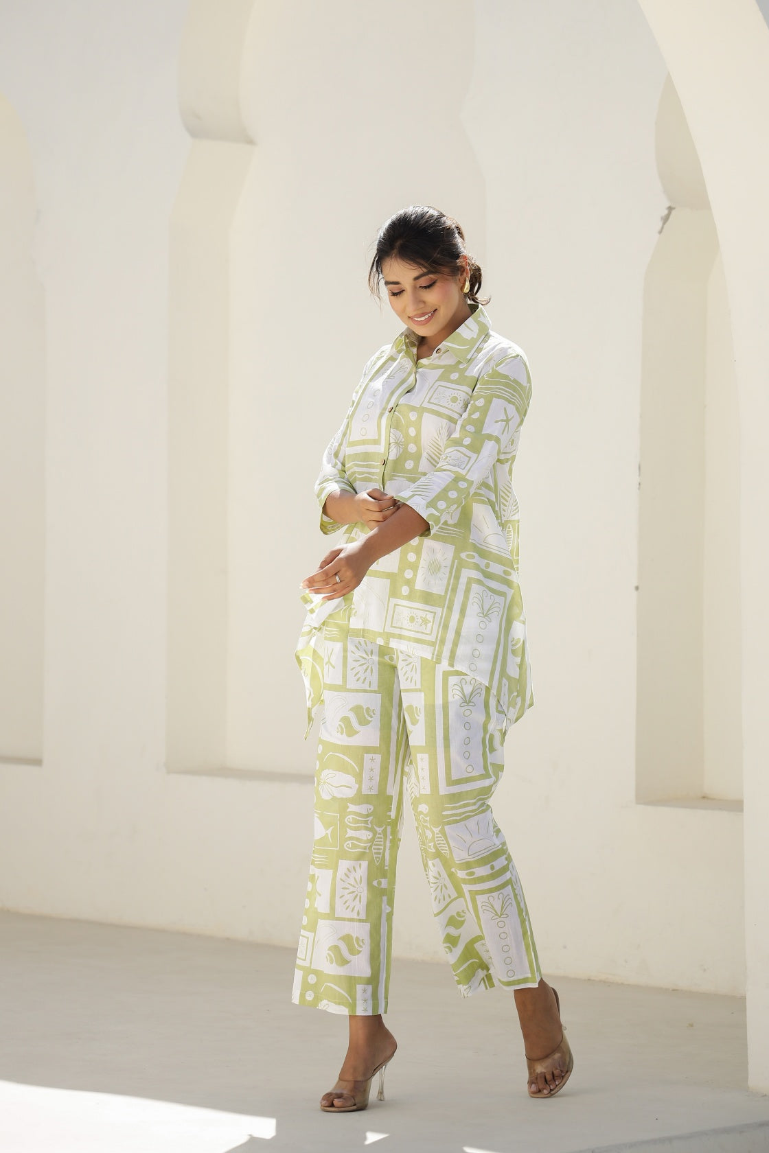 Step up your fashion game with this Abstract Print Co-Ord Set, featuring a relaxed-fit button-down shirt and flared pants. The soft cotton fabric ensures breathability and comfort, making it an ideal choice for both casual and semi-formal occasions. With its contemporary print and structured silhouette, this outfit exudes modern elegance and effortless style.