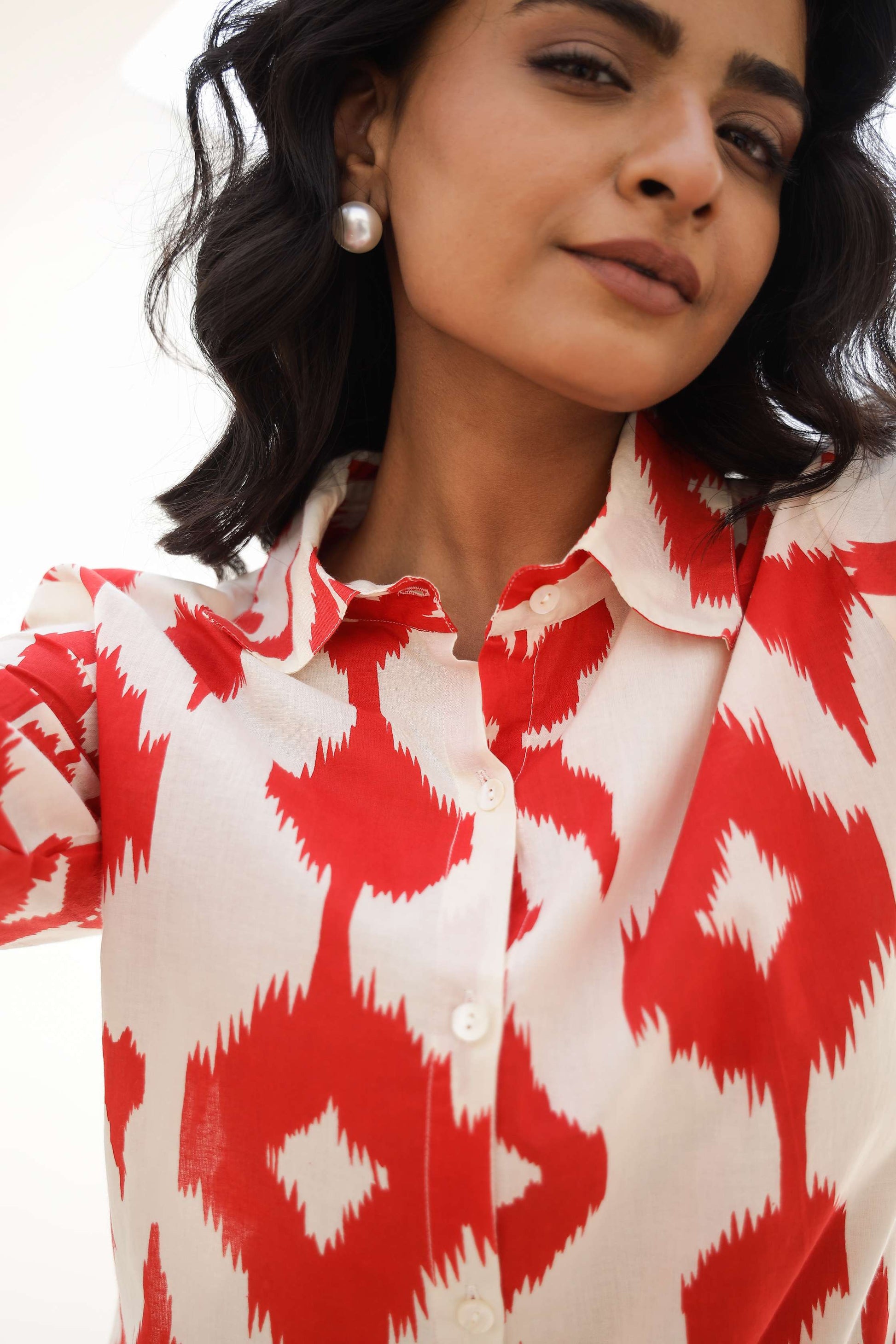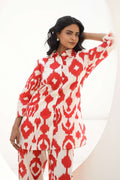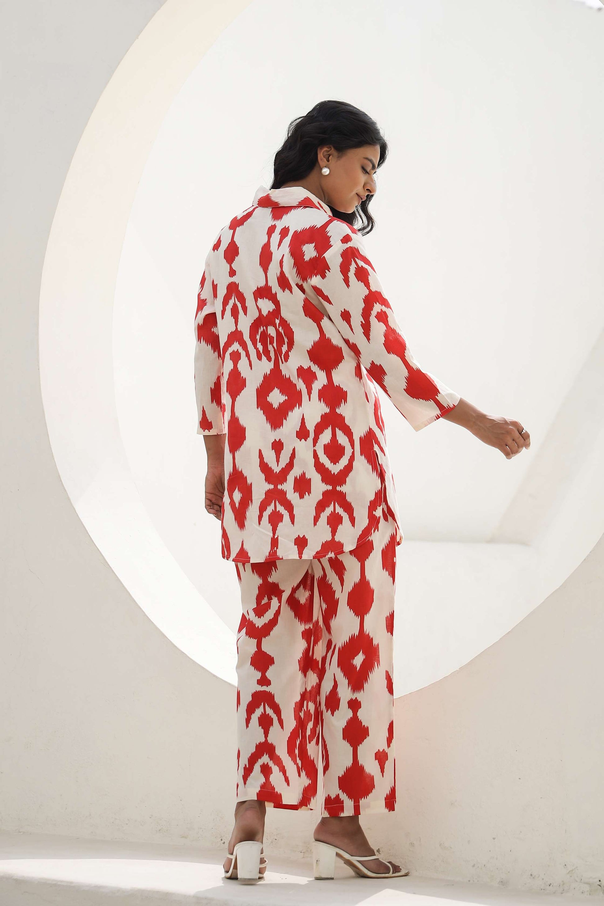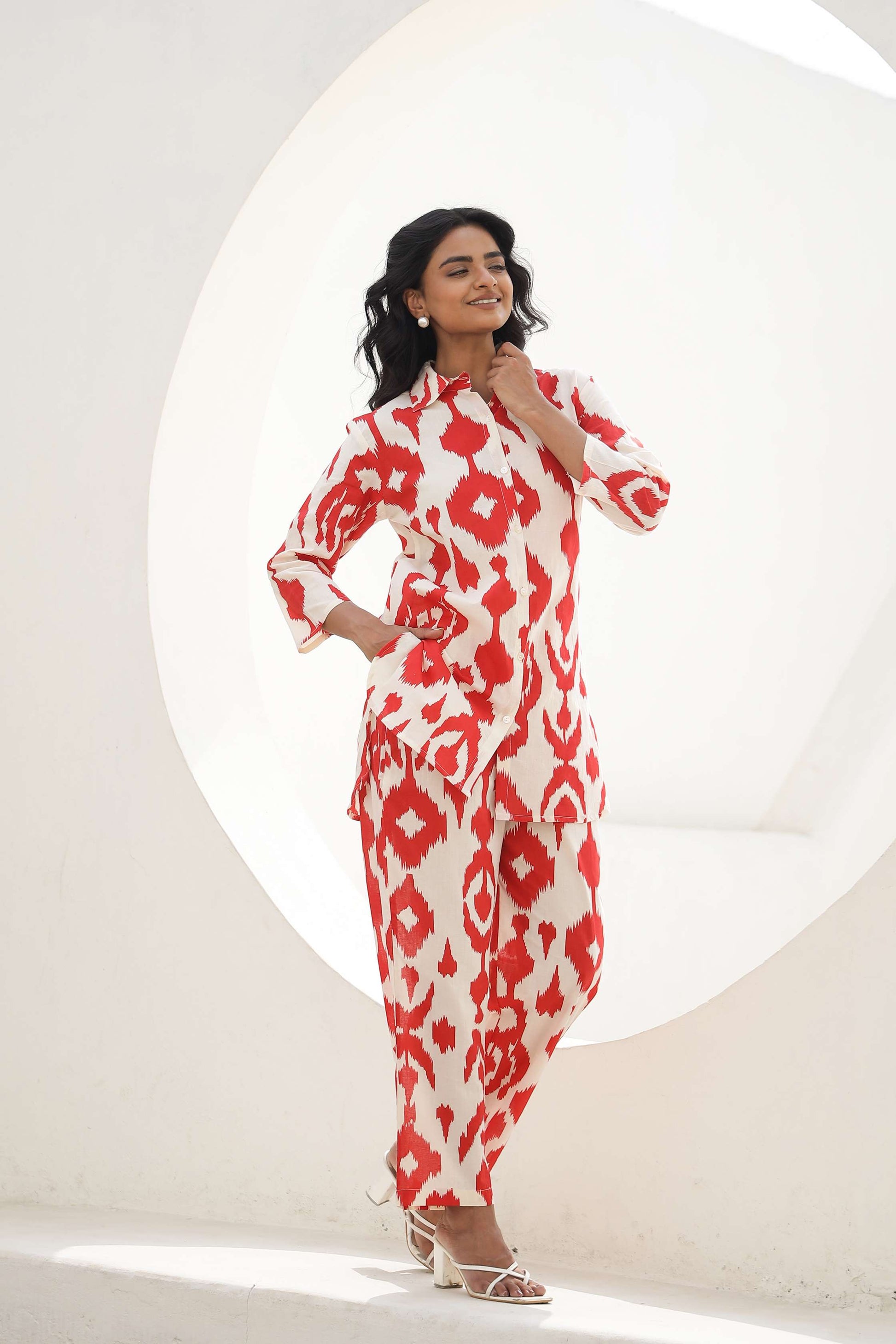 Bold, chic, and effortlessly stylish, the Red Ikat Print Co-Ord Set is a modern wardrobe essential. Crafted from soft and breathable cotton, this co-ord features a striking red Ikat-inspired print on a crisp white base, blending traditional design with contemporary flair.