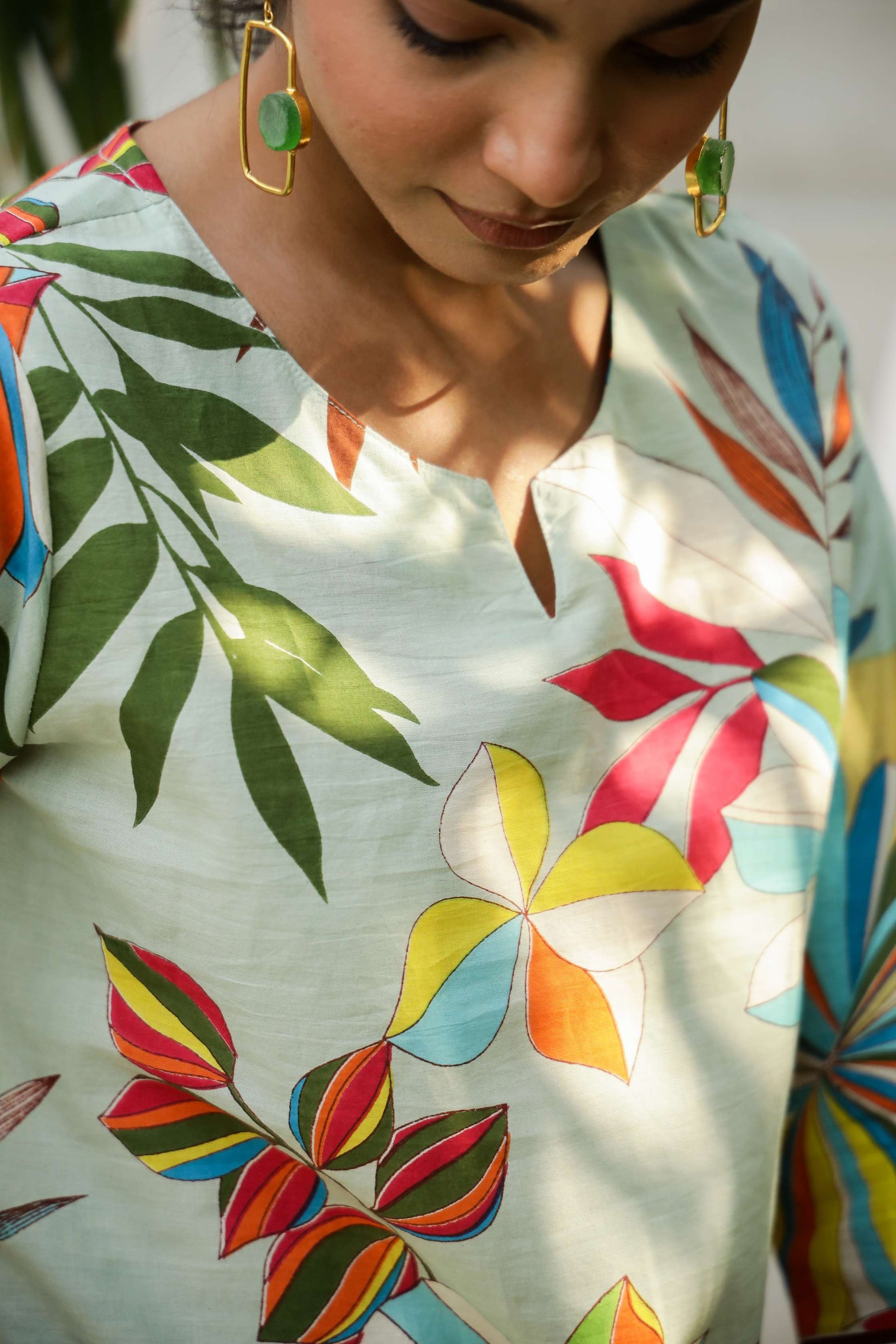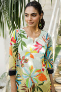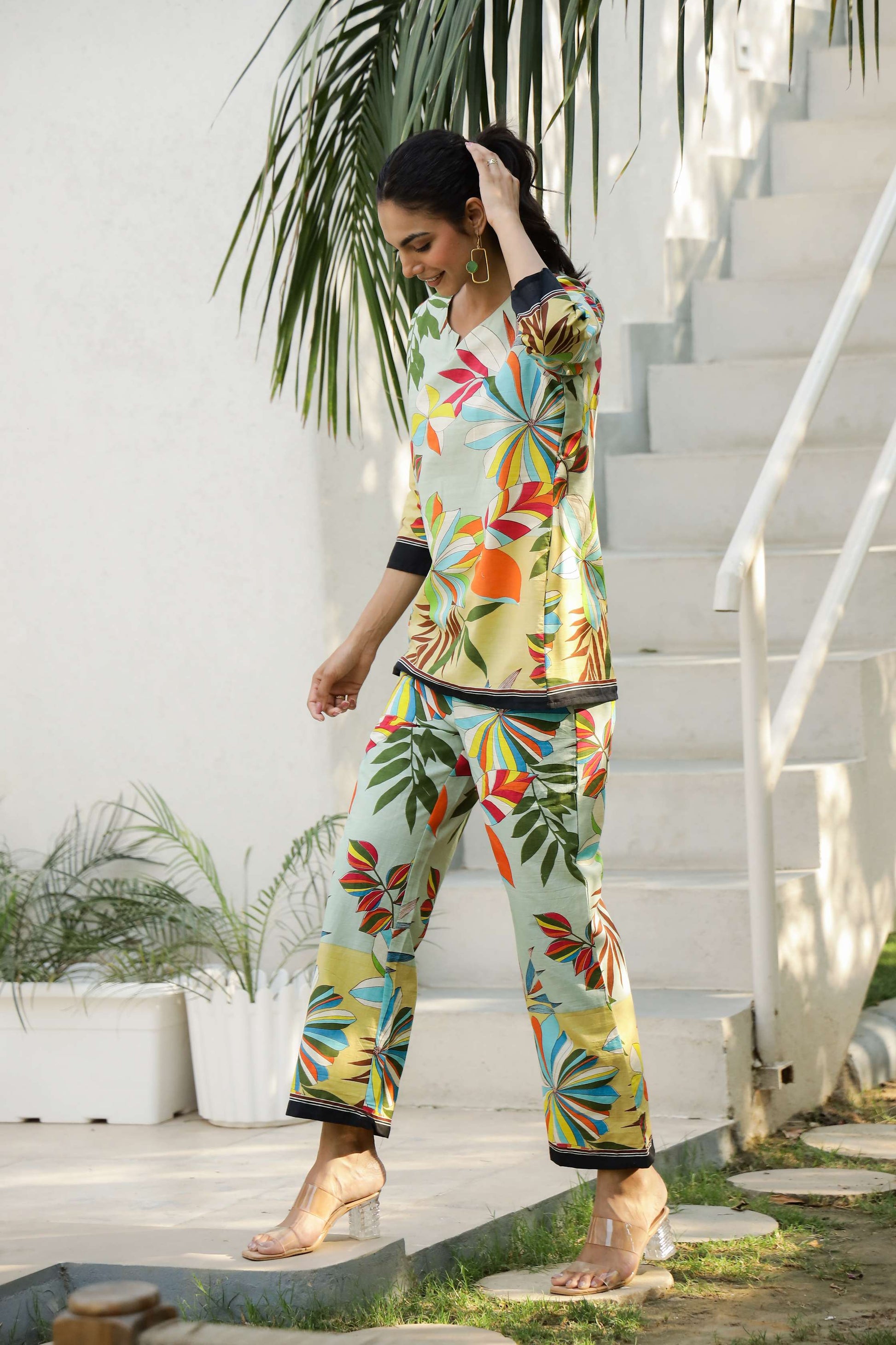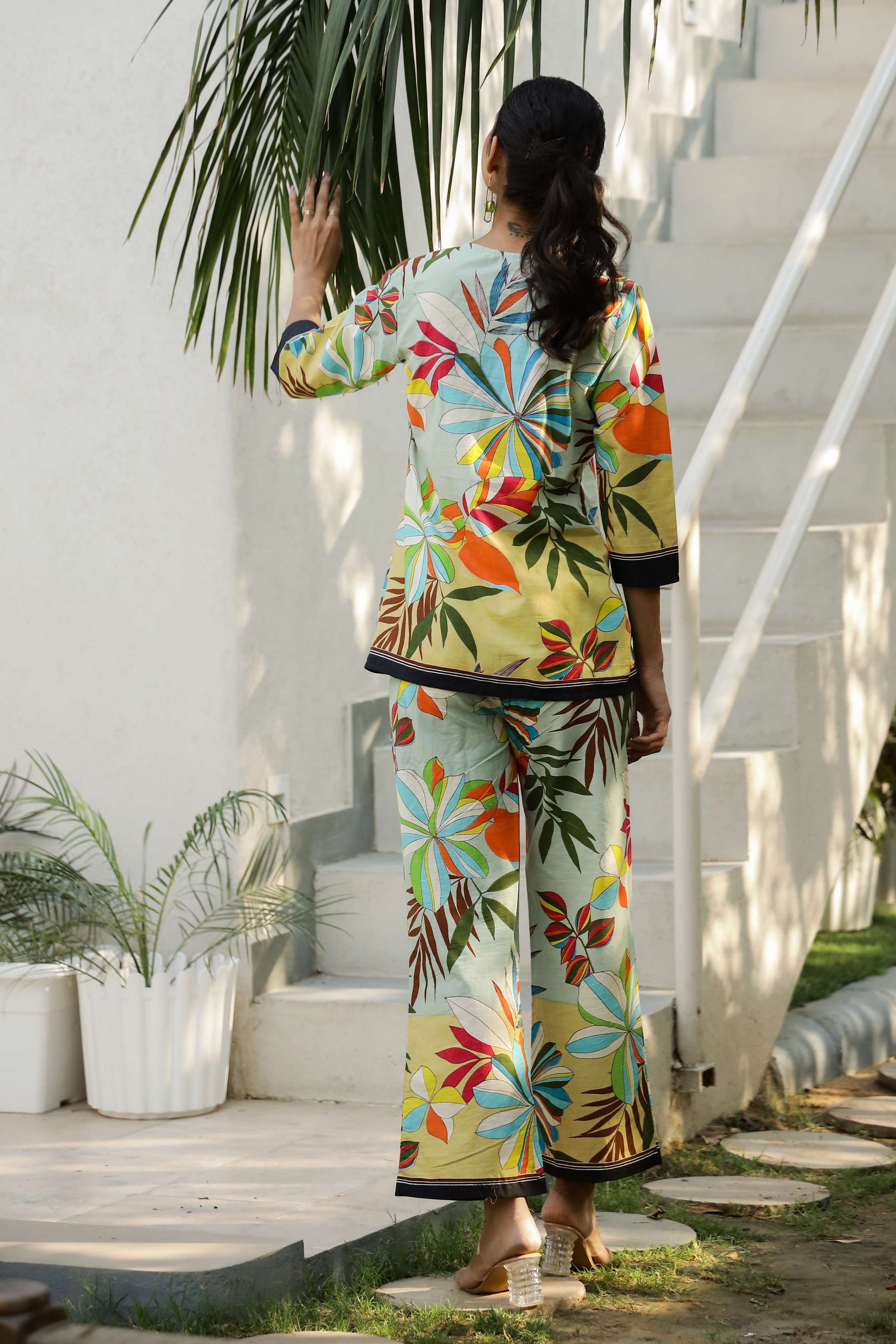 Turn up the color this season with our Multicolor Tropical Floral Co-Ord Set! Featuring a bold medley of vibrant tropical flowers and leaves on a soothing pastel base, this two-piece cotton set is a burst of joy. The kurta has a relaxed, straight silhouette with contrast black piping at the sleeves and hem for a pop of edge. The pants echo the same playful energy — wide-leg and ultra-comfy.