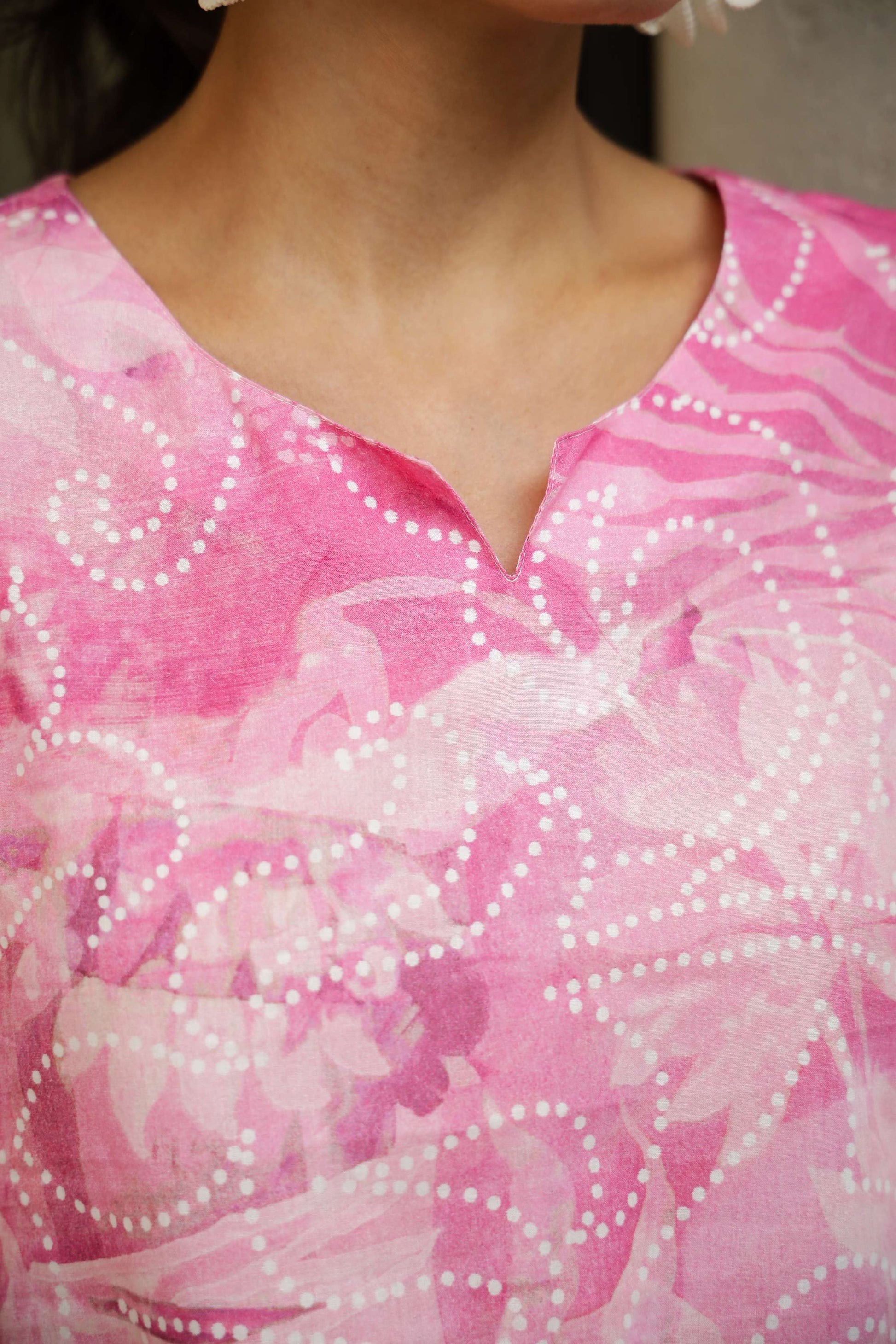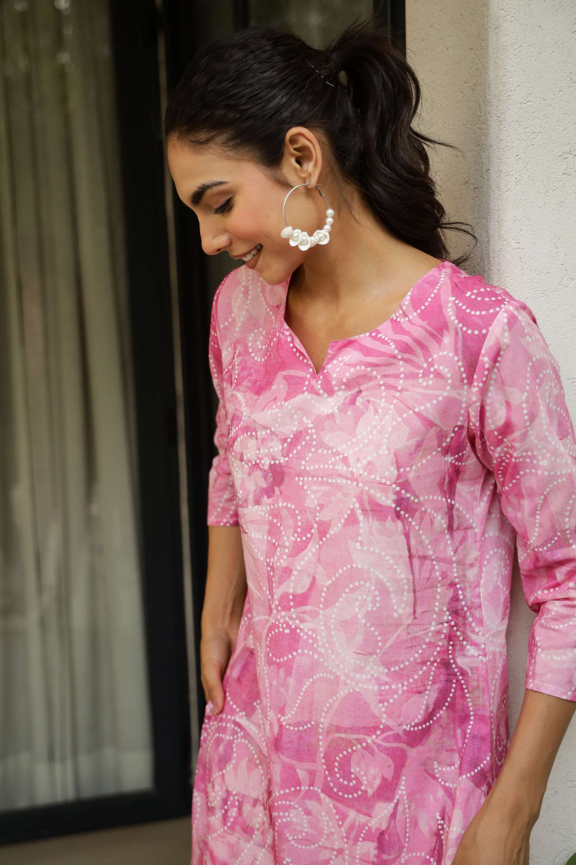 Add a dash of dreamy pink to your wardrobe with our Pink Swirl Print Cotton Co-Ord Set. With an abstract swirl pattern in white on a pink watercolor-inspired base, this co-ord is both delicate and bold. The straight-cut kurta features a clean neckline with a subtle V-slit, while the slim-fit pants complement the look with a tailored yet comfy vibe.