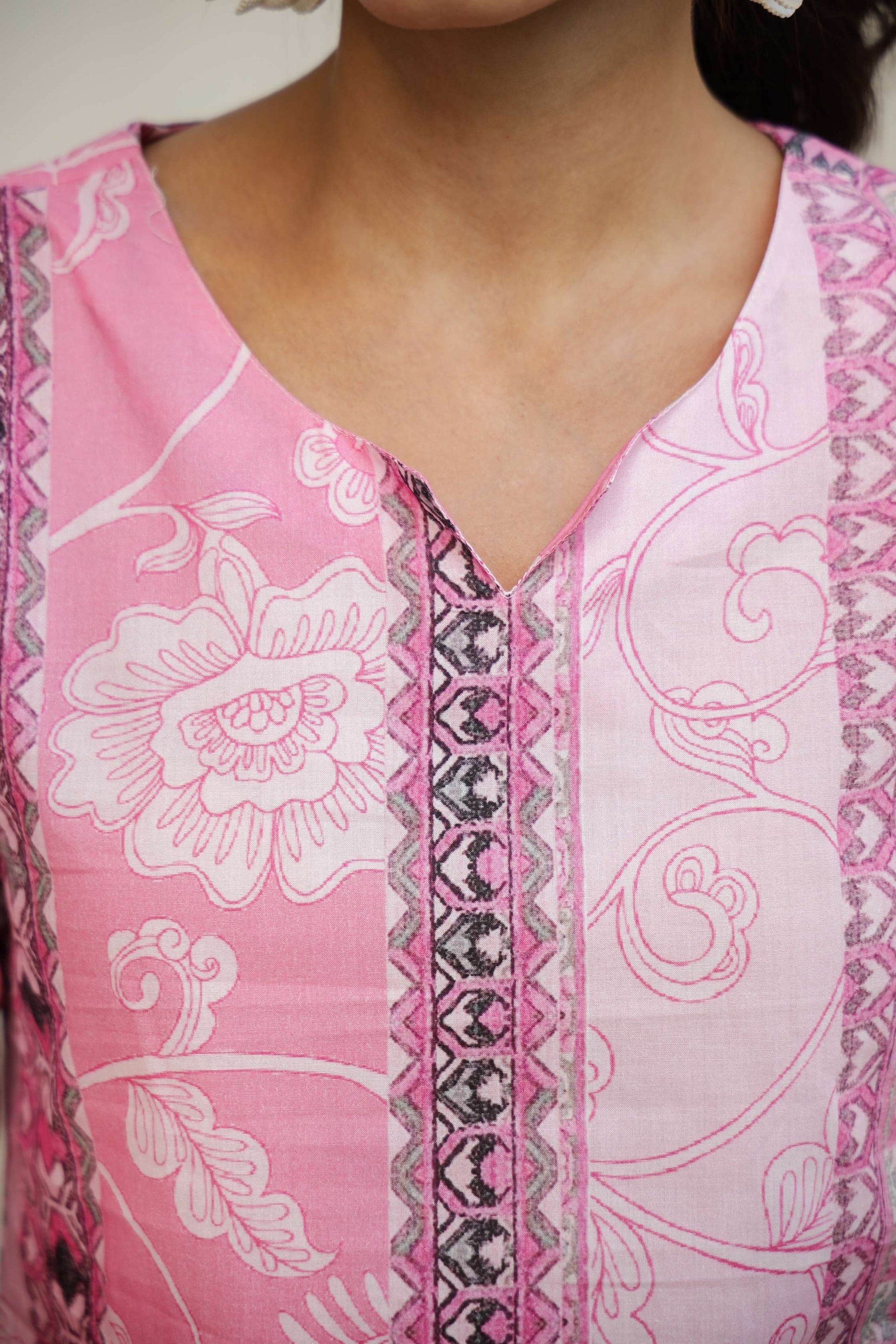 Level up your everyday wardrobe with this Pink Printed Co-Ord Set by Label Flavia – a trendy and comfortable outfit designed for the modern Indian woman. This effortlessly stylish set features a straight-cut top with 3/4th sleeves and matching tapered pants, both showcasing an intricate vertical print in soothing pink tones with hints of black and white.